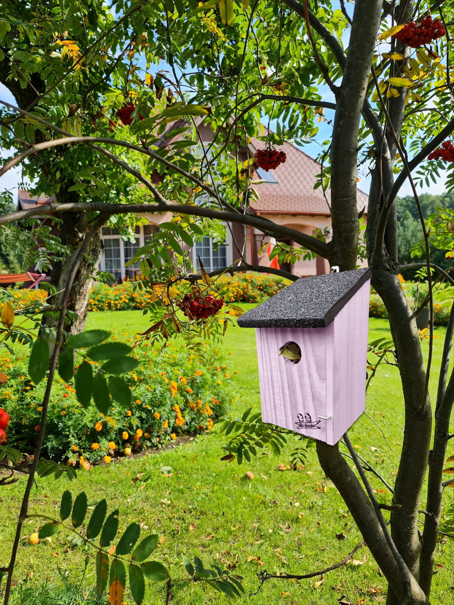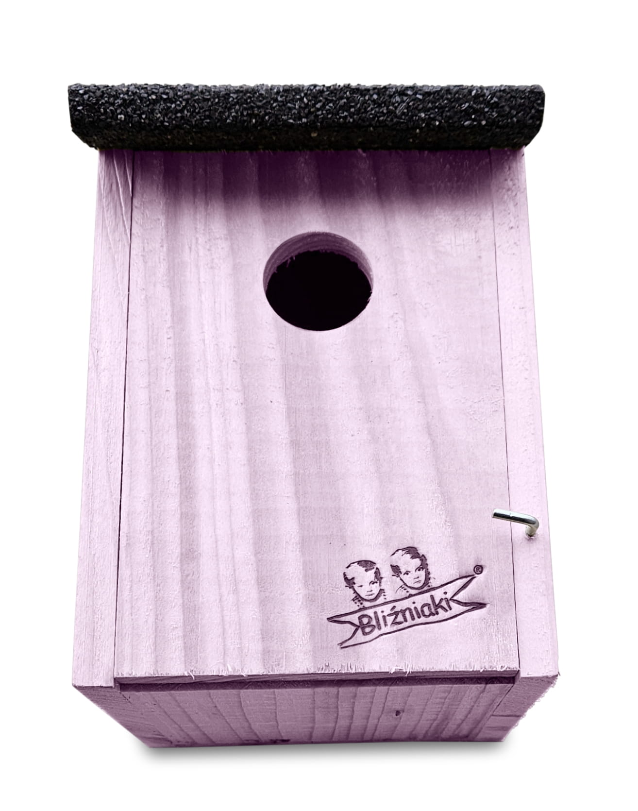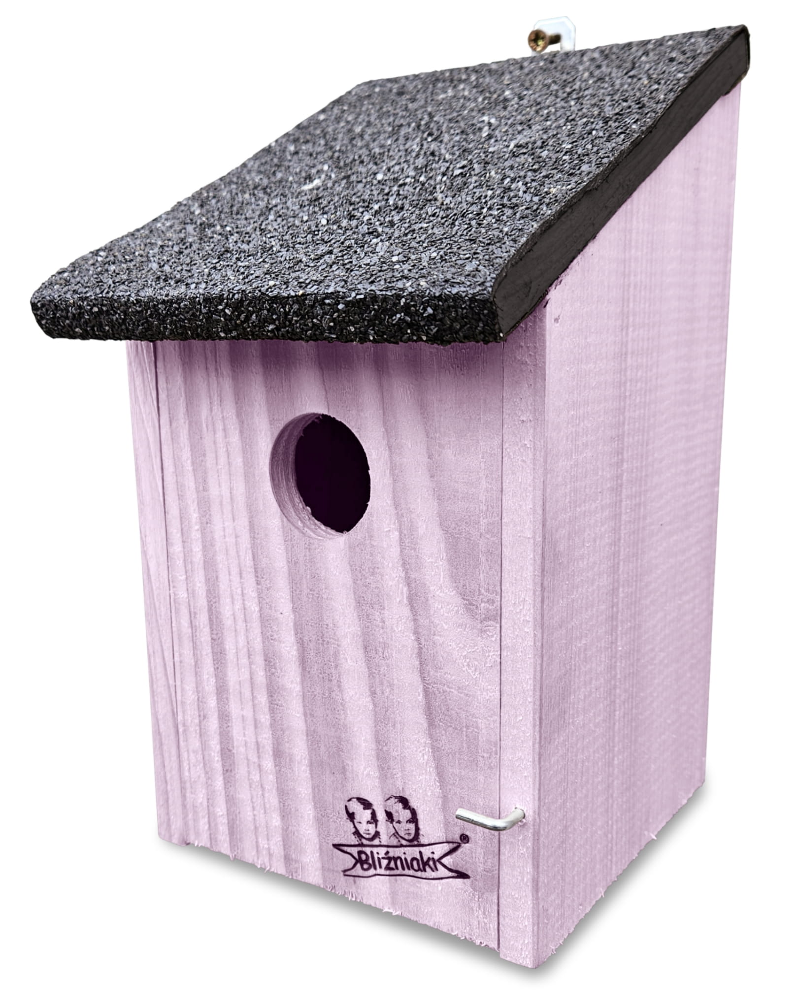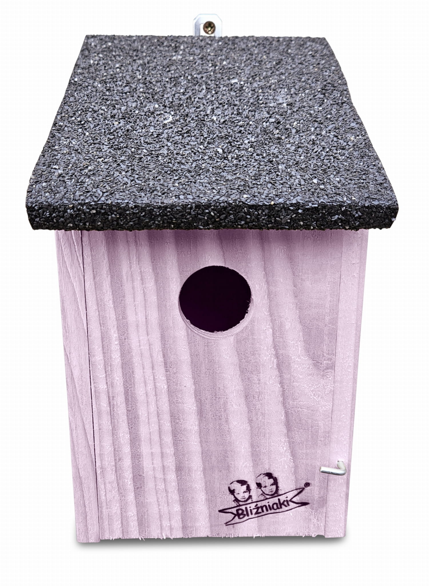 W przeważającej części skrzynka lęgowa jest w kolorze PASTELOWYM FIOLETOWYM, dach pokryty jest PAPĄ BITUMICZNĄ w kolorze CZARNYM.