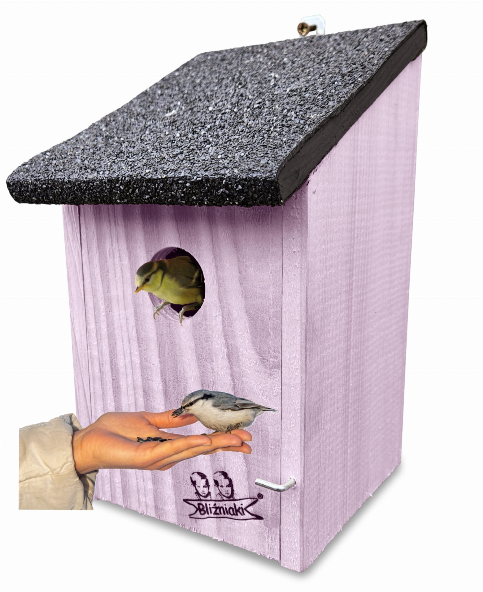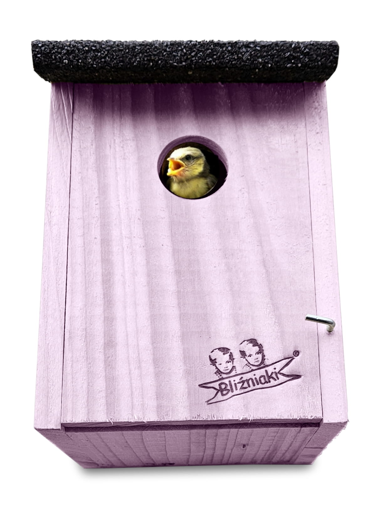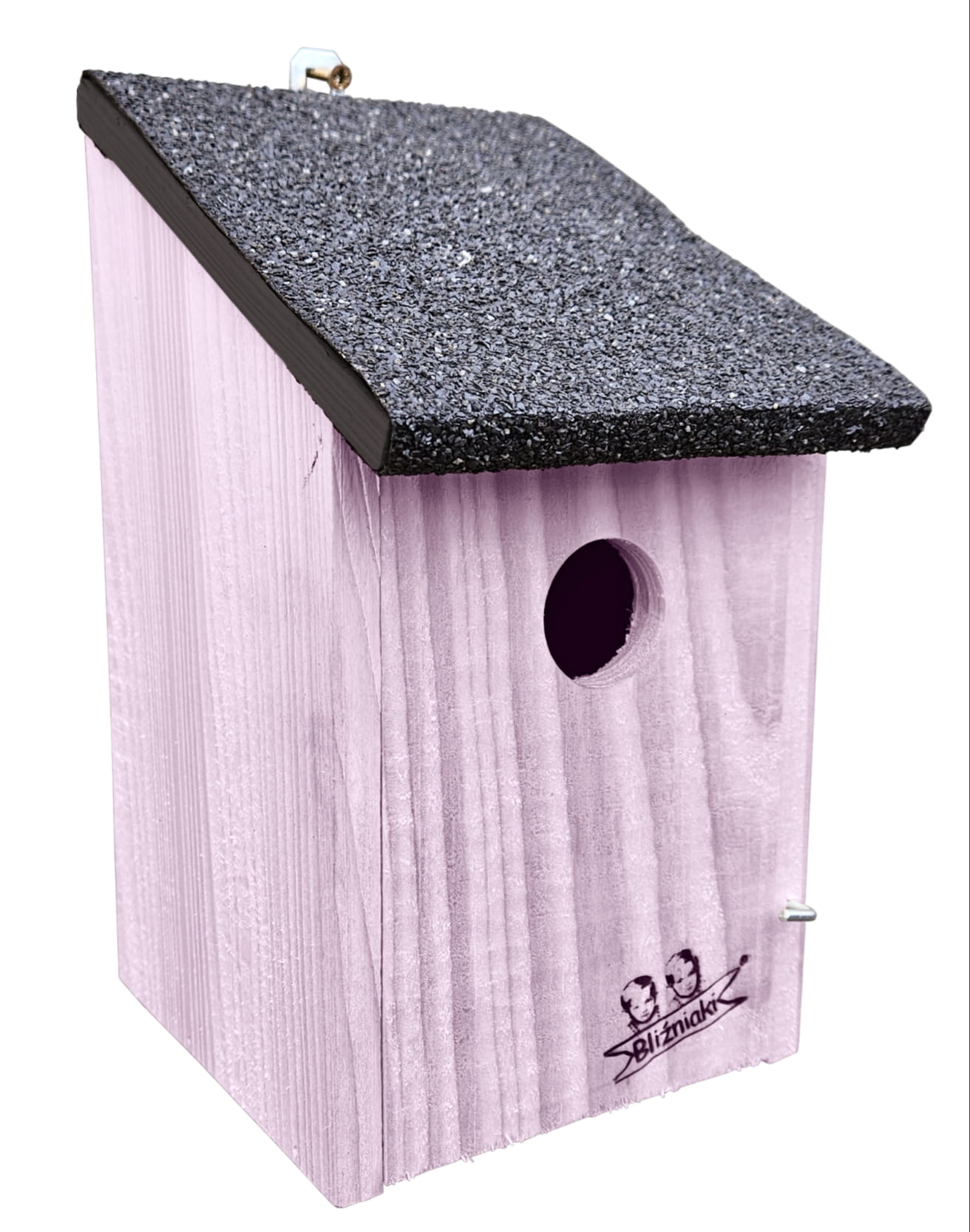 W przeważającej części skrzynka lęgowa jest w kolorze PASTELOWYM FIOLETOWYM, dach pokryty jest PAPĄ BITUMICZNĄ w kolorze CZARNYM.