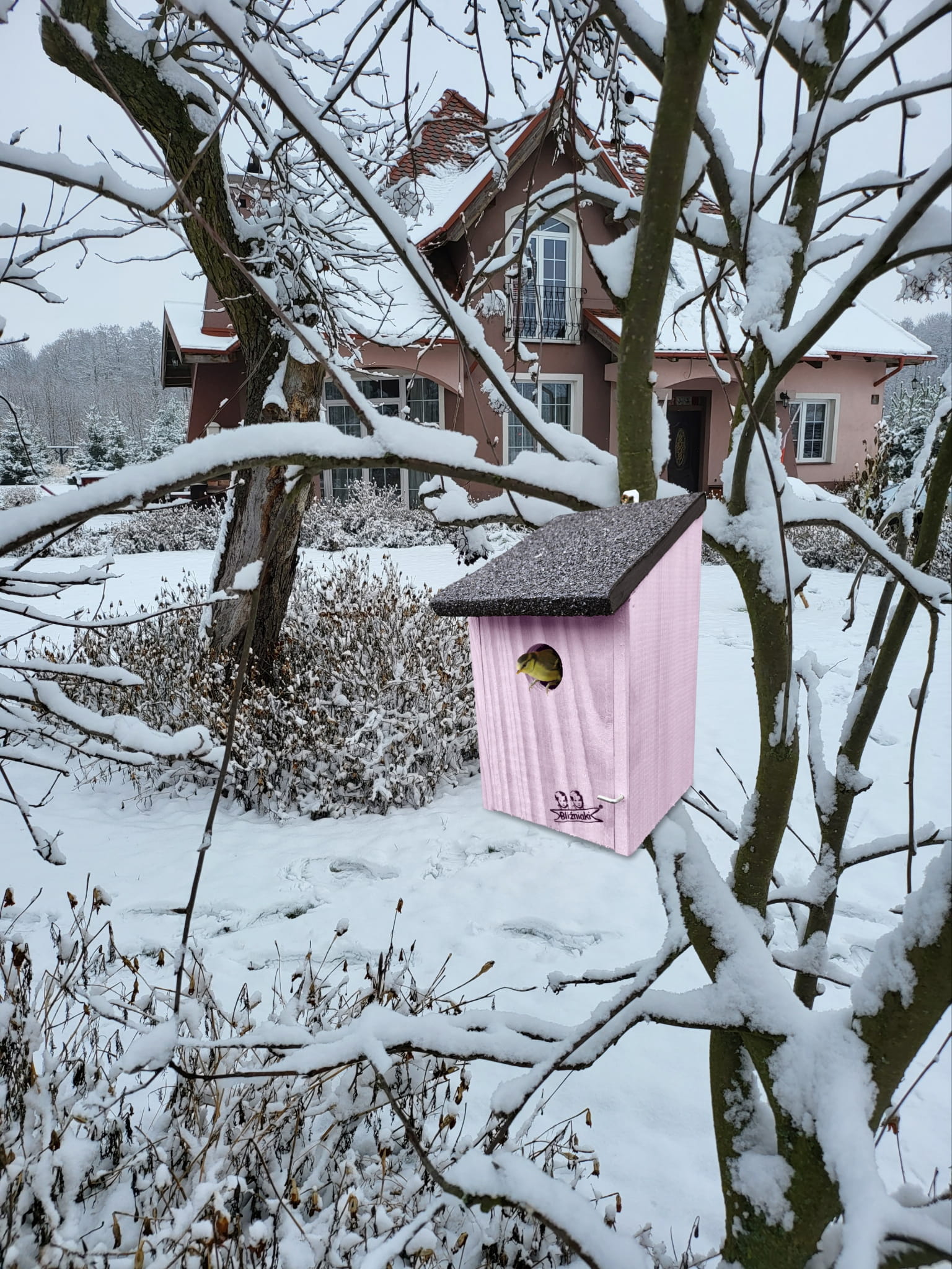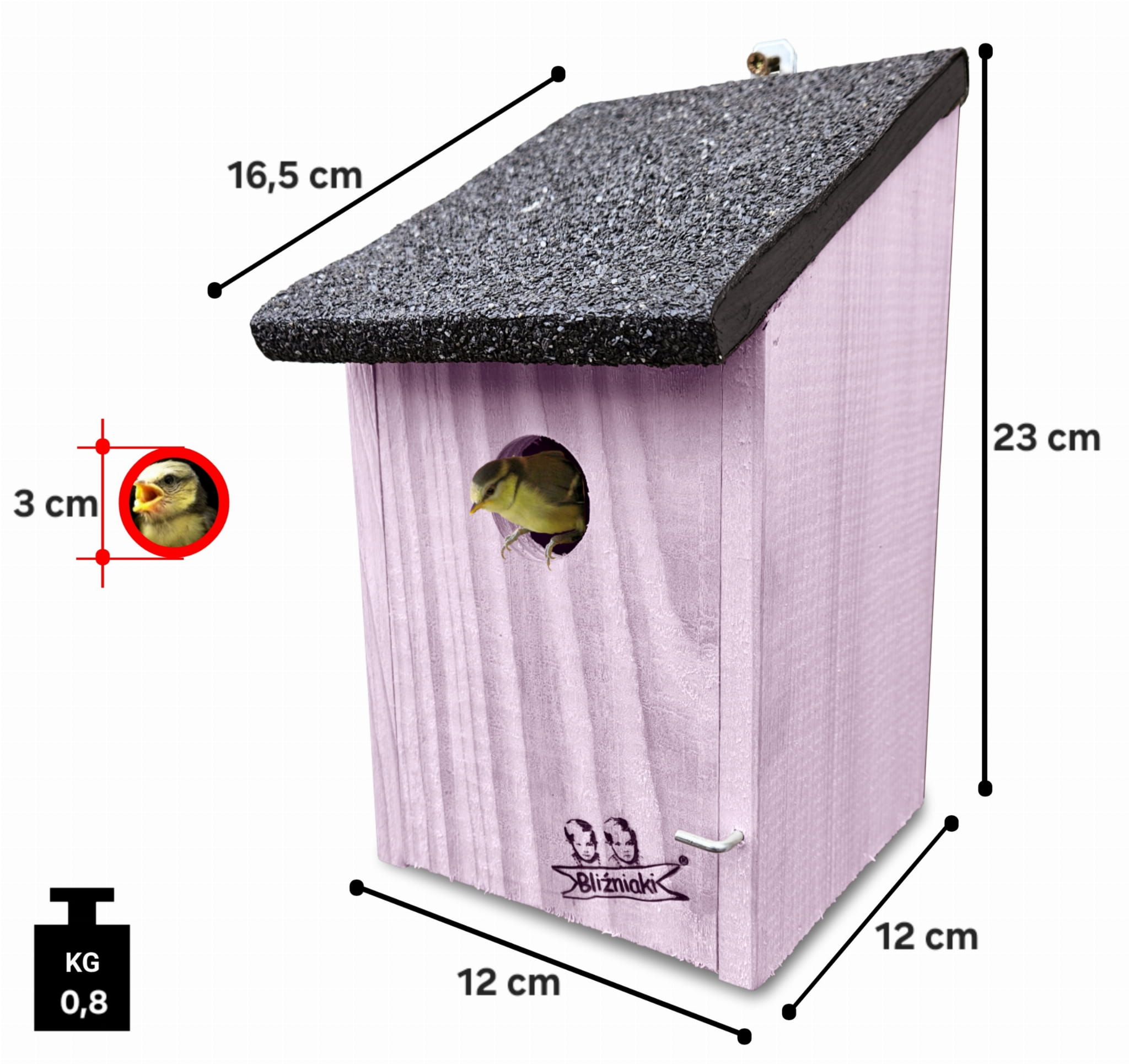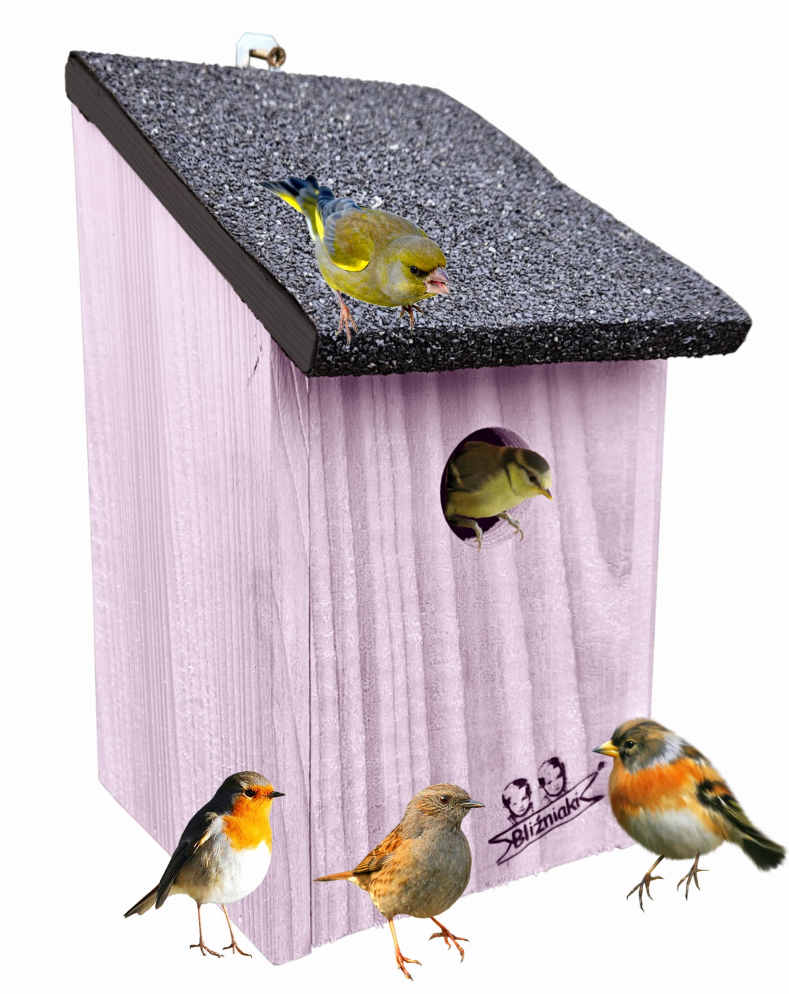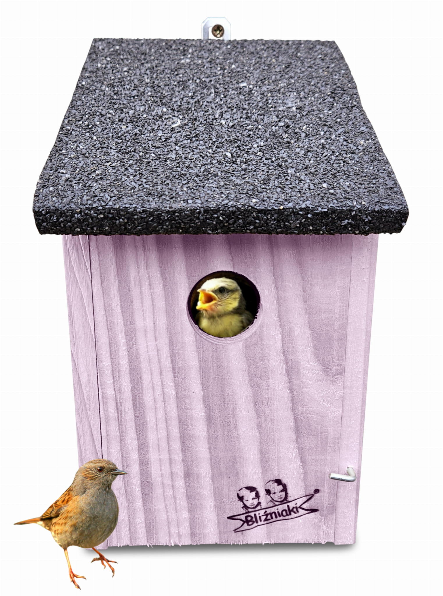 W przeważającej części skrzynka lęgowa jest w kolorze PASTELOWYM FIOLETOWYM, dach pokryty jest PAPĄ BITUMICZNĄ w kolorze CZARNYM.