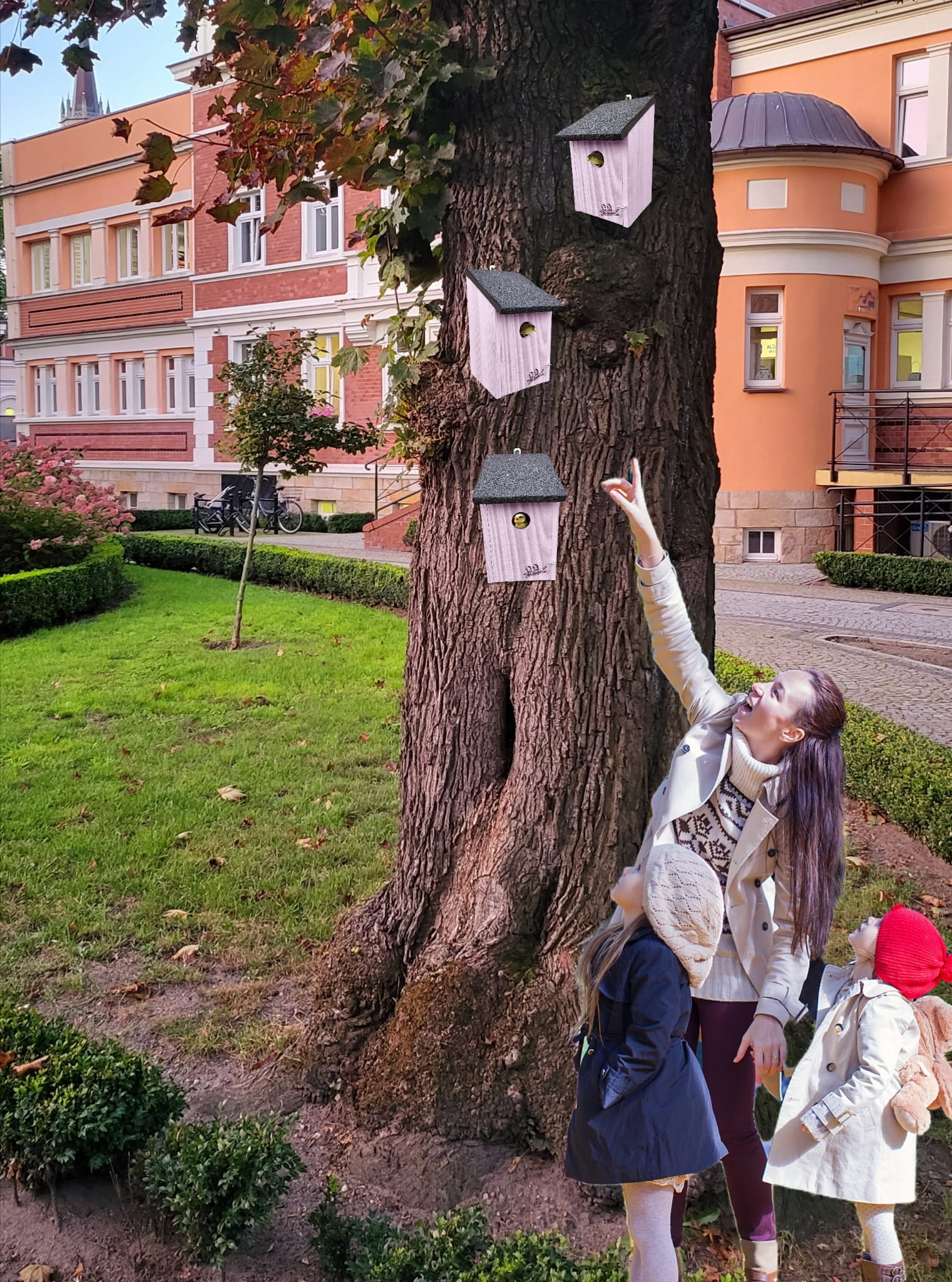 Budki lęgowe, które imitują dziuplę w drzewie warto umieścić w miejscu zacienionym, spokojnym, w odległości ok. 2 m od siebie.