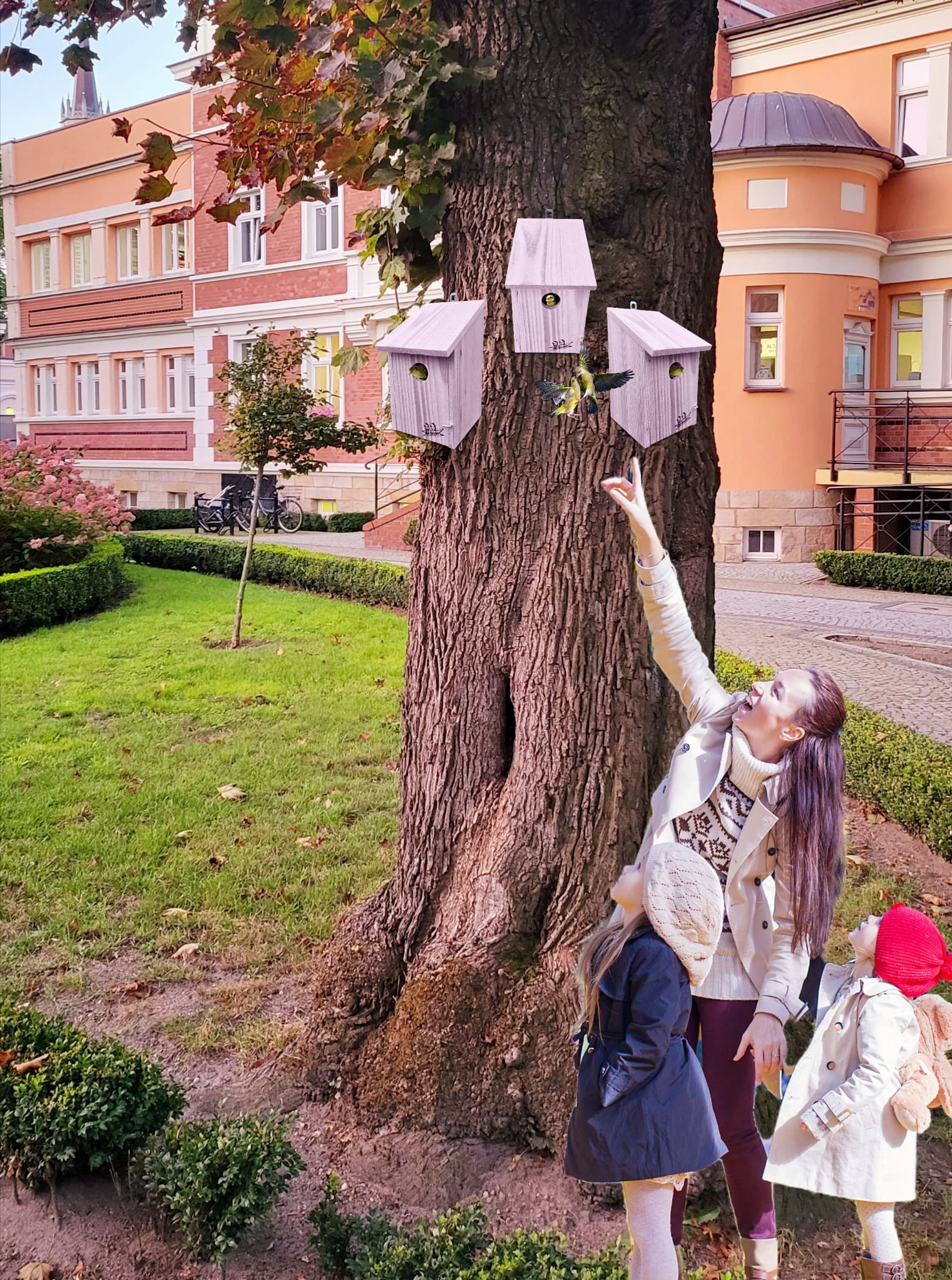 Budki lęgowe, które imitują dziuplę w drzewie warto umieścić w miejscu zacienionym, spokojnym, w odległości ok. 2 m od siebie.