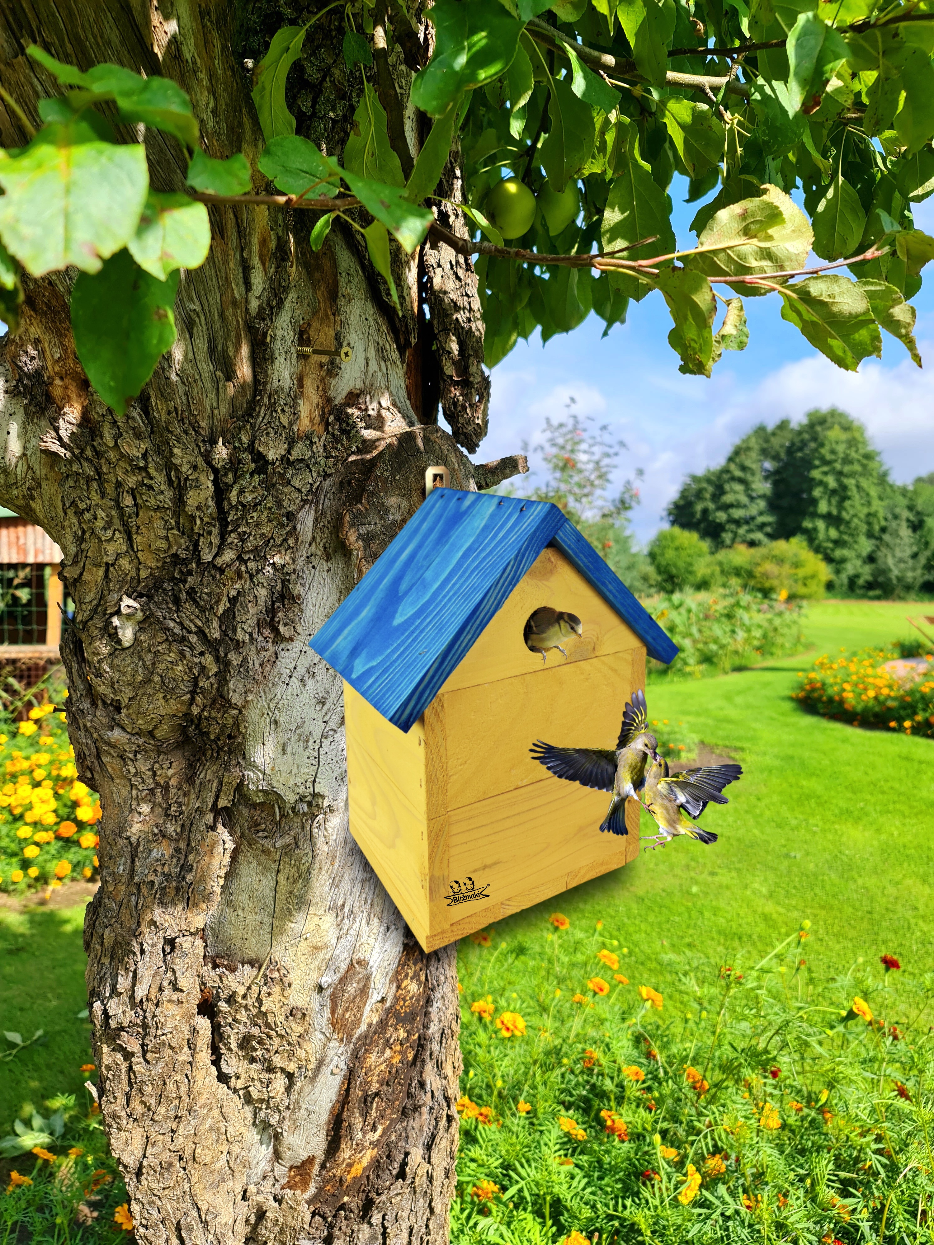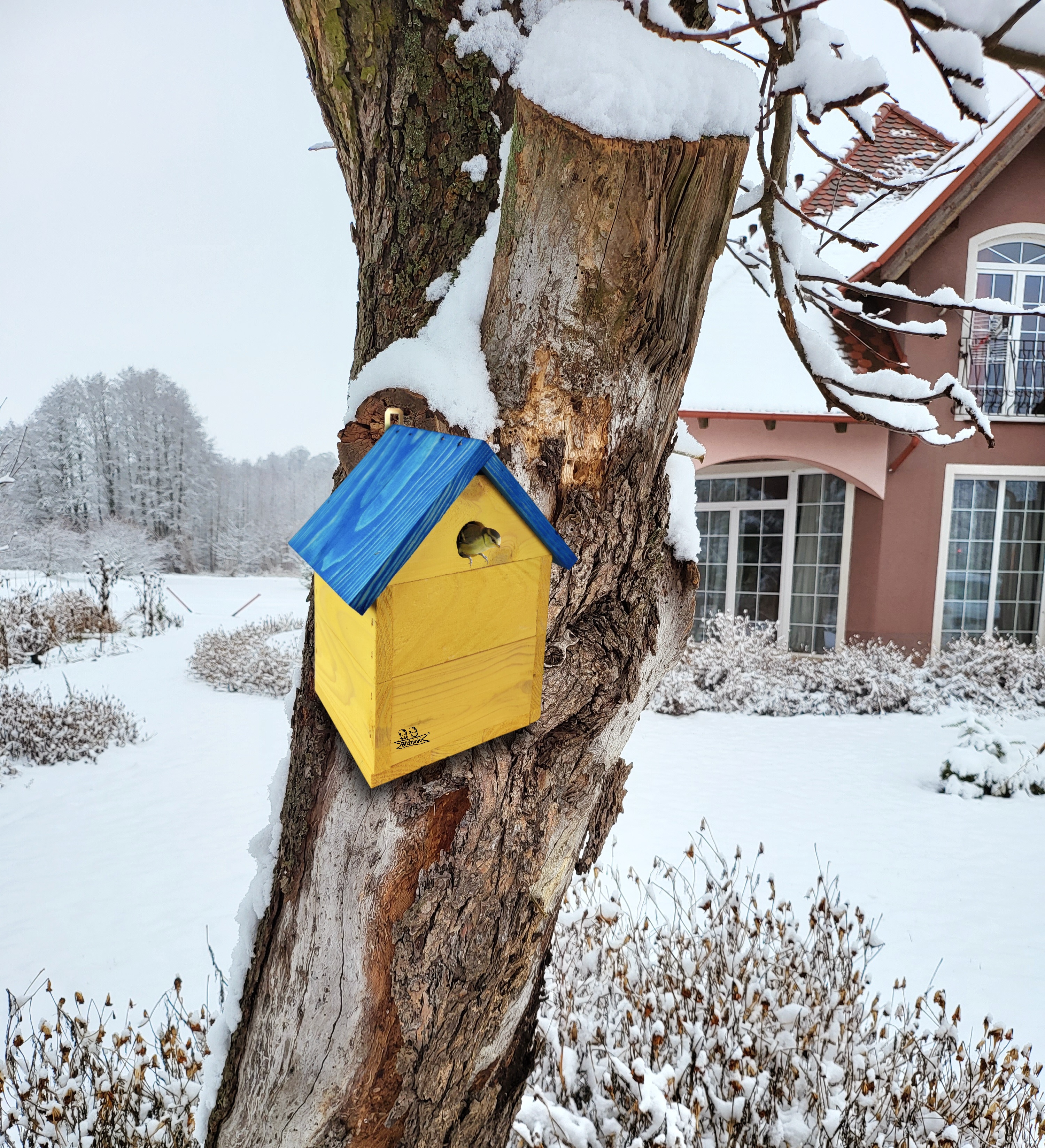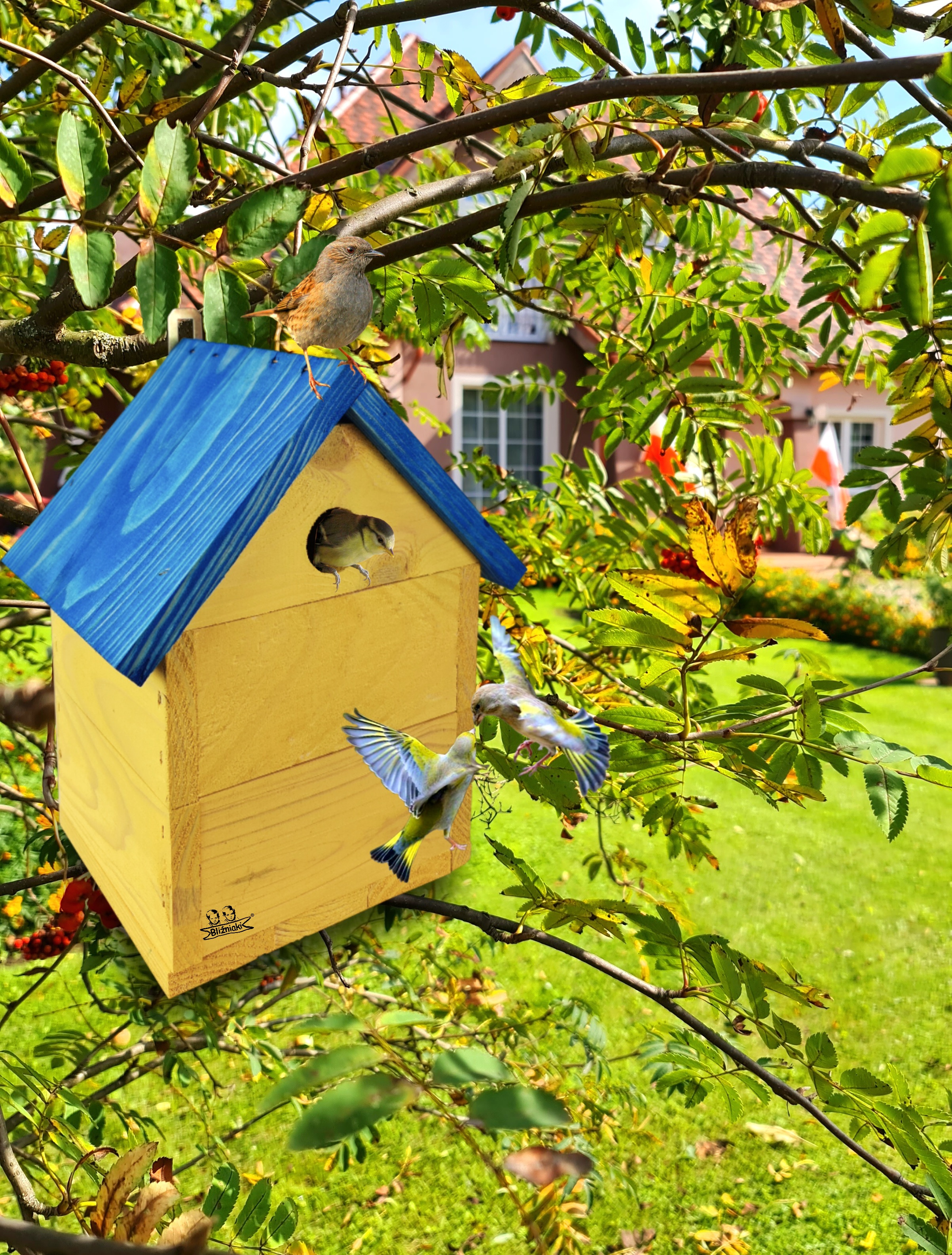 - Budka lęgowa w kolorze niebiesko-żółtym . Bardzo ładnie komponuje się w otoczeniu