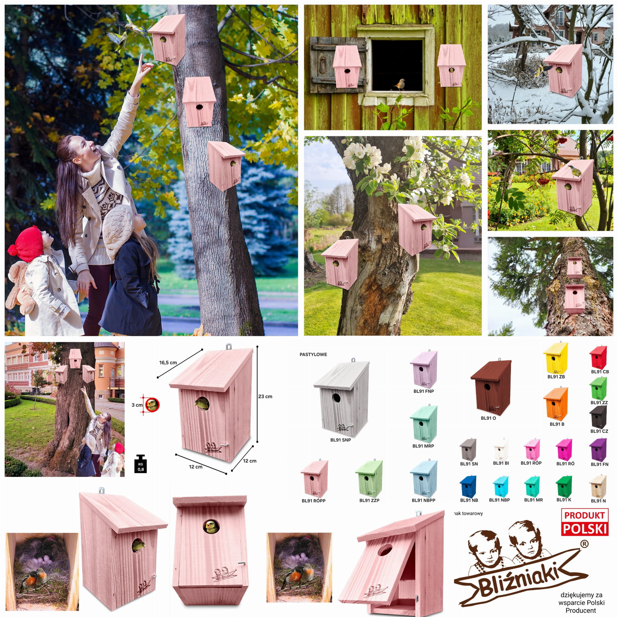 Produkt wykonany został z suszonego drewna sosnowego. Budka w kolorze PASTELOWYM RÓŻOWYM jest zabezpieczona metodą impregnowania. Środek na bazie wody użyty do impregnacji jest w pełni ekologiczny i bezpieczny dla ludzi i zwierząt. Zabezpieczone w taki sposób drewno sprawia, że budka lęgowa jest odporna na szkodliwe działanie wody oraz wilgoci, promieni UV, a także grzybów i pleśni, może być więc przechowywana przez cały rok na zewnątrz.