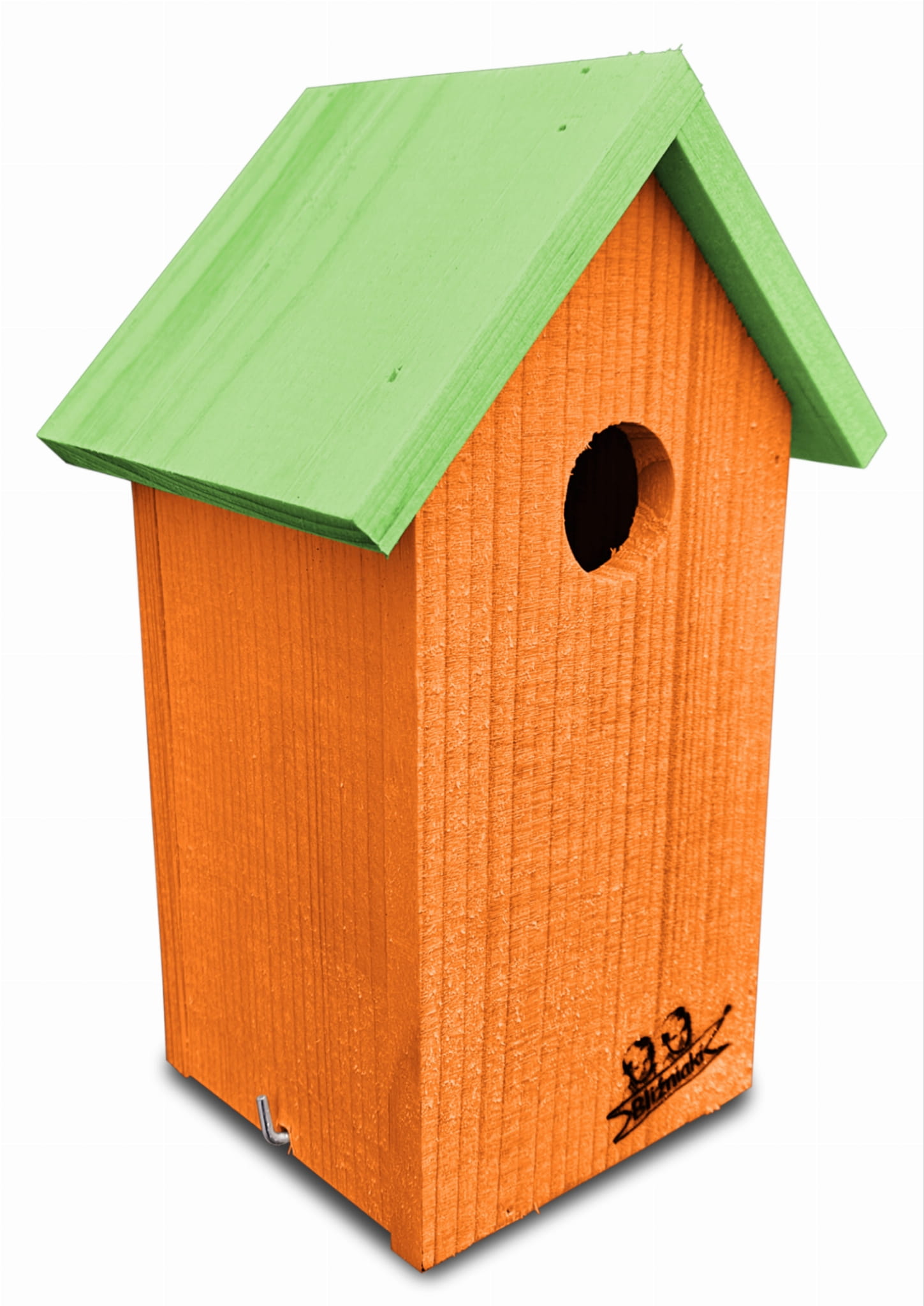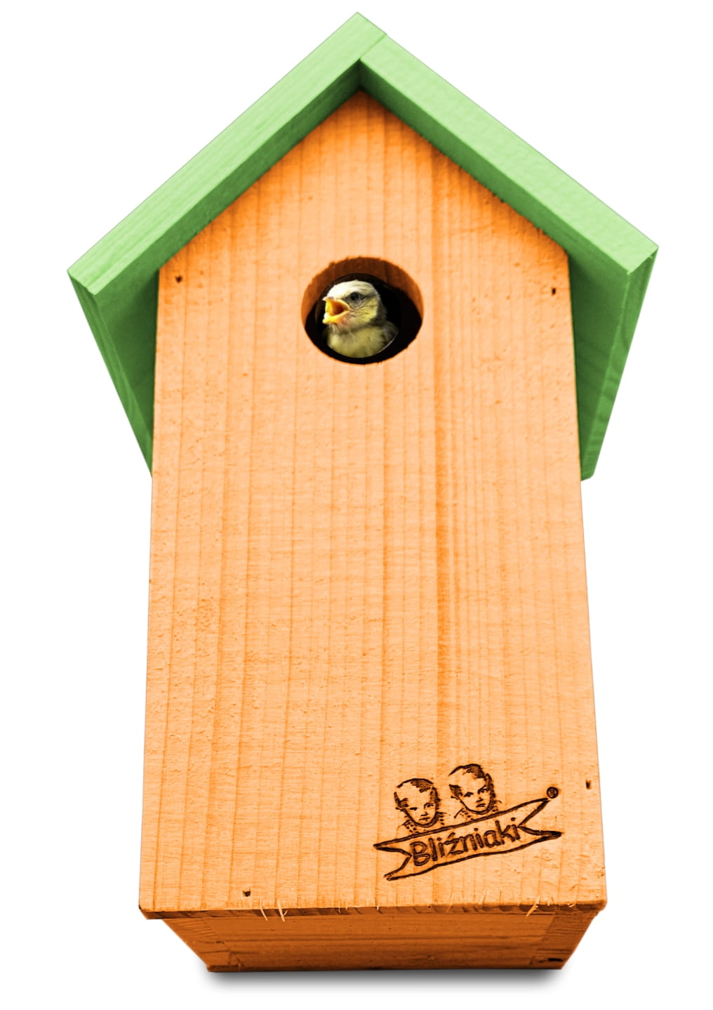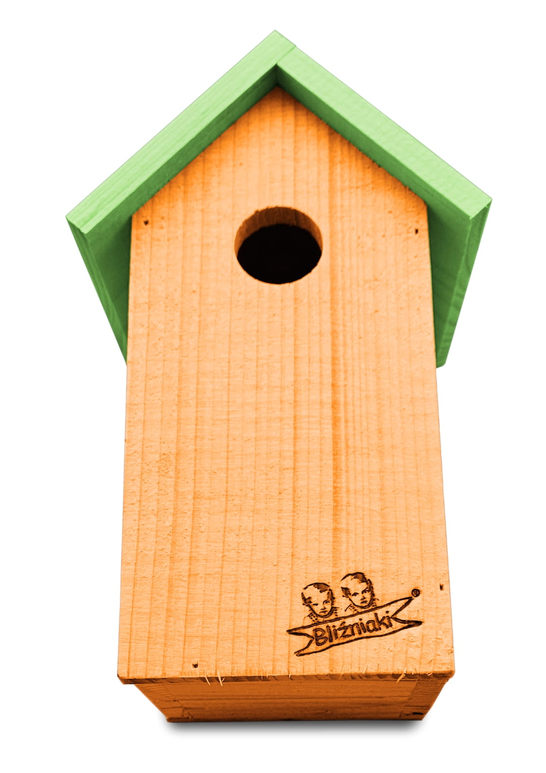 W przeważającej części skrzynka lęgowa jest w kolorze OLCHOWYM, dach pokryty został kolorem JASNYM ZIELONYM.