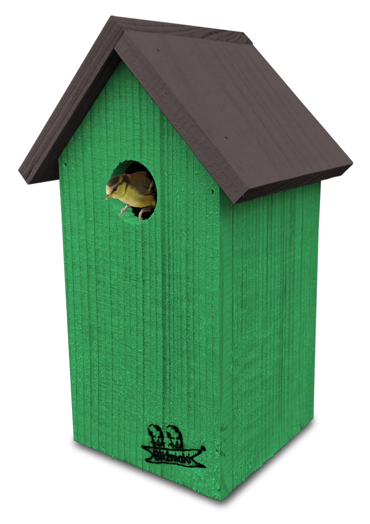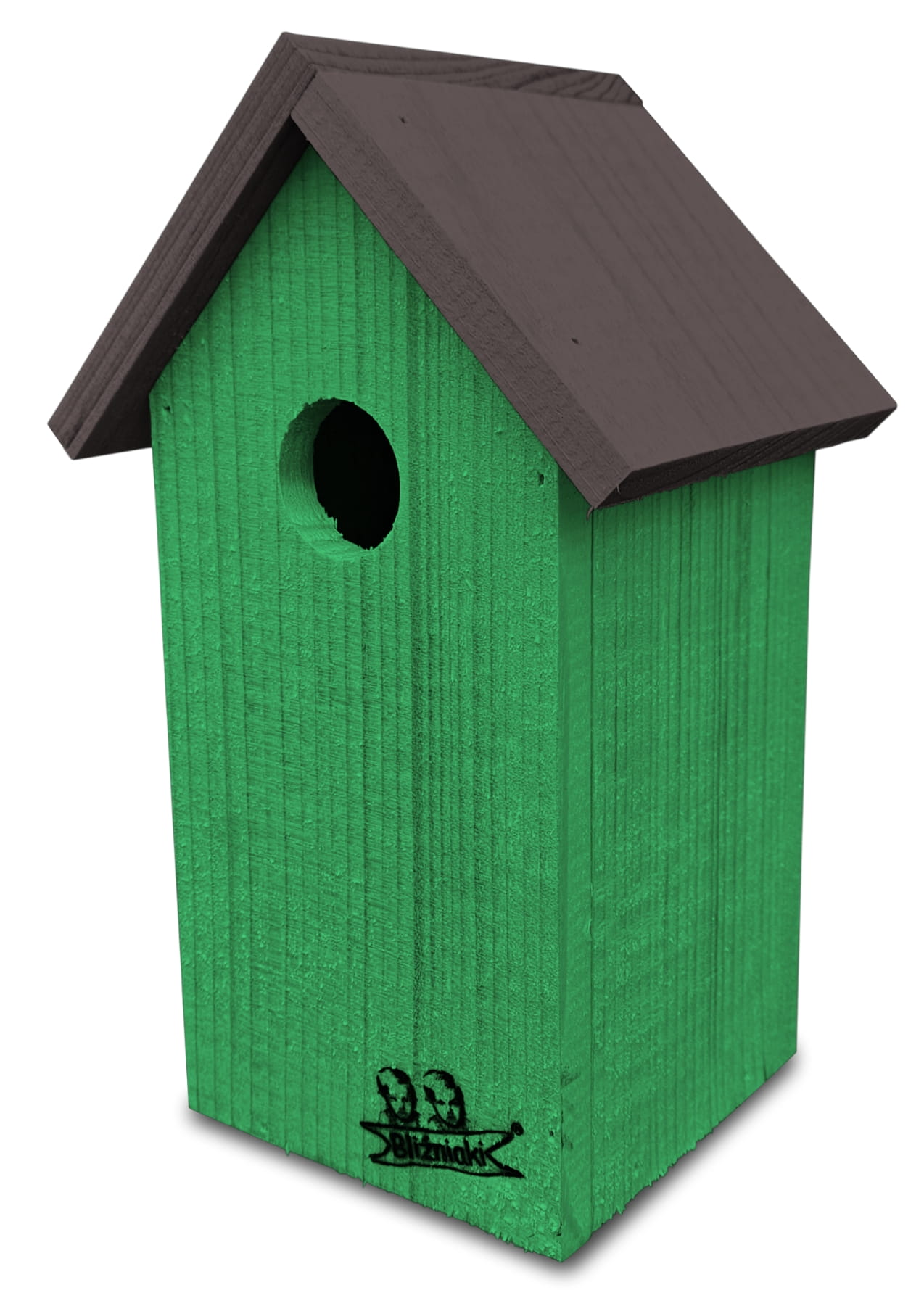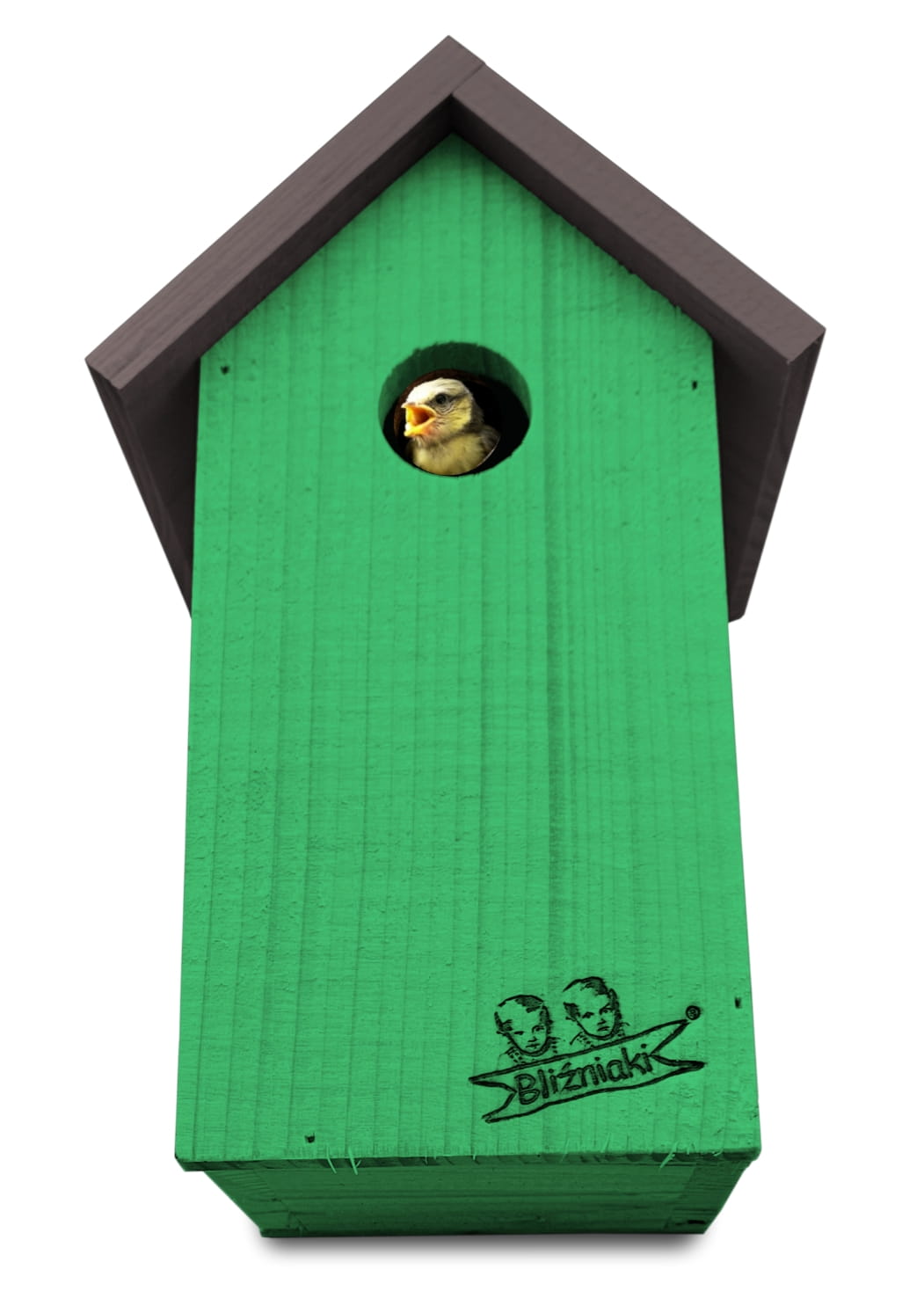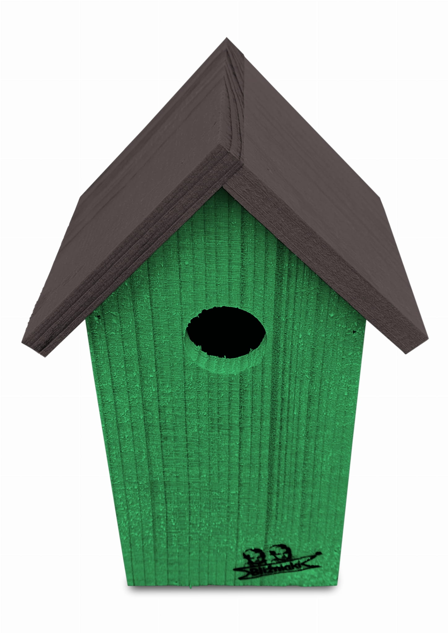 W przeważającej części skrzynka lęgowa jest w kolorze ZIELONYM, dach pokryty został kolorem CZARNYM.