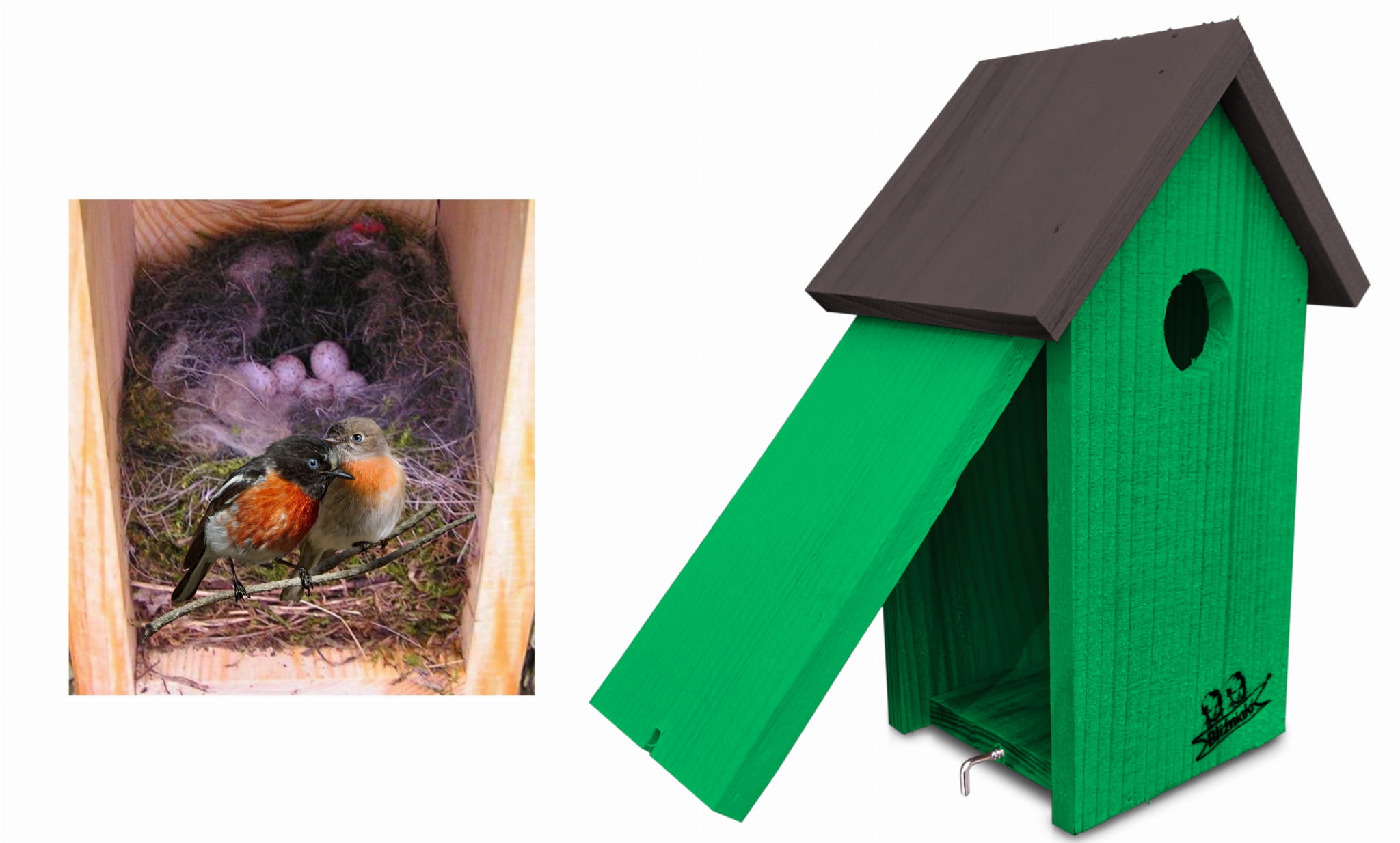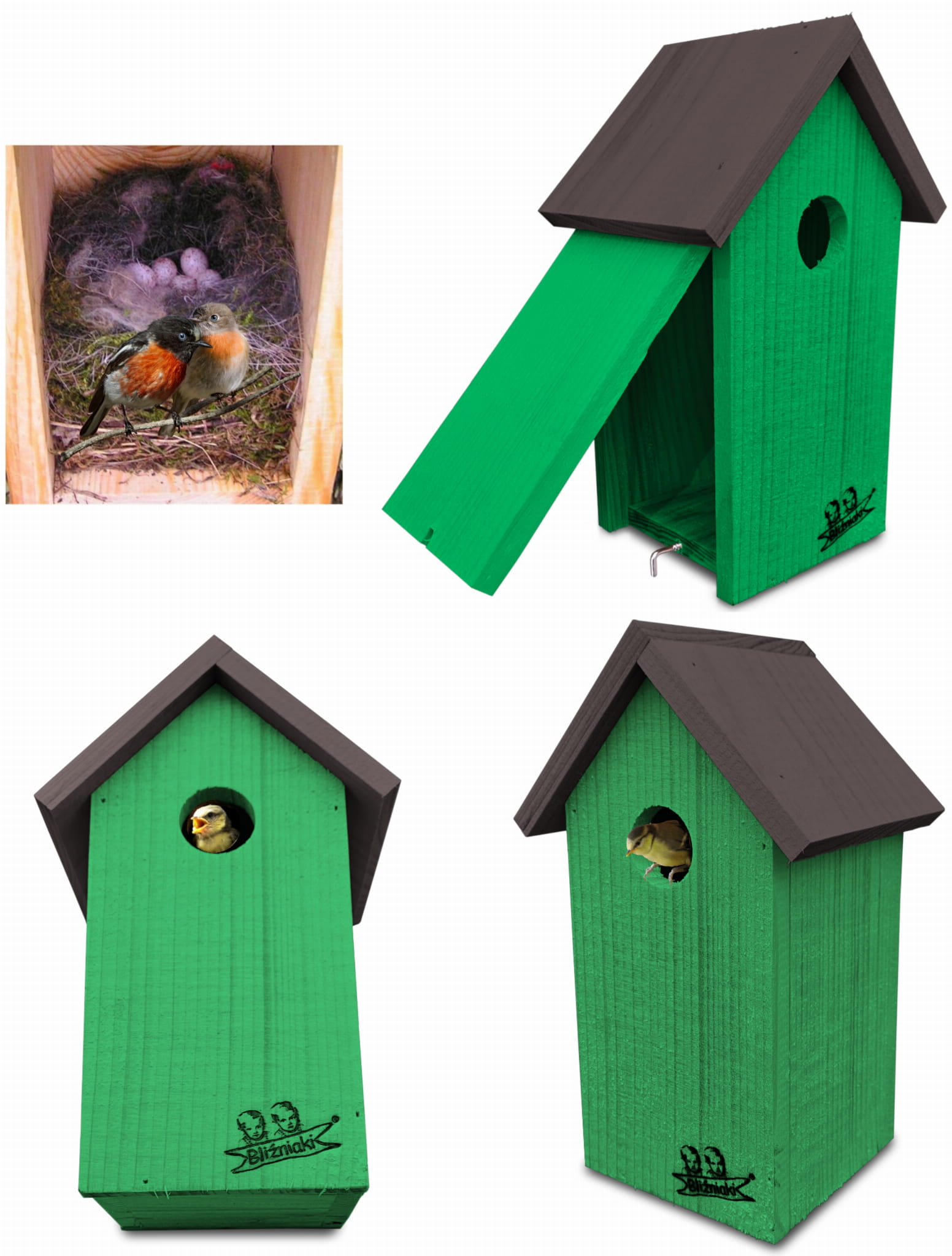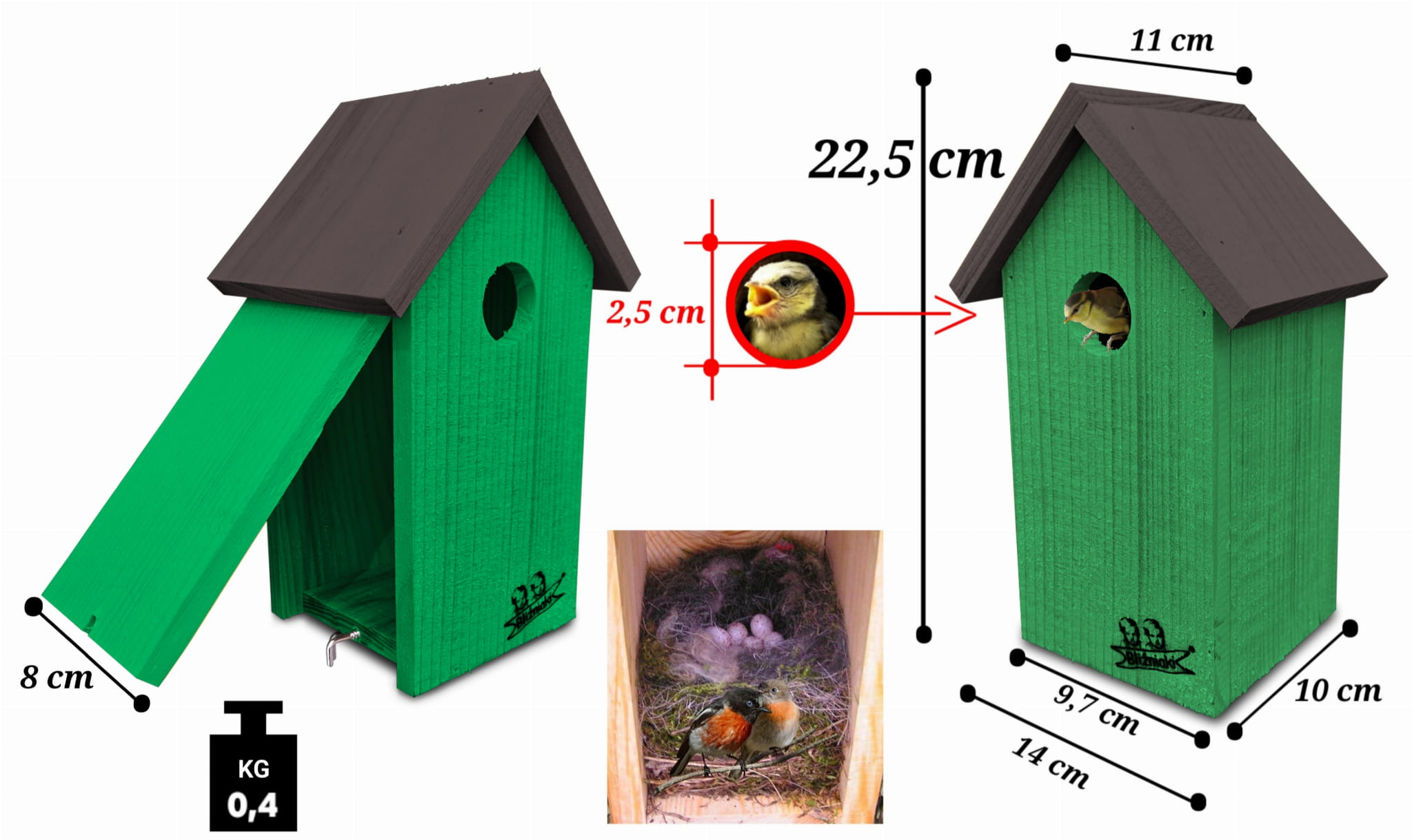 Przestrzeń i wygoda: zaprojektowane specjalnie z myślą o małych ptakach, zapewnią im odpowiednią przestrzeń do swobodnego poruszania się i zakładania gniazd. Skrzynki posiadają wlot o średnicy 25 mm oraz otwieraną boczną ścianę.