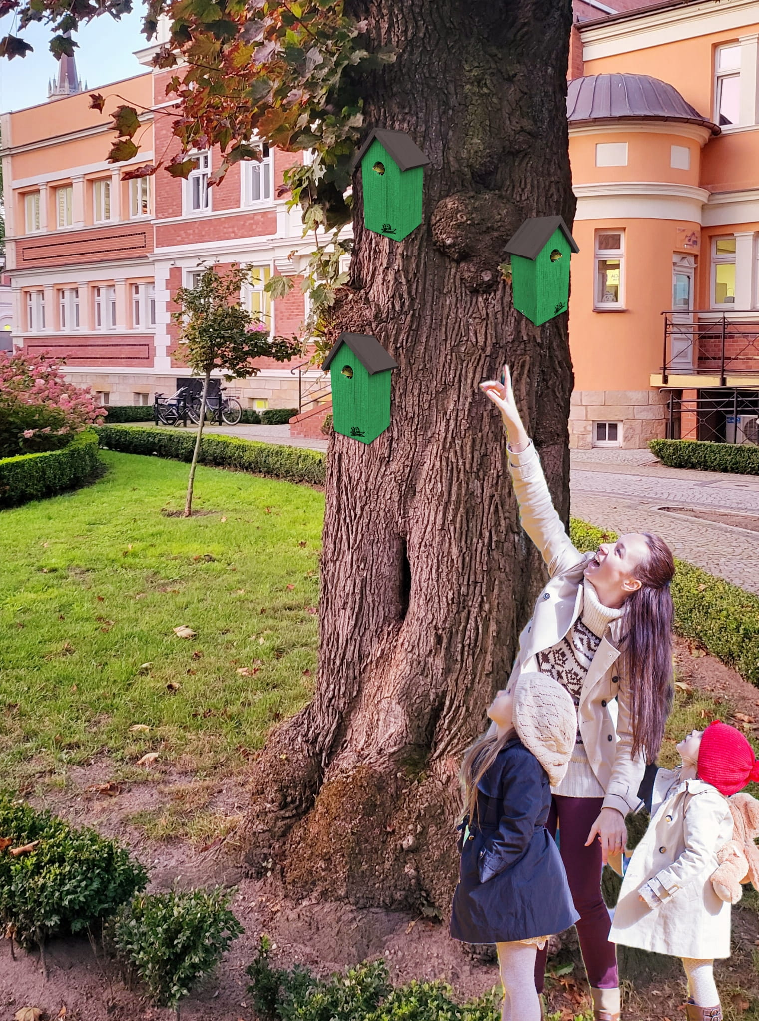 Budki lęgowe, które imitują dziuplę w drzewie warto umieścić w miejscu zacienionym, spokojnym, w odległości ok. 2 m od siebie.
