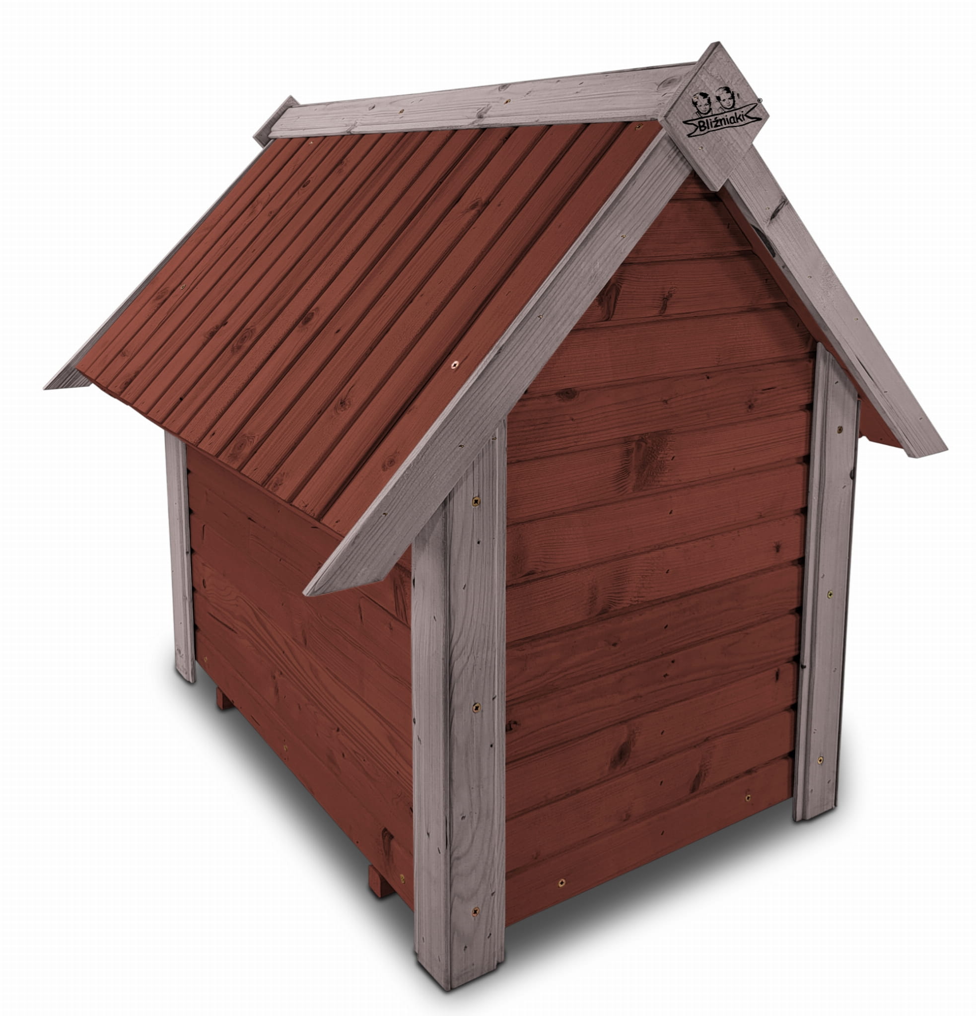 - ciemny orzechowy kolorem bazowym budy, a kolorem szarym podkreślone zostały narożniki domku, szczytu dachu oraz półkoliste wejście