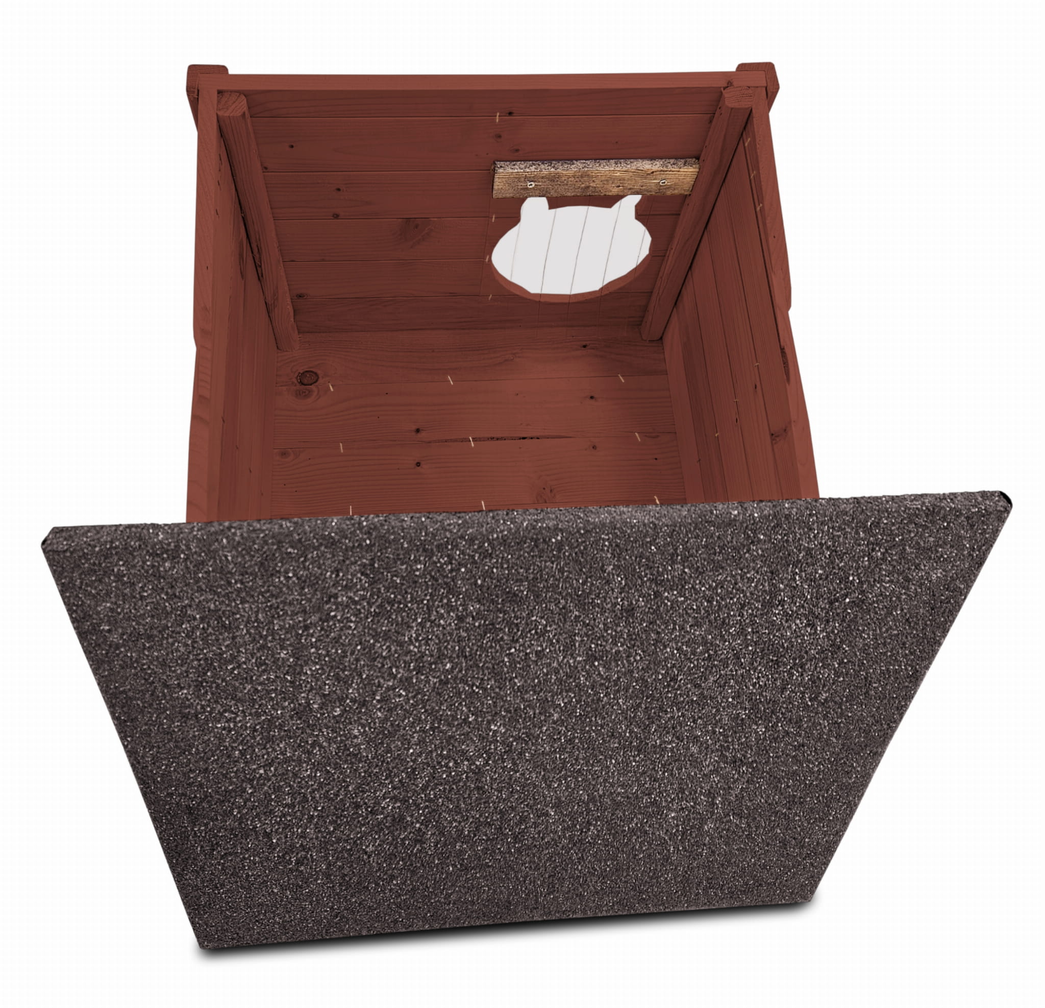 - Dach jest łatwo zdejmowany, co ułatwia uzupełnienie budki posłaniem lub jej czyszczeniem