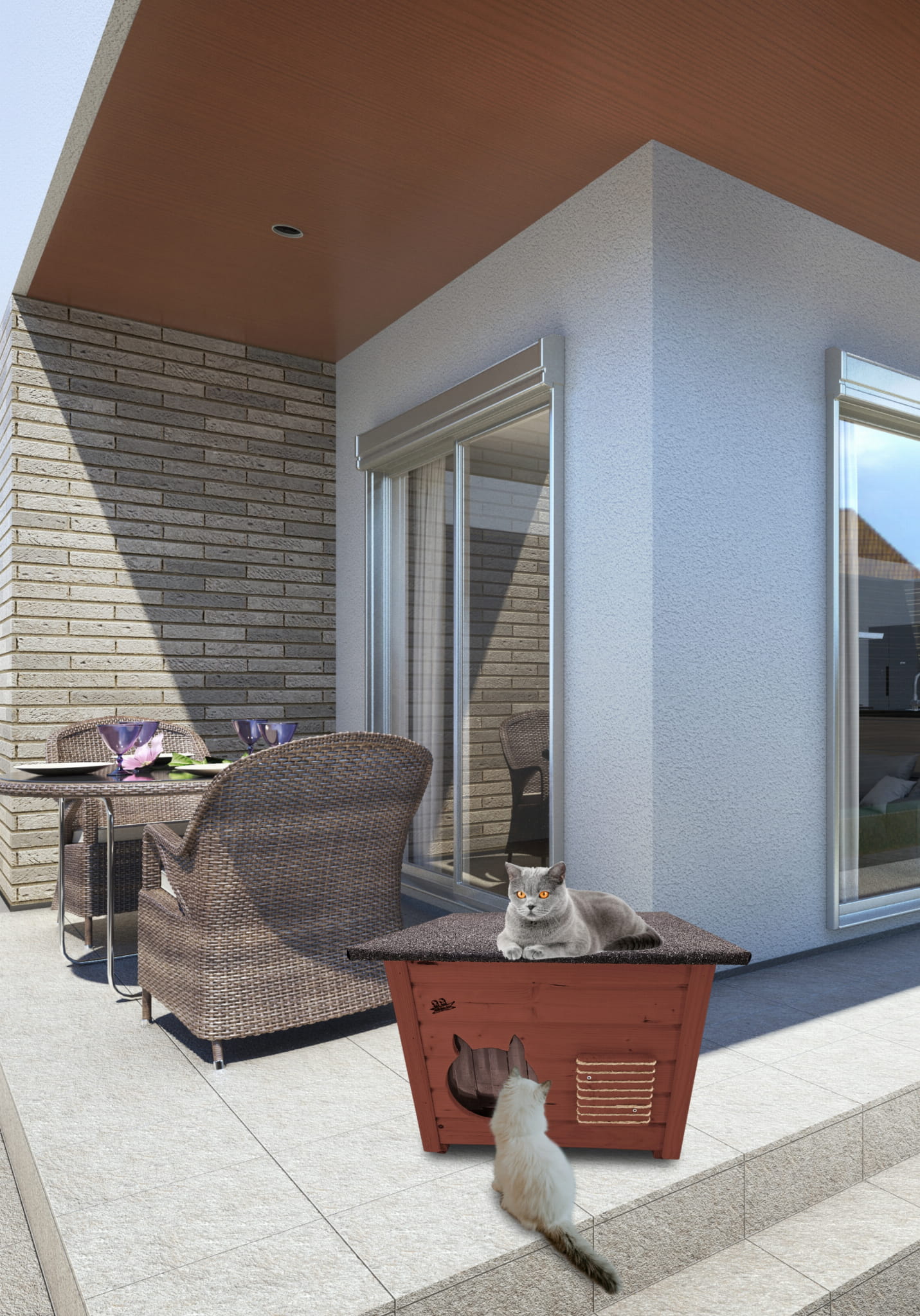 Domek może być ustawiony na ogrodzie lub tarasie ale też można go postawić w pomieszczeniach. Jest bardzo przestronny i wygodny i nasze kociaki mogą czuć się w nim swobodnie i komfortowo. Domek wykonany jest solidnie z impregnowanego drewna, dach drewniany z asfaltowy oraz specjalna zasłona przeciwwiatrowa.