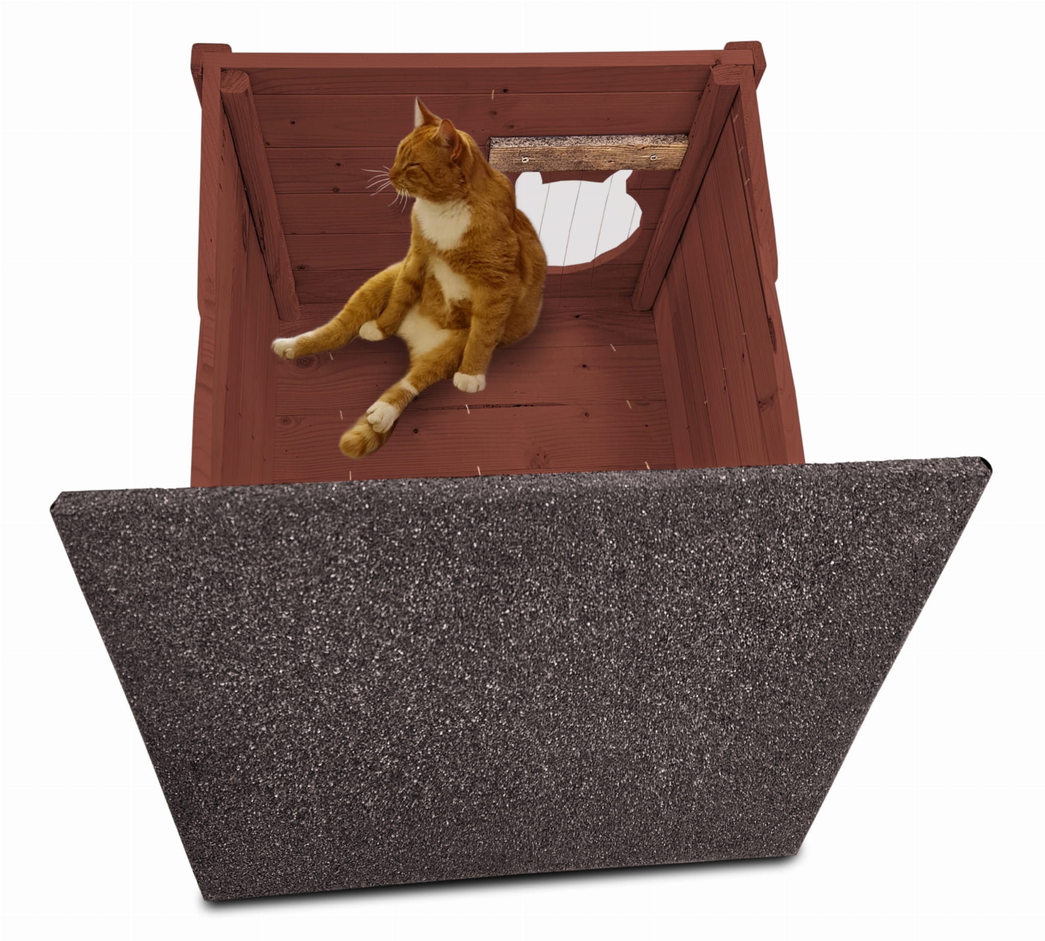 - Budka wyposażona została w drewnianą podłogę- zapewnia to jeszcze większą wygodę kotom i izolację od podłoża