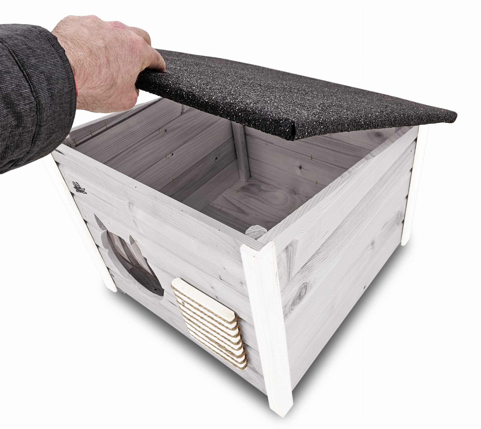 Domek może być ustawiony na ogrodzie lub tarasie ale też można go postawić w pomieszczeniach. Jest bardzo przestronny i wygodny i nasze kociaki mogą czuć się w nim swobodnie i komfortowo. Domek wykonany jest solidnie z impregnowanego drewna, dach drewniany z asfaltowy oraz specjalna zasłona przeciwwiatrowa.