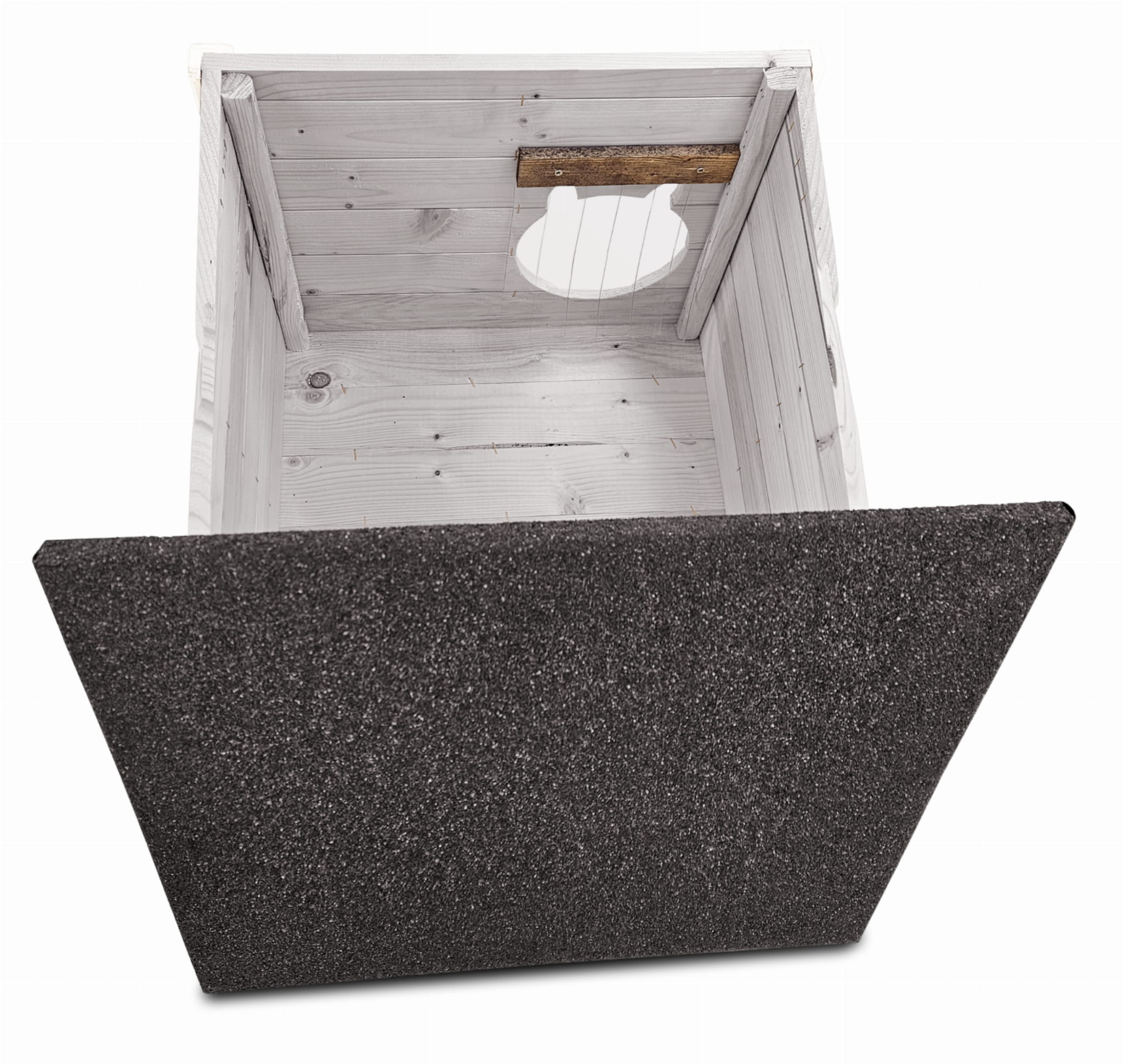 - Dach jest łatwo zdejmowany, co ułatwia uzupełnienie budki posłaniem lub jej czyszczeniem