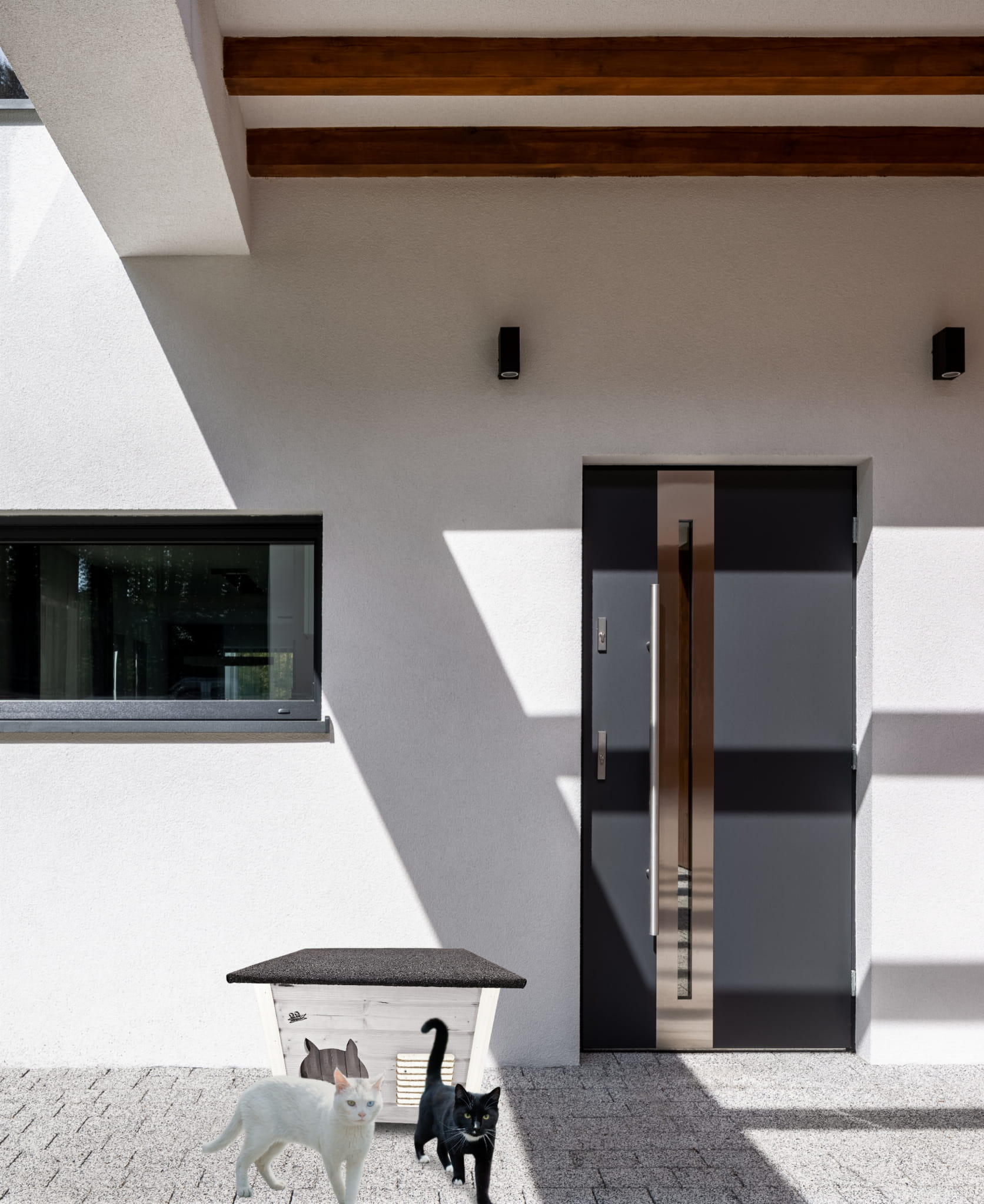 DOMEK dla KOTA ma ozdobne wejście i kolor, który dodaje walorów dekoracyjnych.