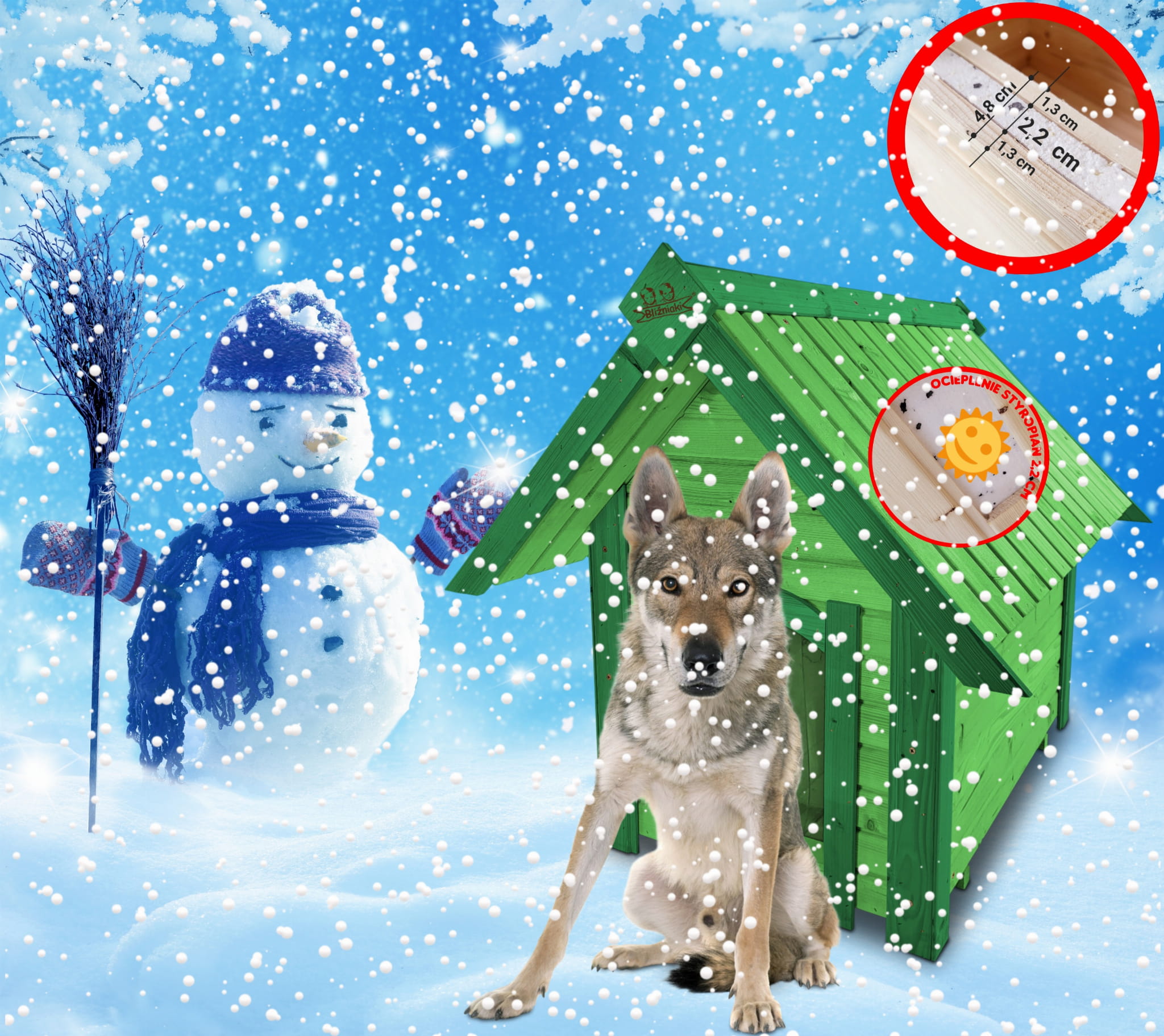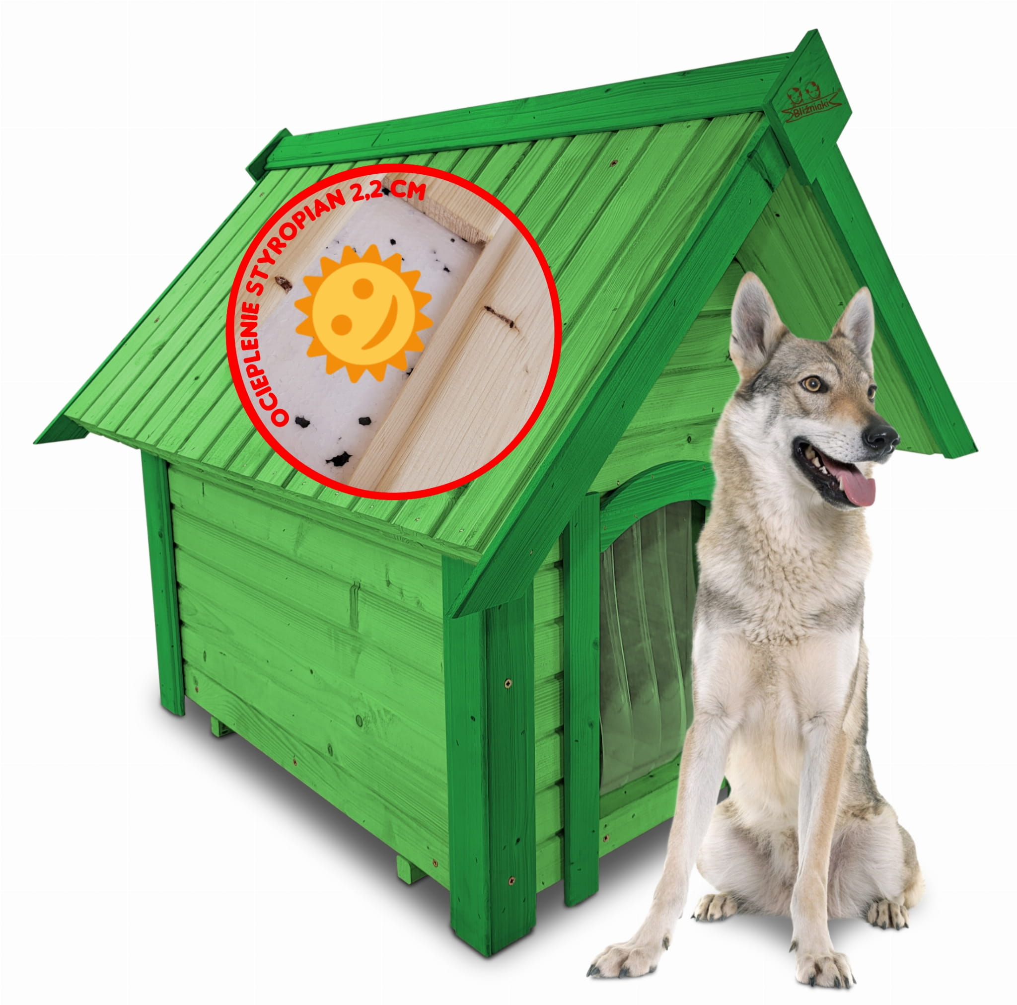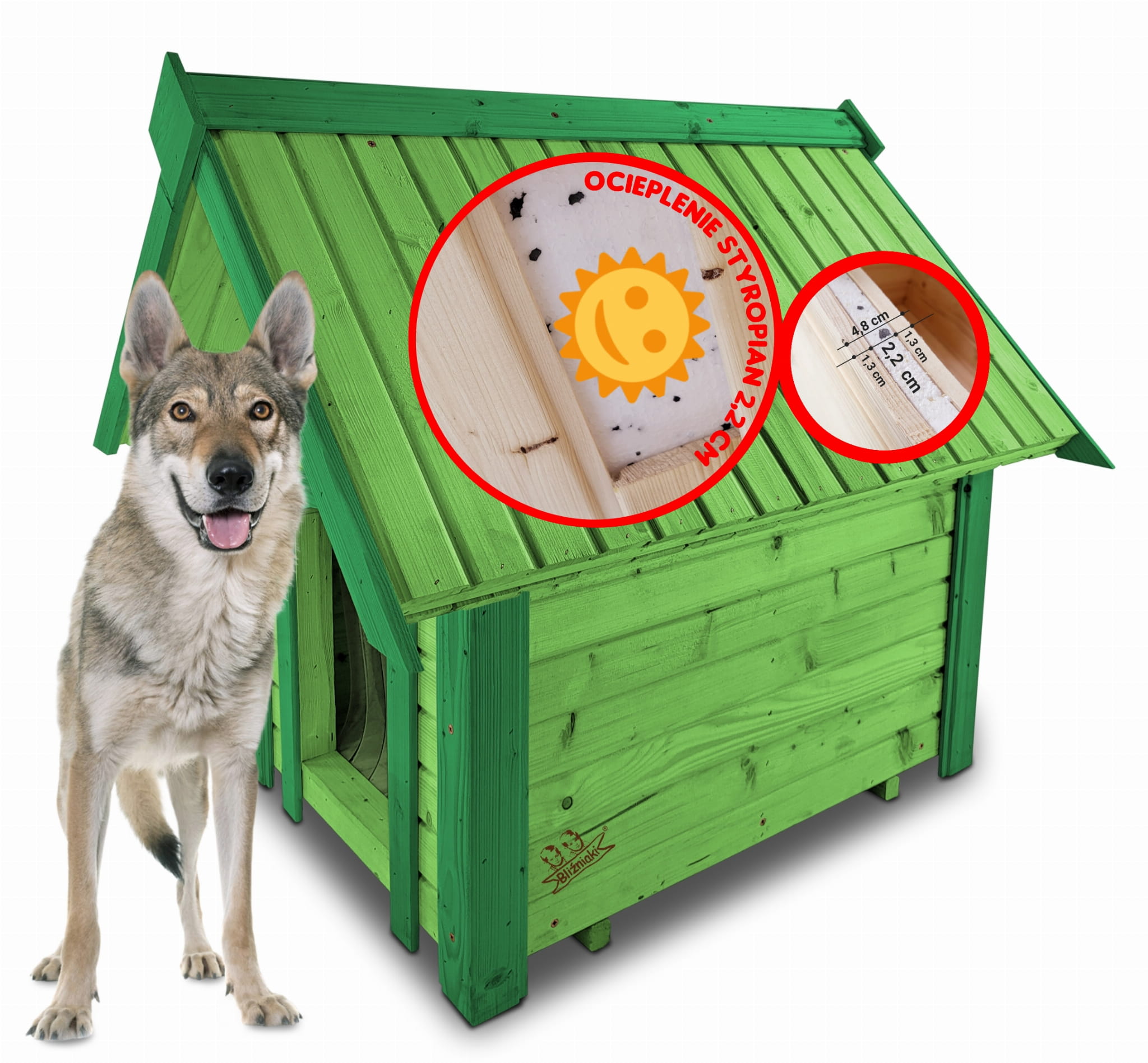 - Domek dla psa OCIEPLONY JEST STYROPIANEM O GRUBOŚCI 2,2CM co zapewnia jeszcze większy komfort przebywania w środku : latem - izoluje przed przegrzaniem a zimą chroni przed utratą ciepła, jest to buda całoroczna dla Psów