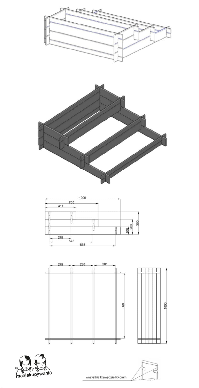 - Dostarczany jest w postaci rozmontowanej, do samodzielnego szybkiego montażu (proces widoczny w galerii poniżej).