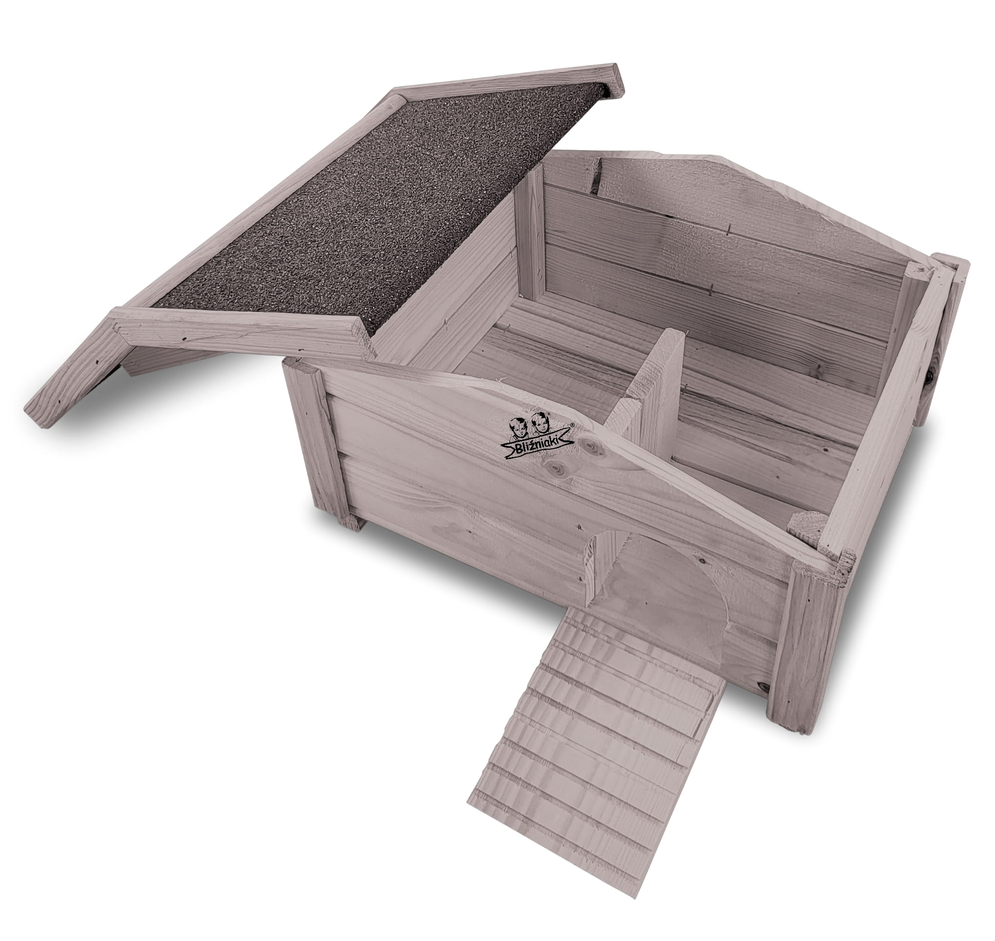 Konstrukcja domku jest stabilna, zdejmowany dwuspadowy dach ułatwi czyszczenie wnętrza budki a do środka prowadzi podest ryflowane schodki, ponadto kryta podłoga odizolowuje jeże od mokrego i zimnego podłoża co czyni ten domek komfortowym siedziskiem do lęgu małych jeżyków.