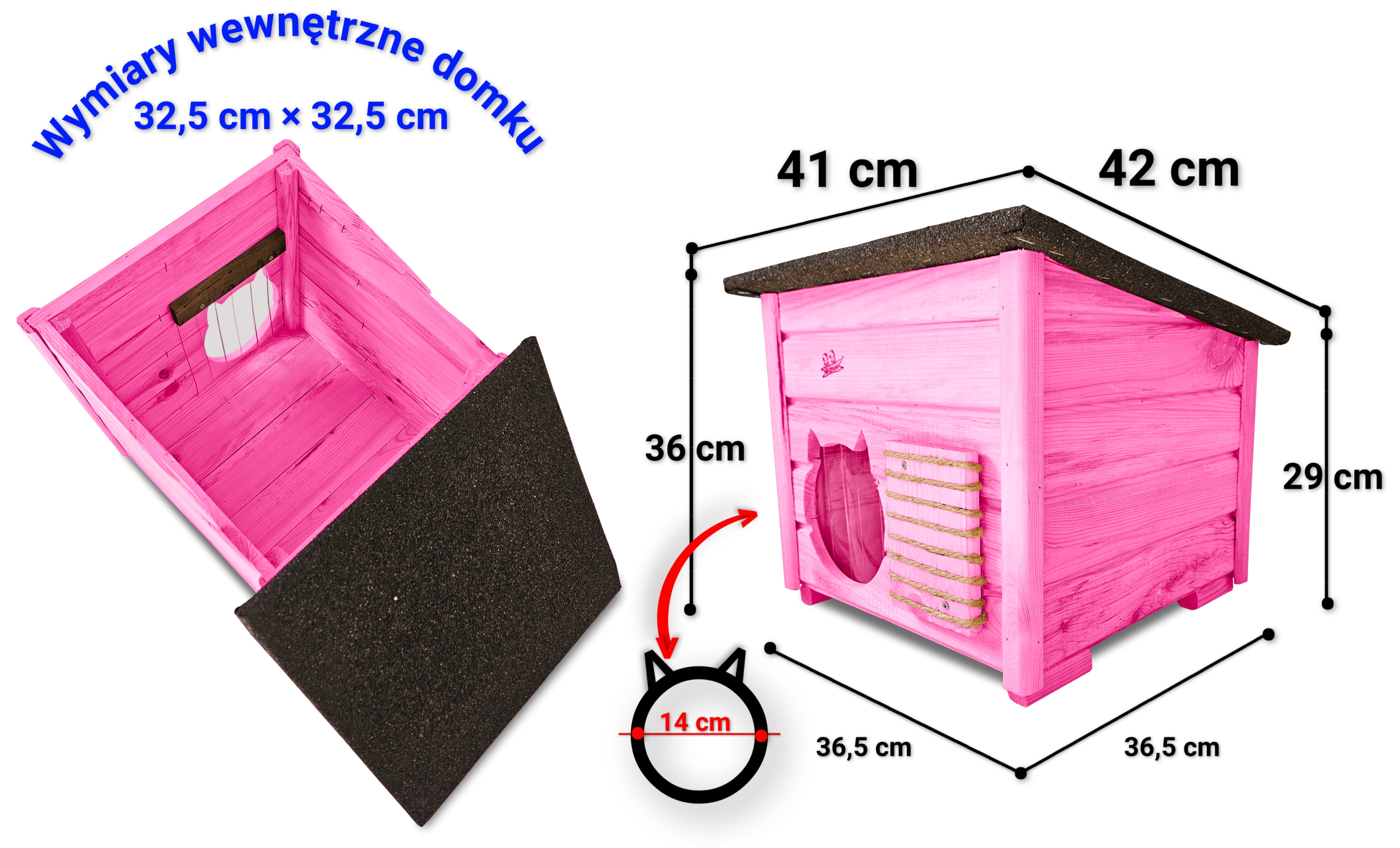 - wejście do domku ma odpowiedni duży otwór 14 cm