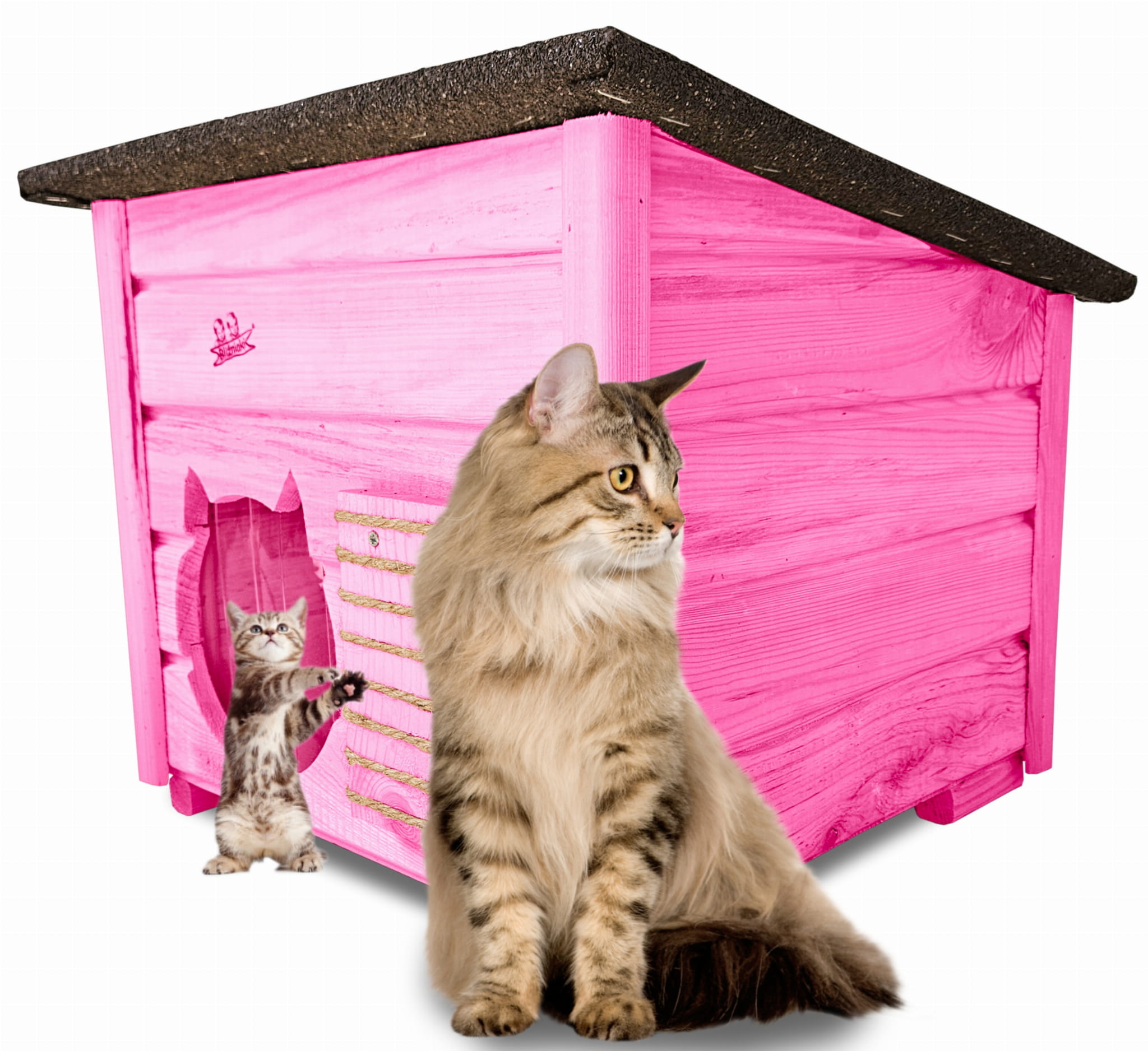 Domek może być ustawiony na ogrodzie lub tarasie ale też można go postawić w pomieszczeniach. Jest bardzo przestronny i wygodny i nasze kociaki mogą czuć się w nim swobodnie i komfortowo. Domek wykonany jest solidnie z naturalnego drewna, dach drewniany z asfaltowy oraz specjalna zasłona przeciwwiatrowa.