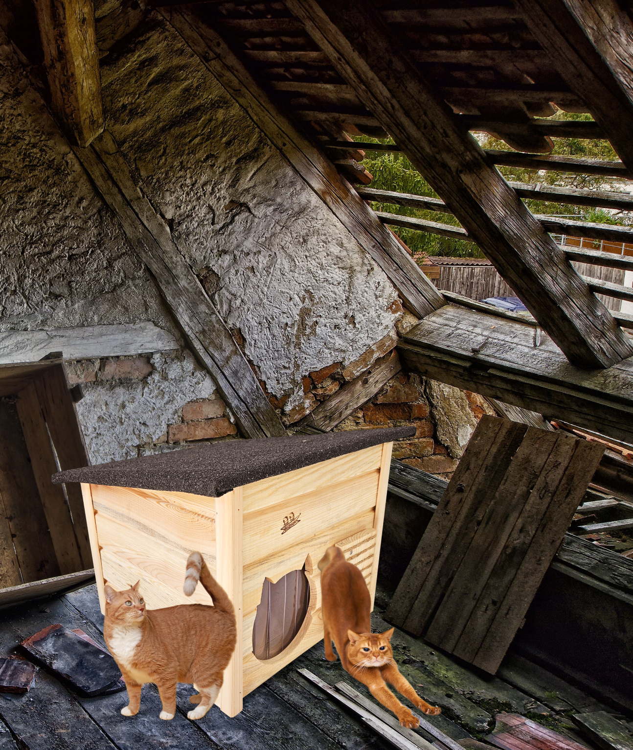 Domek może być ustawiony na ogrodzie lub tarasie ale też można go postawić w pomieszczeniach. Jest bardzo przestronny i wygodny i nasze kociaki mogą czuć się w nim swobodnie i komfortowo. Domek wykonany jest solidnie z naturalnego drewna, dach drewniany z asfaltowy oraz specjalna zasłona przeciwwiatrowa.