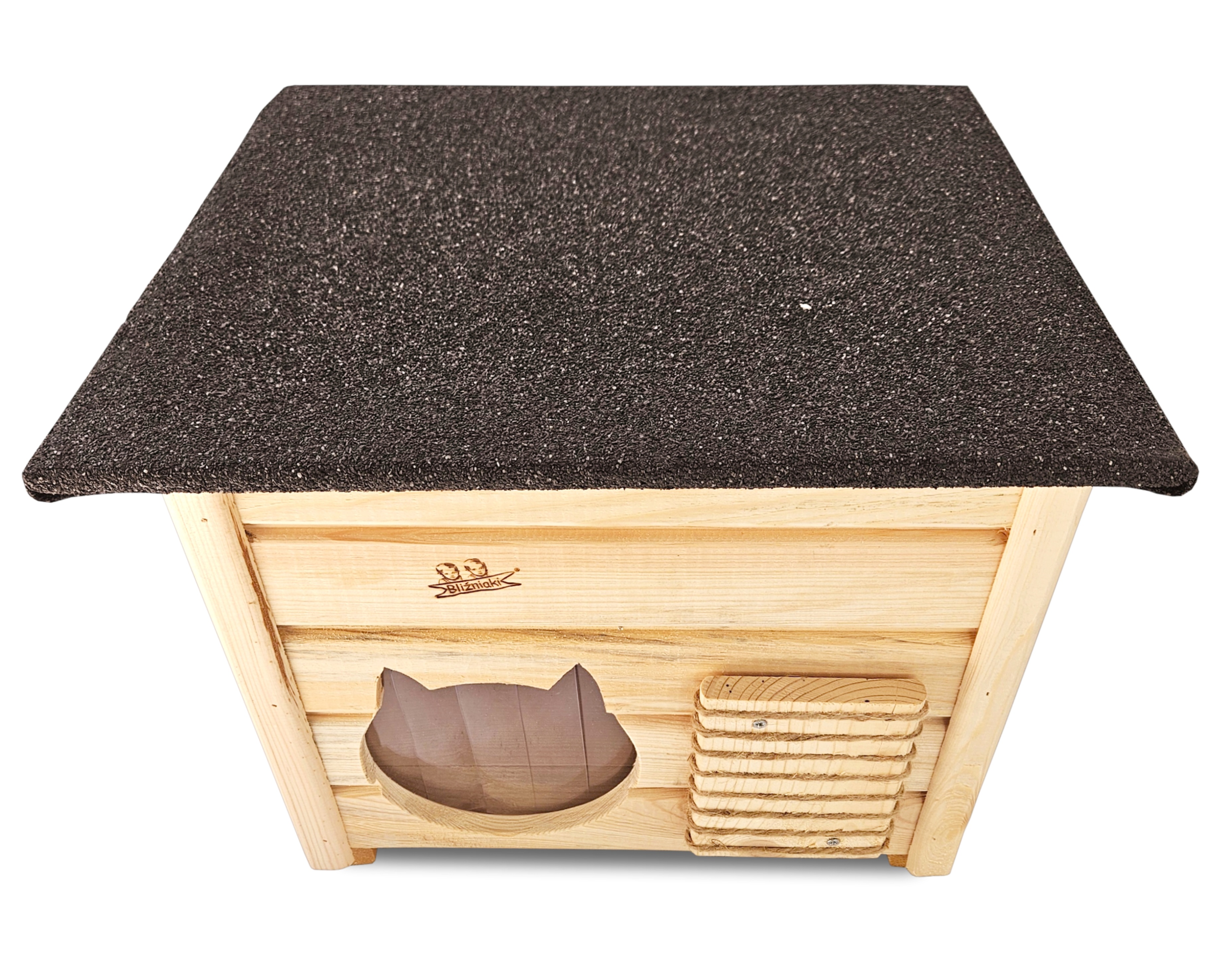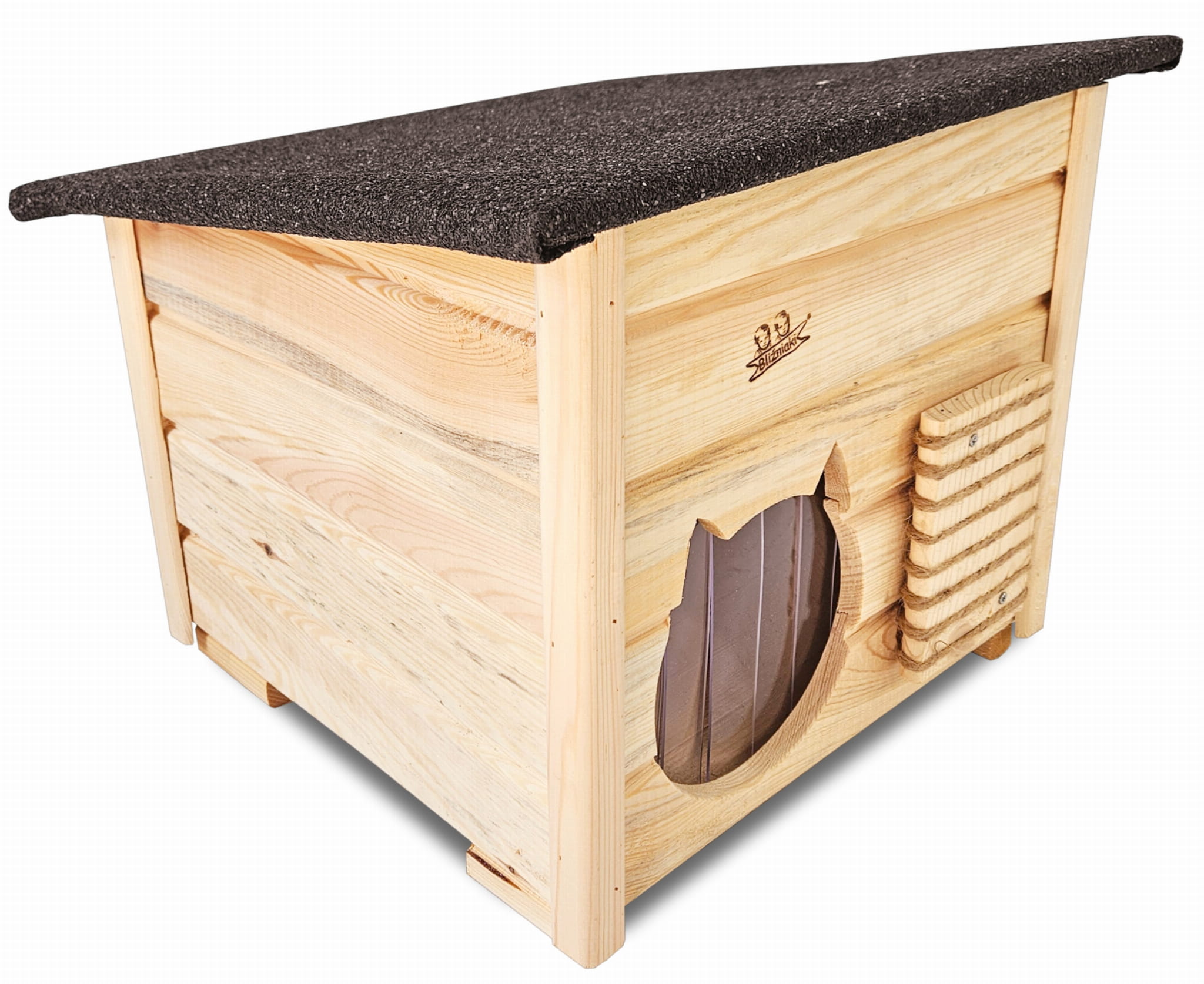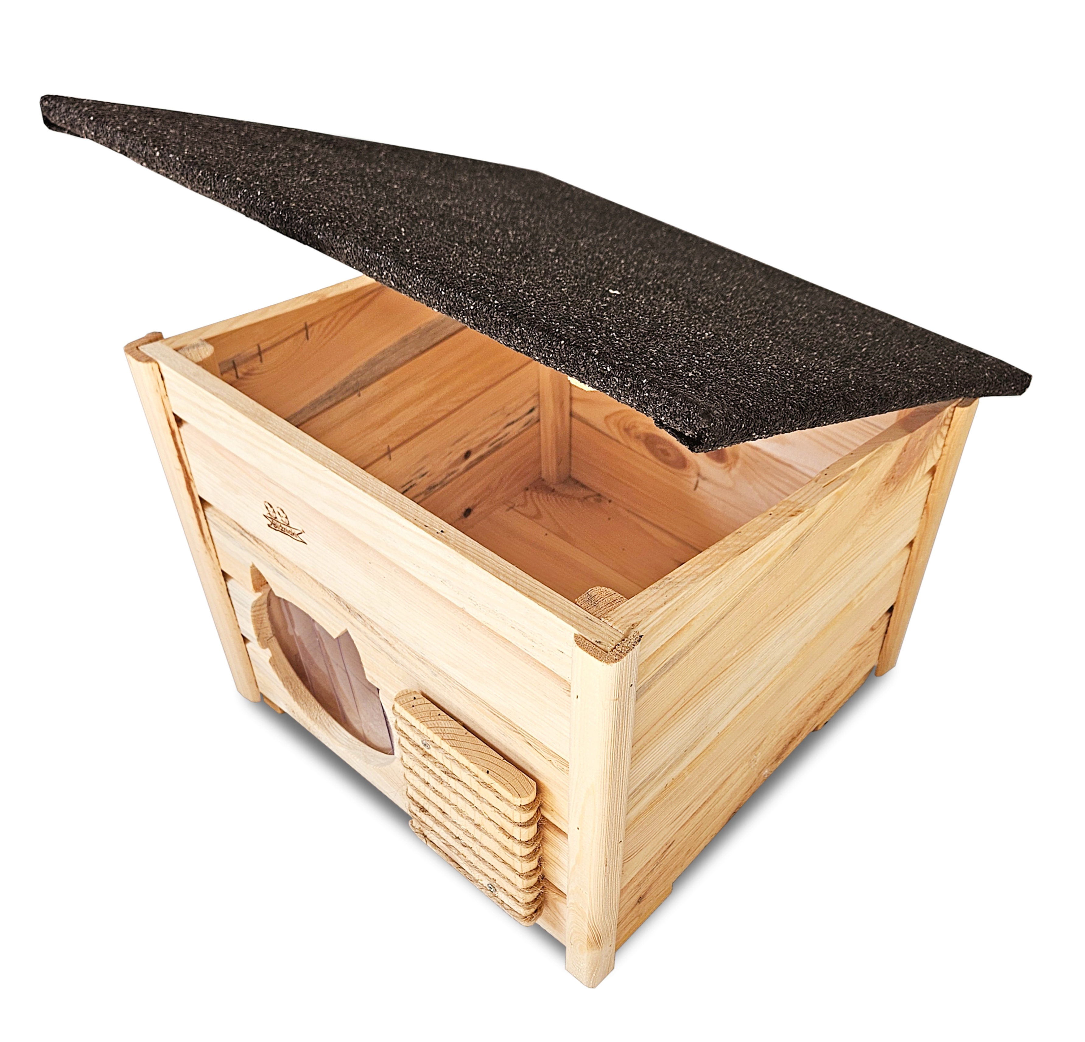 - Budka wyposażona została w drewnianą podłogę- zapewnia to jeszcze większą wygodę kotom i izolację od podłoża