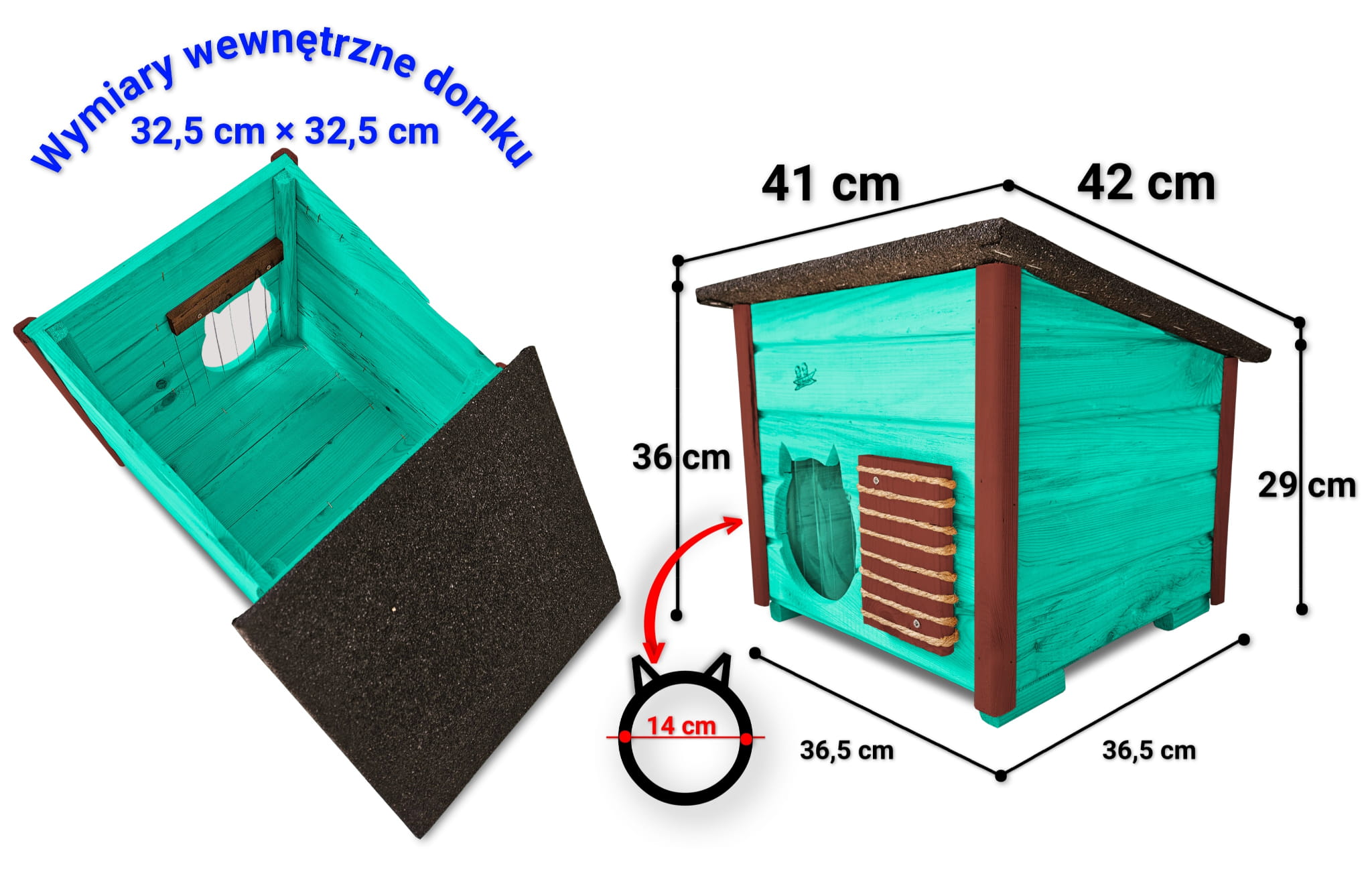 - Budka wyposażona została w drewnianą podłogę- zapewnia to jeszcze większą wygodę kotom i izolację od podłoża
