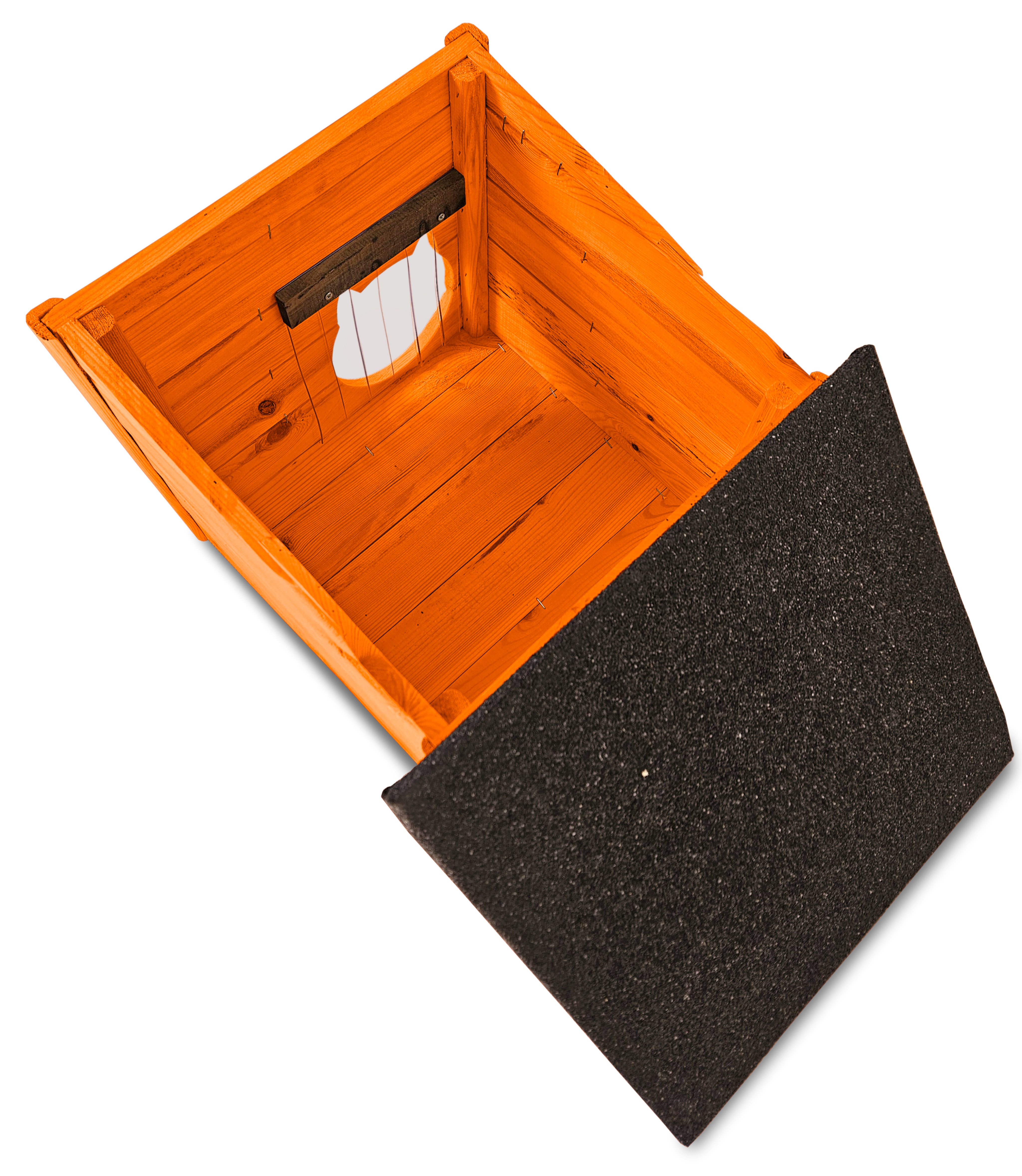 - Dach jest łatwo zdejmowany, co ułatwia uzupełnienie budki posłaniem lub jej czyszczeniem