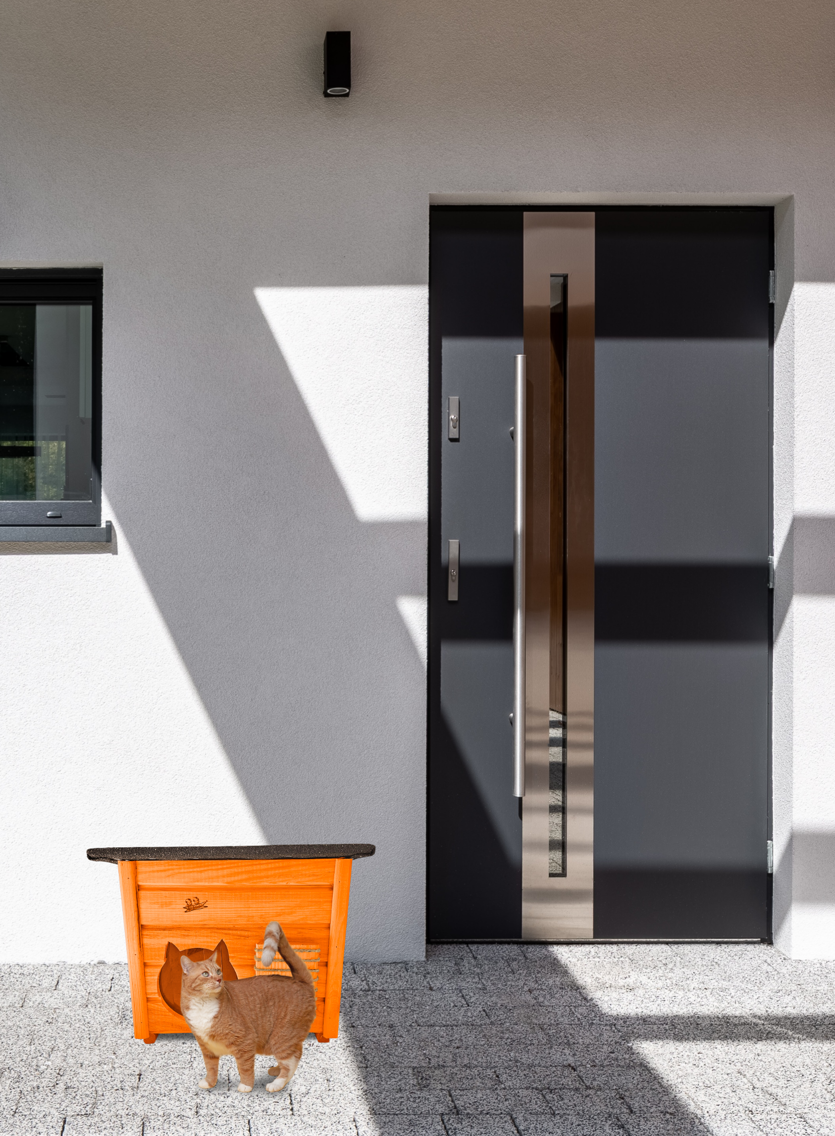 DOMEK dla KOTA ma ozdobne wejście i kolor, który dodaje walorów dekoracyjnych.