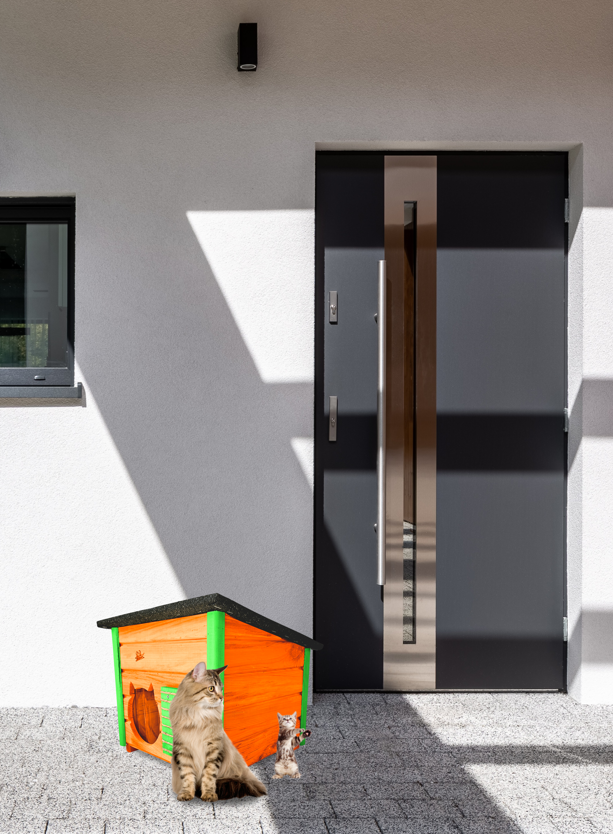 DOMEK dla KOTA ma ozdobne wejście i kolor, który dodaje walorów dekoracyjnych.