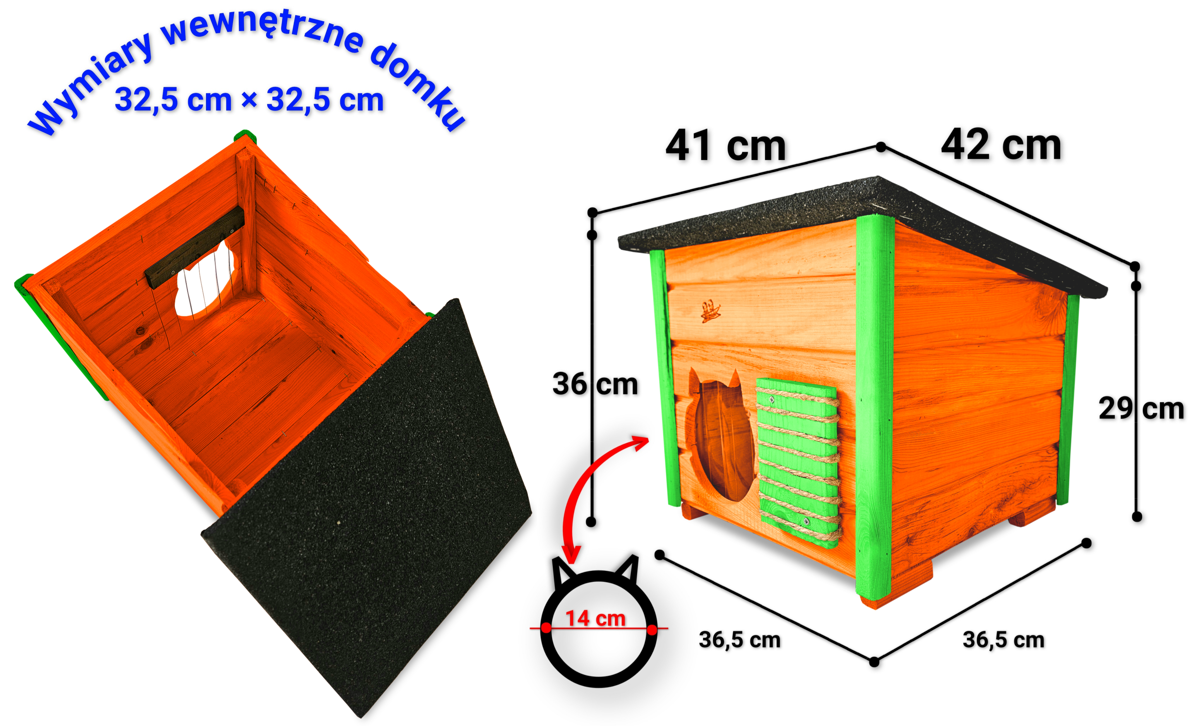 - wejście do domku ma odpowiedni duży otwór 14 cm