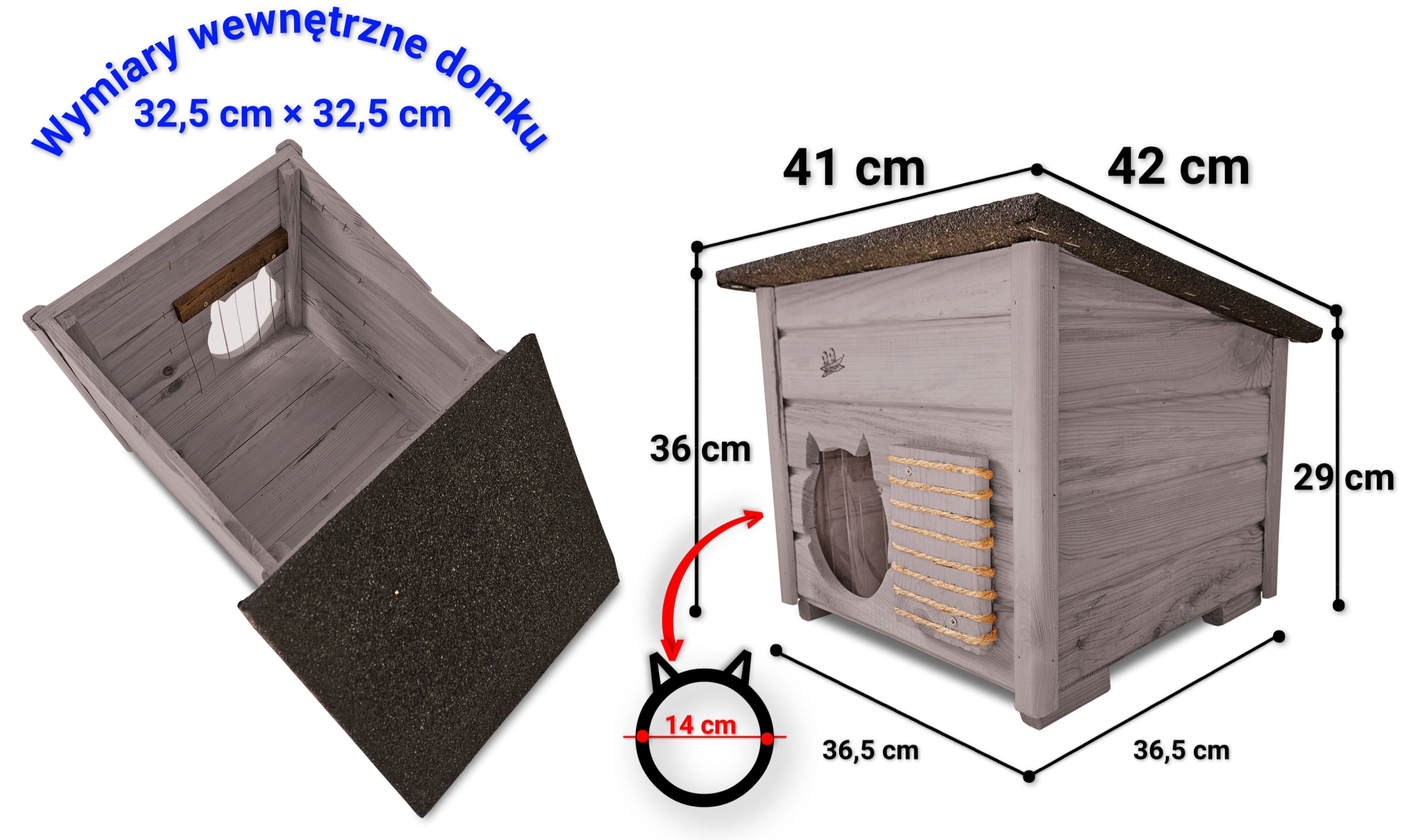 - wejście do domku ma odpowiedni duży otwór 14 cm