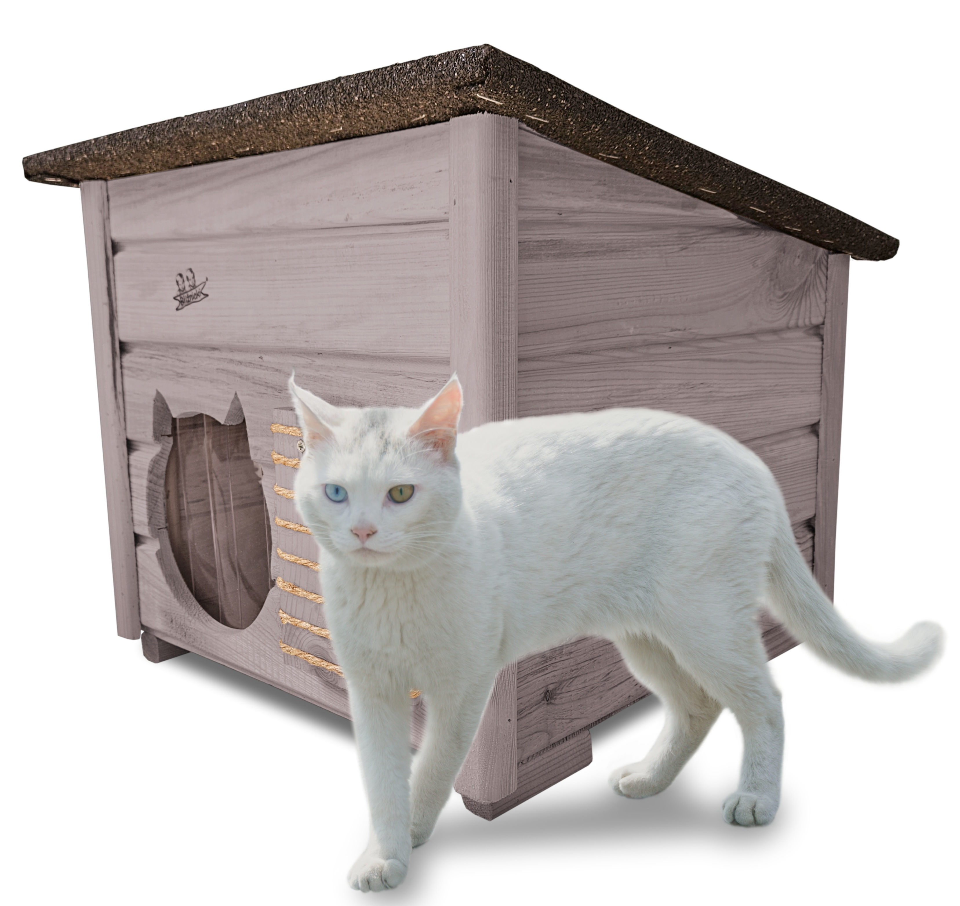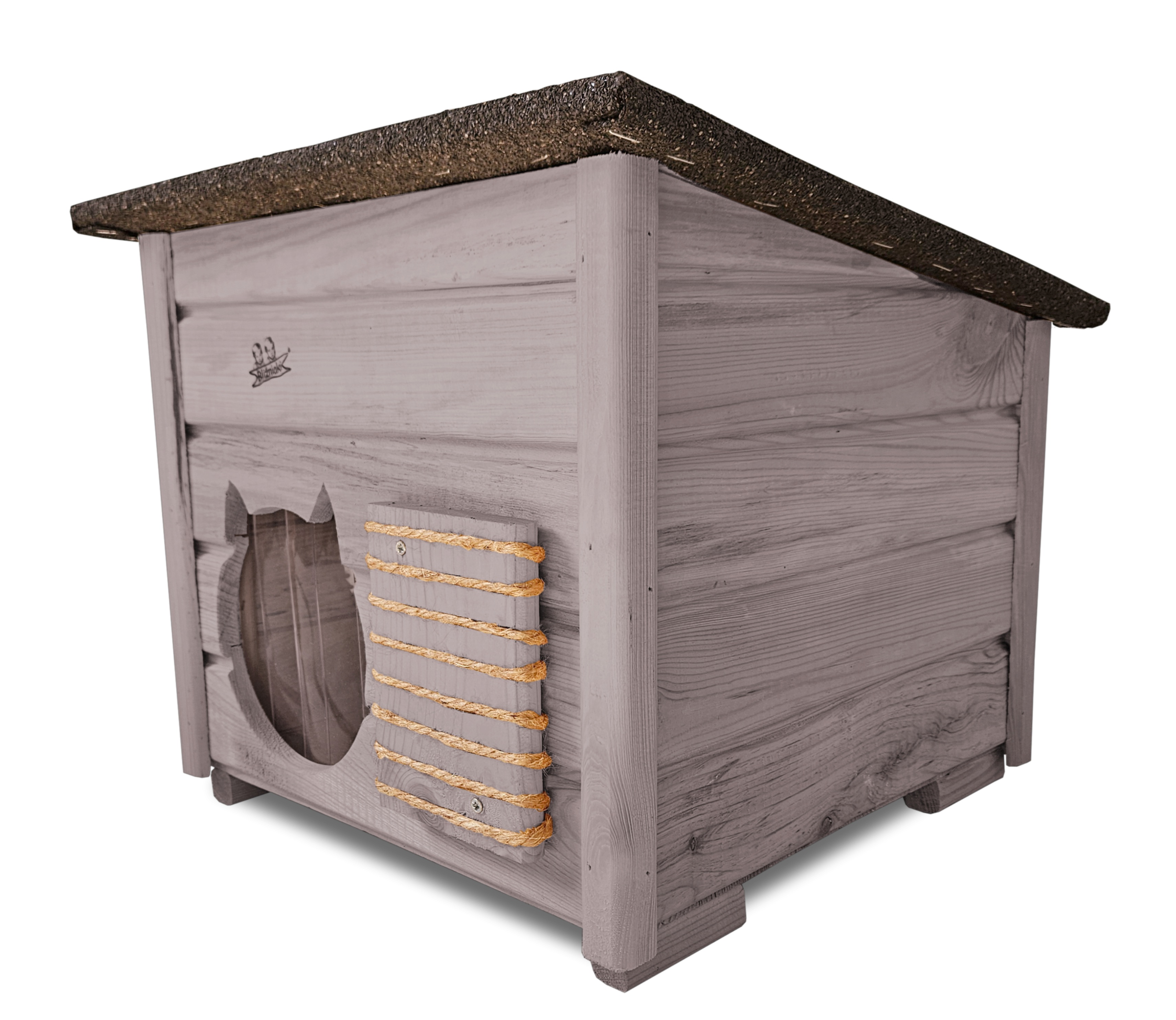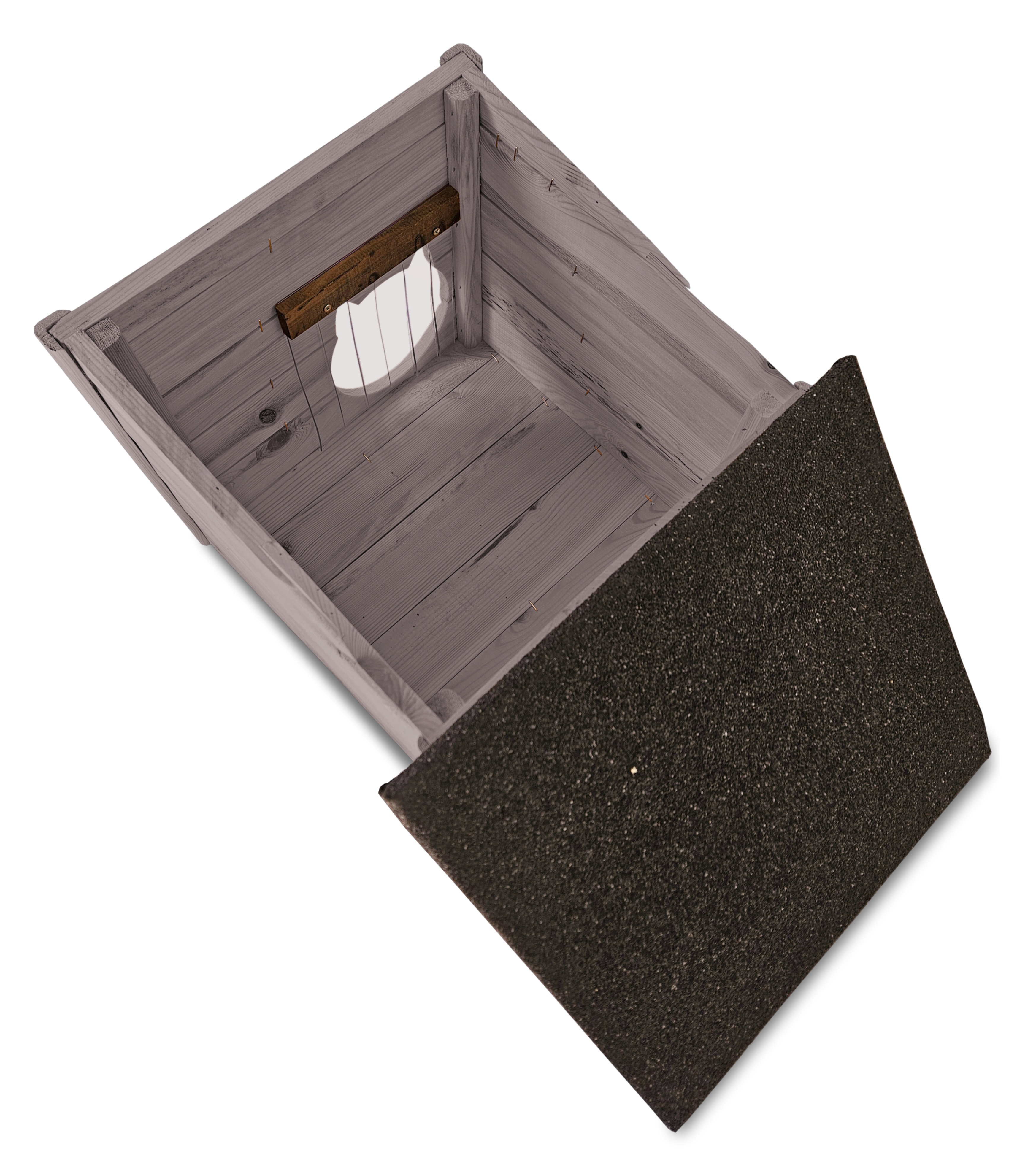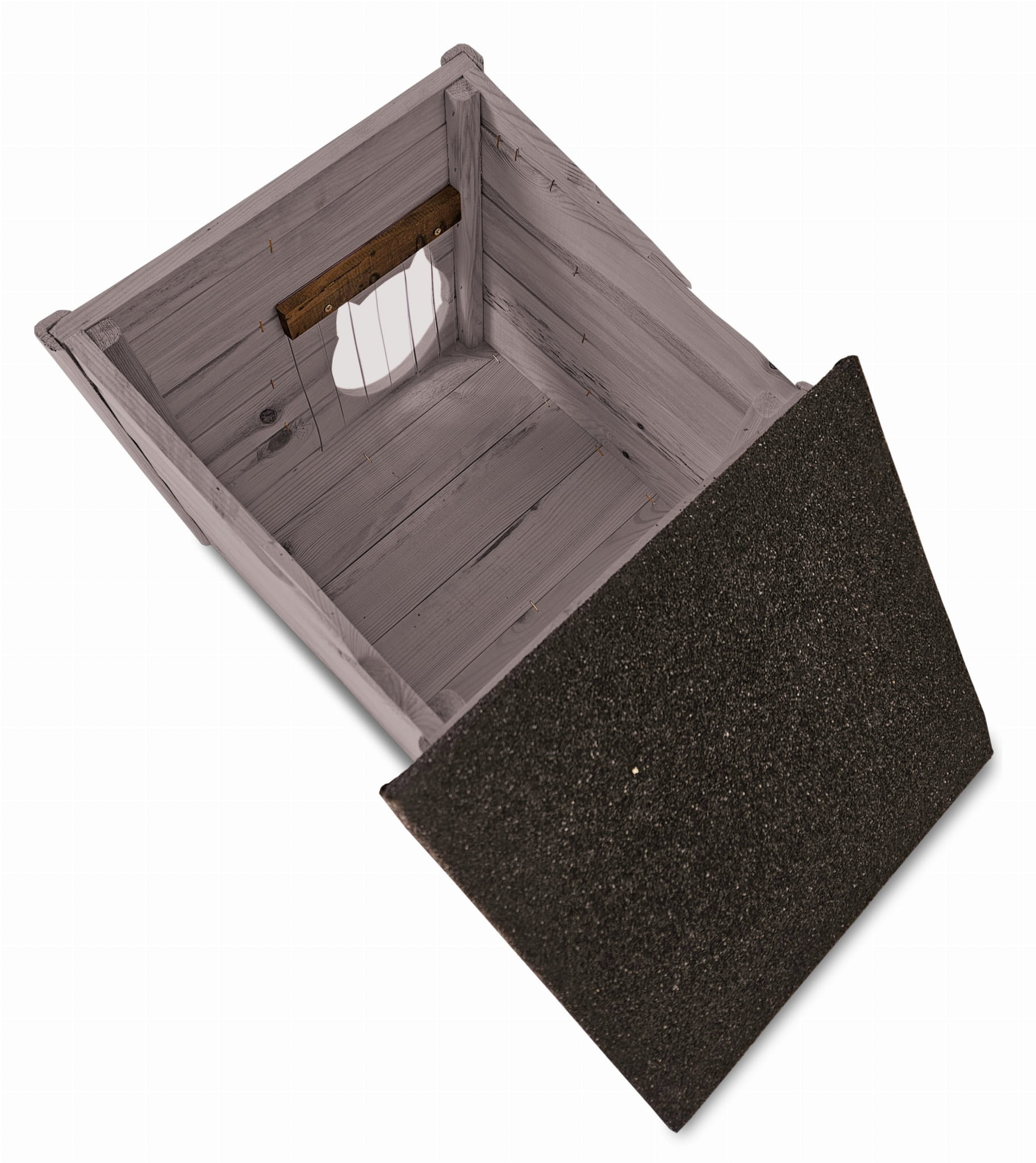 - Budka wyposażona została w drewnianą podłogę- zapewnia to jeszcze większą wygodę kotom i izolację od podłoża