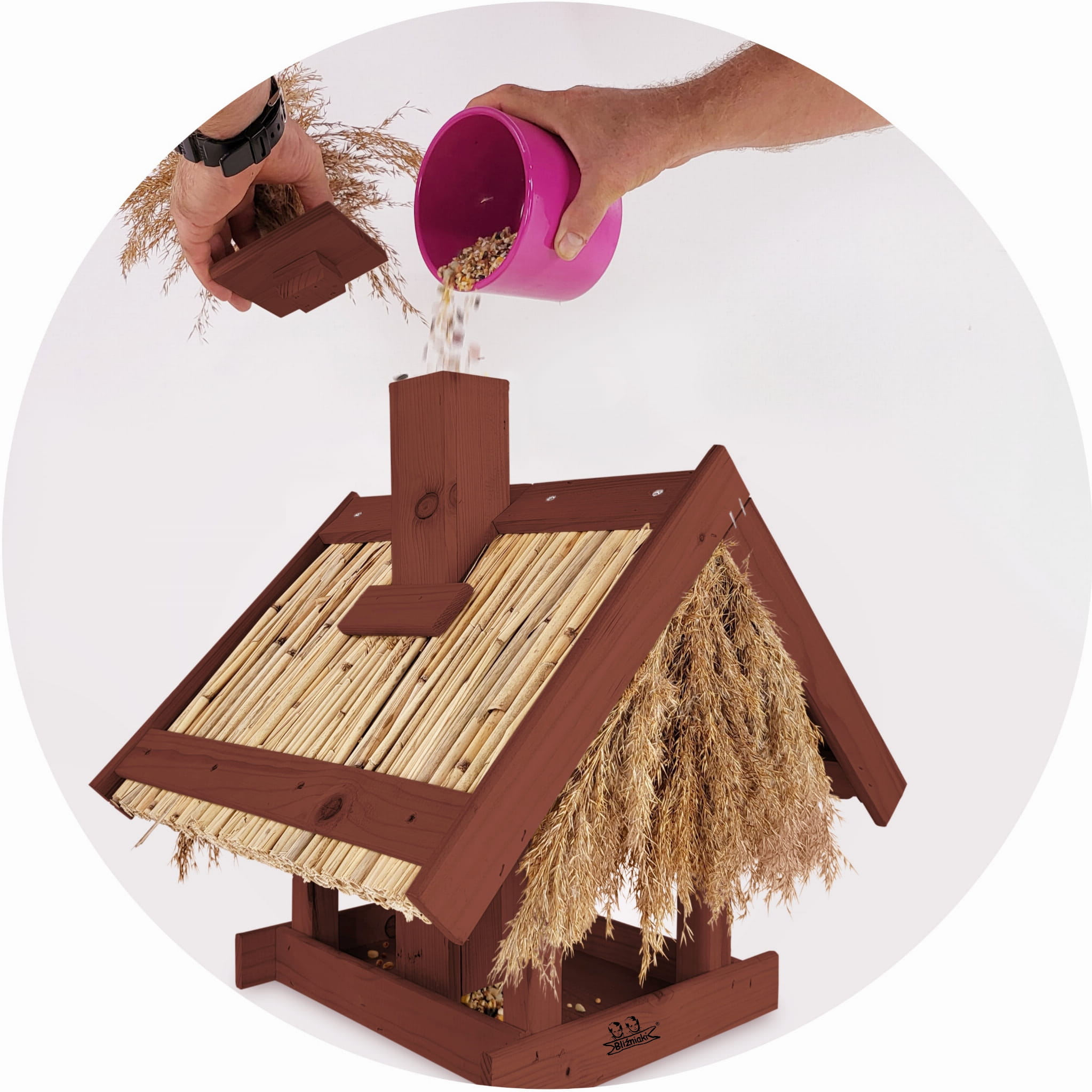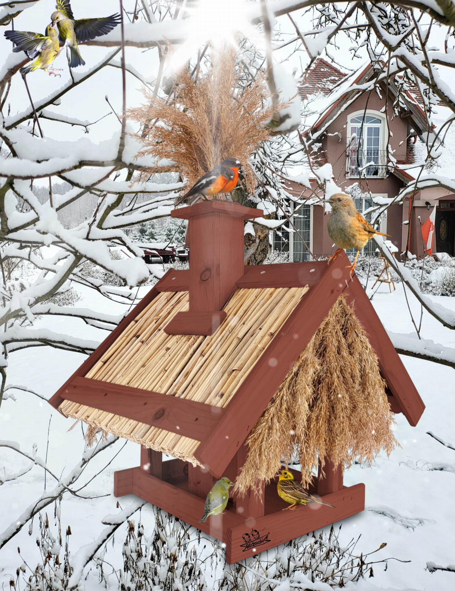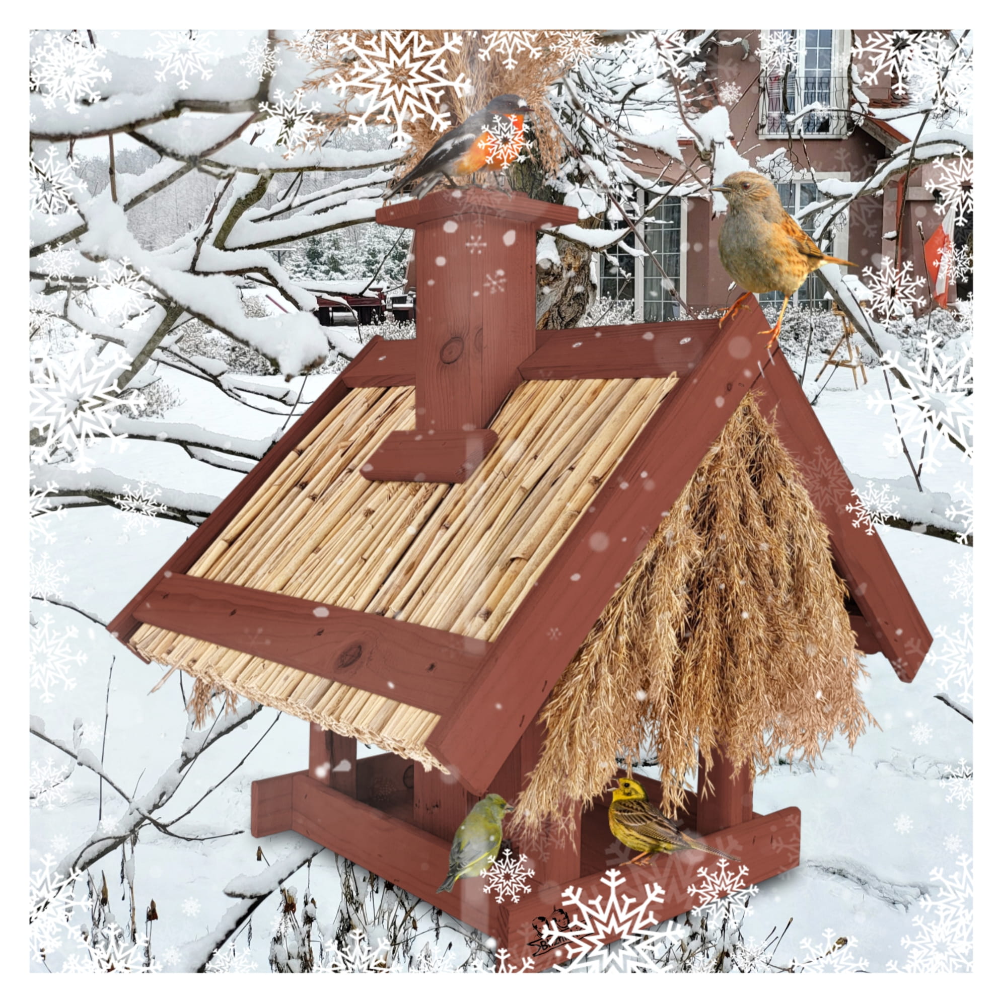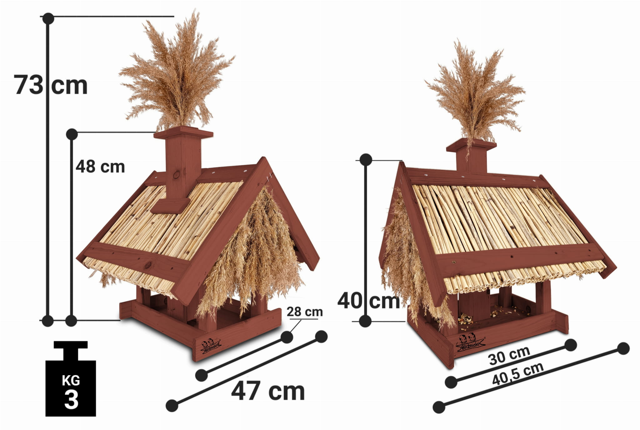 Karmnik dla ptaków został wykonany w przeważającej części z drewna, konstrukcja wyposażona w solidny dach na którym jest trzcinowa słoma, karmnik uwieńczony kominem na szczycie którego jest pióropusz z trzciny oraz zwisające kurtyny z trzciny z wiatrownic ochraniające przebywające ptaki wewnątrz karmnika przed drapieżnikami, aby w spokoju mogły zjeść pokarm z dozownika ziarna a także te zwisajace kurtyny trzcinowe osłabiają pokarm przed zacinającym deszczem, wiatrem czy śniegiem. Karmnik wysyłany w postaci zmontowanej, nie wymaga samodzielnego montażu.