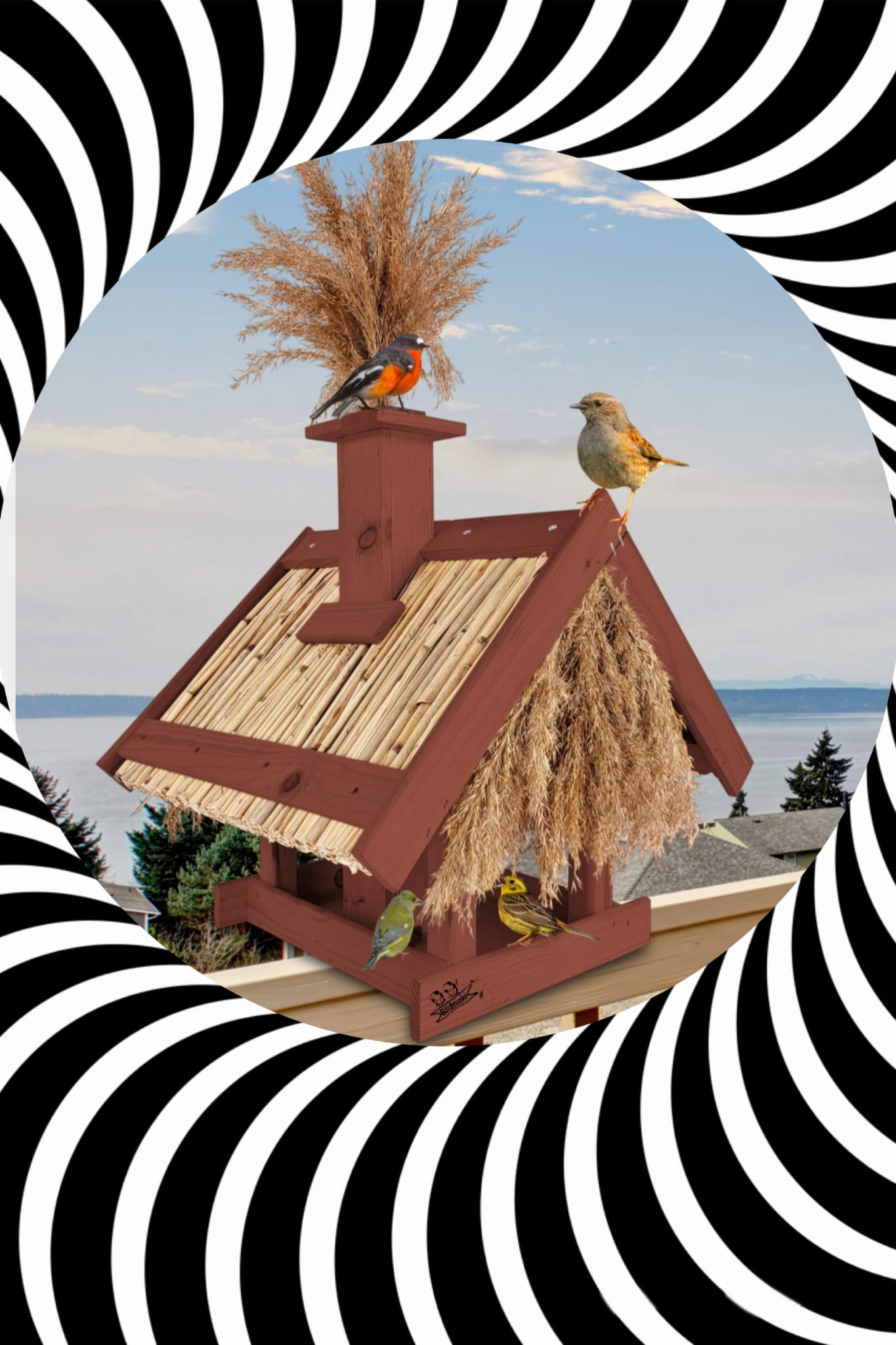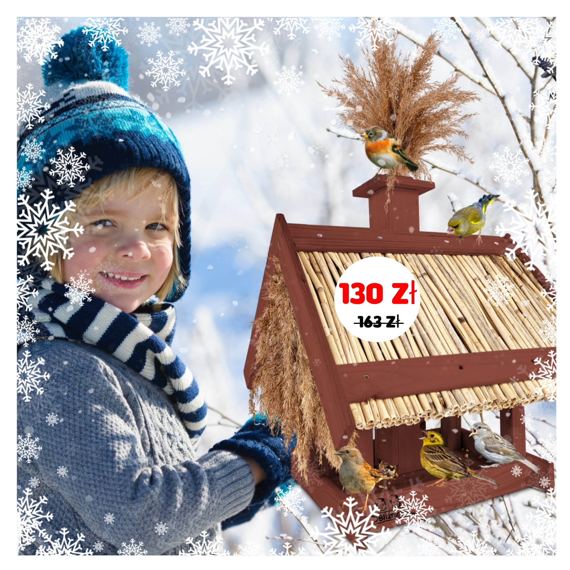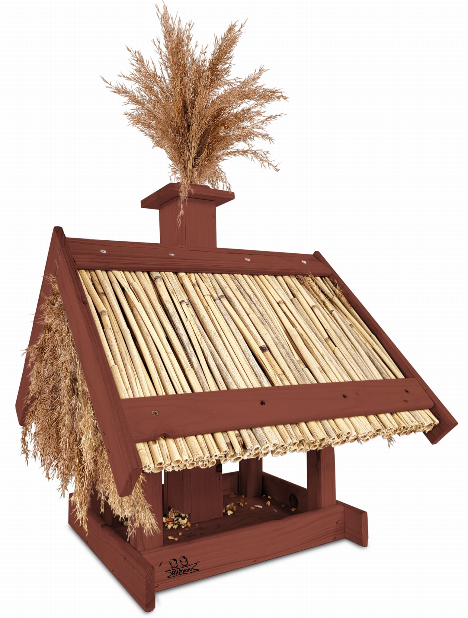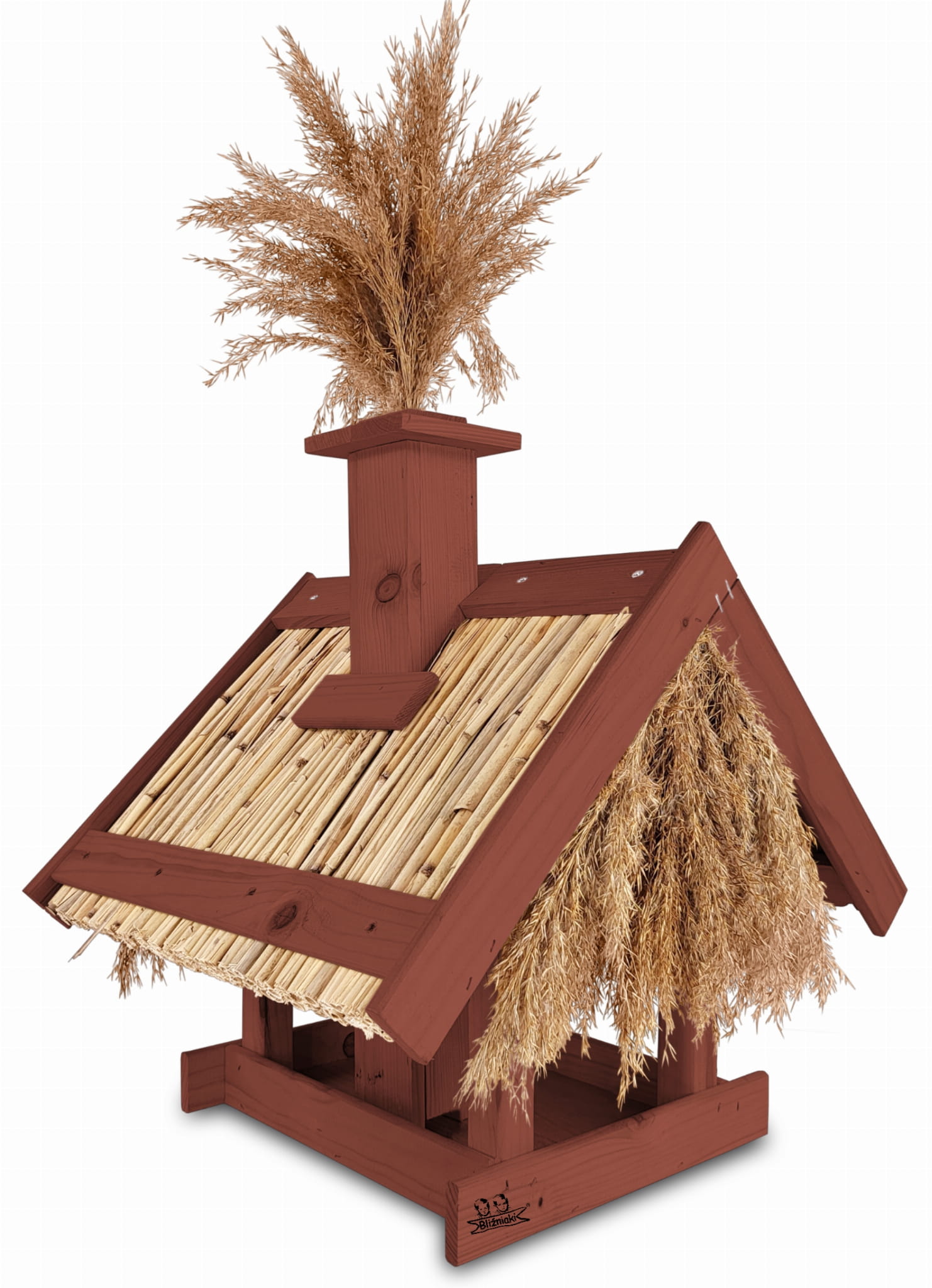 Karmnik dla ptaków został wykonany w przeważającej części z drewna, konstrukcja wyposażona w solidny dach na którym jest trzcinowa słoma, karmnik uwieńczony kominem na szczycie którego jest pióropusz z trzciny oraz zwisające kurtyny z trzciny z wiatrownic ochraniające przebywające ptaki wewnątrz karmnika przed drapieżnikami, aby w spokoju mogły zjeść pokarm z dozownika ziarna a także te zwisajace kurtyny trzcinowe osłabiają pokarm przed zacinającym deszczem, wiatrem czy śniegiem. Karmnik wysyłany w postaci zmontowanej, nie wymaga samodzielnego montażu.