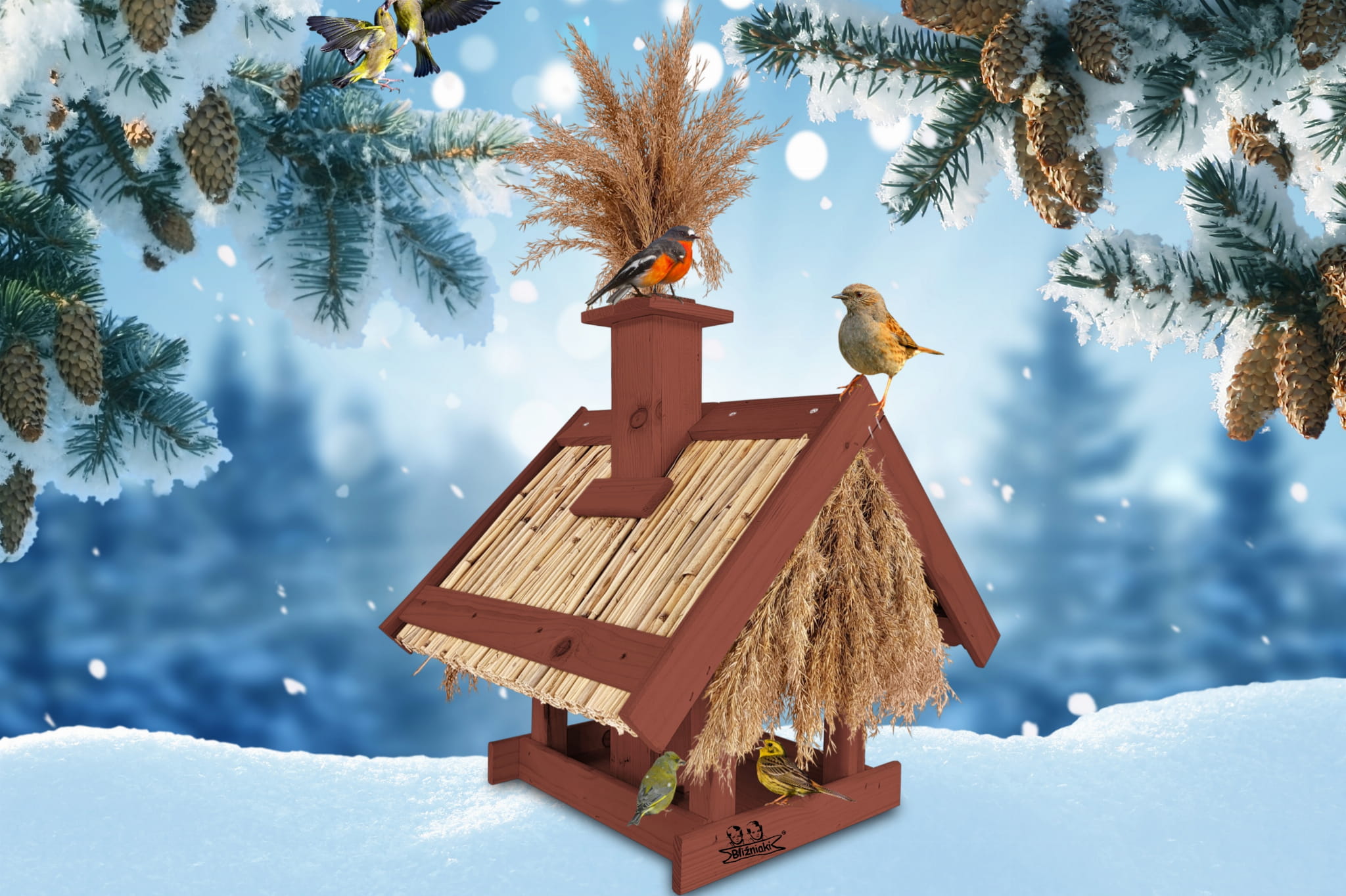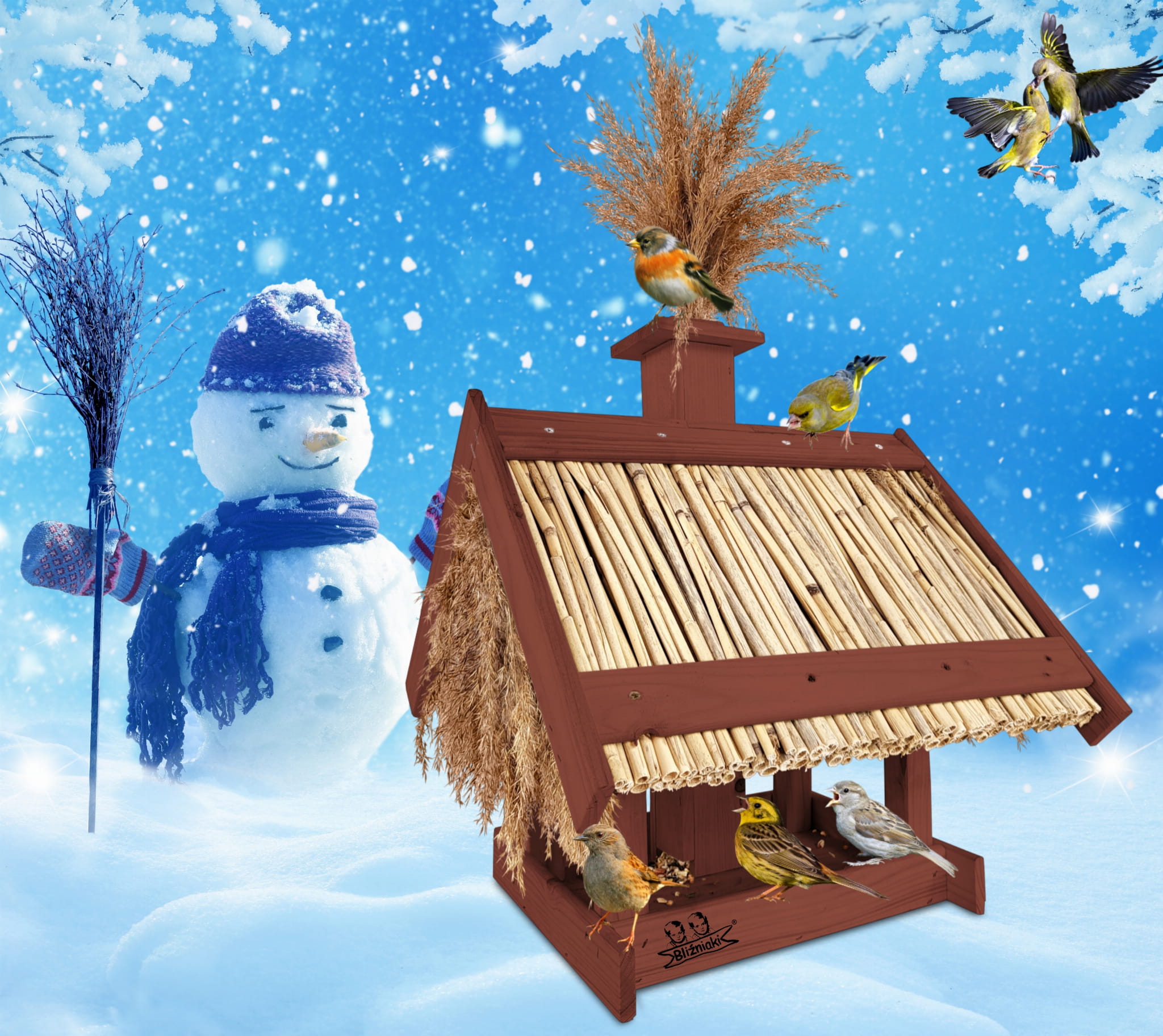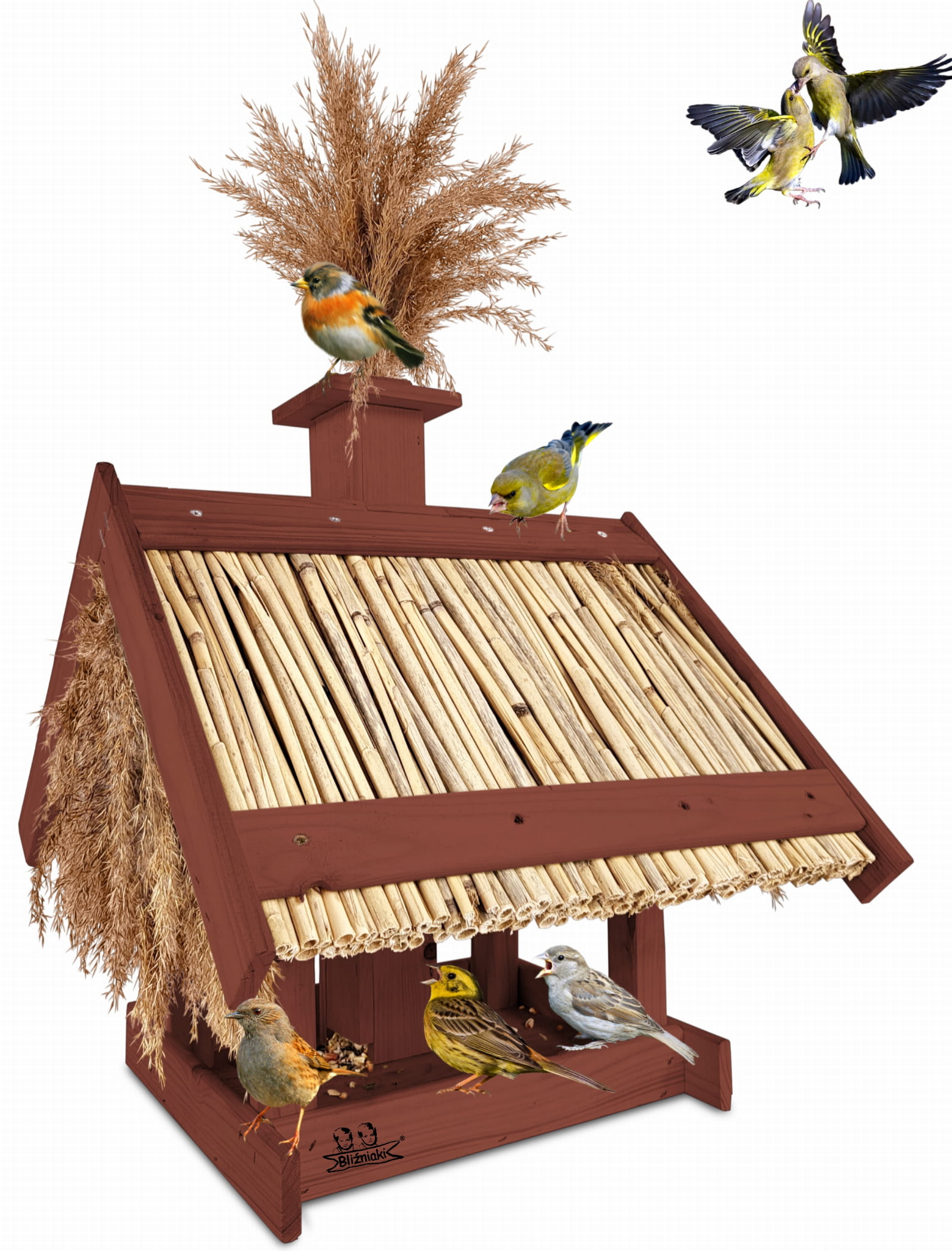 Jego dodatkowy atut to naturalny wygląd oraz gruba solidna warstwa izolująca i ocieplająca karmnik ze strzechy . Karmnik dla ptaków dzięki naturalnego poszyciu dachowemu cechuje się naturalnym wyglądem, może jednocześnie stanowić bazę do aranżacji. Na dachu z trzciny można wykładać owoce jarzębiny jako dekorację i pożywienie dla ptaków.