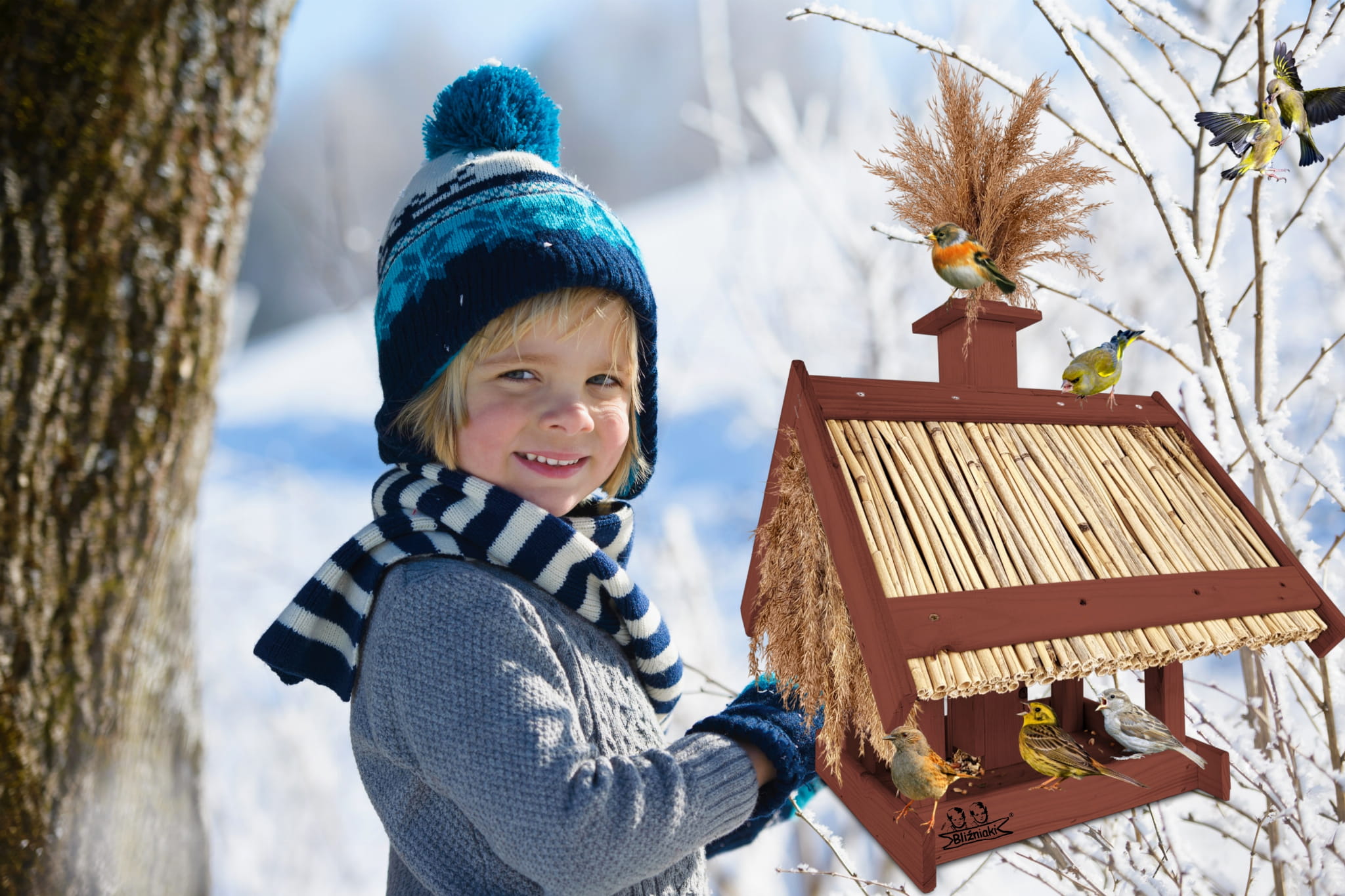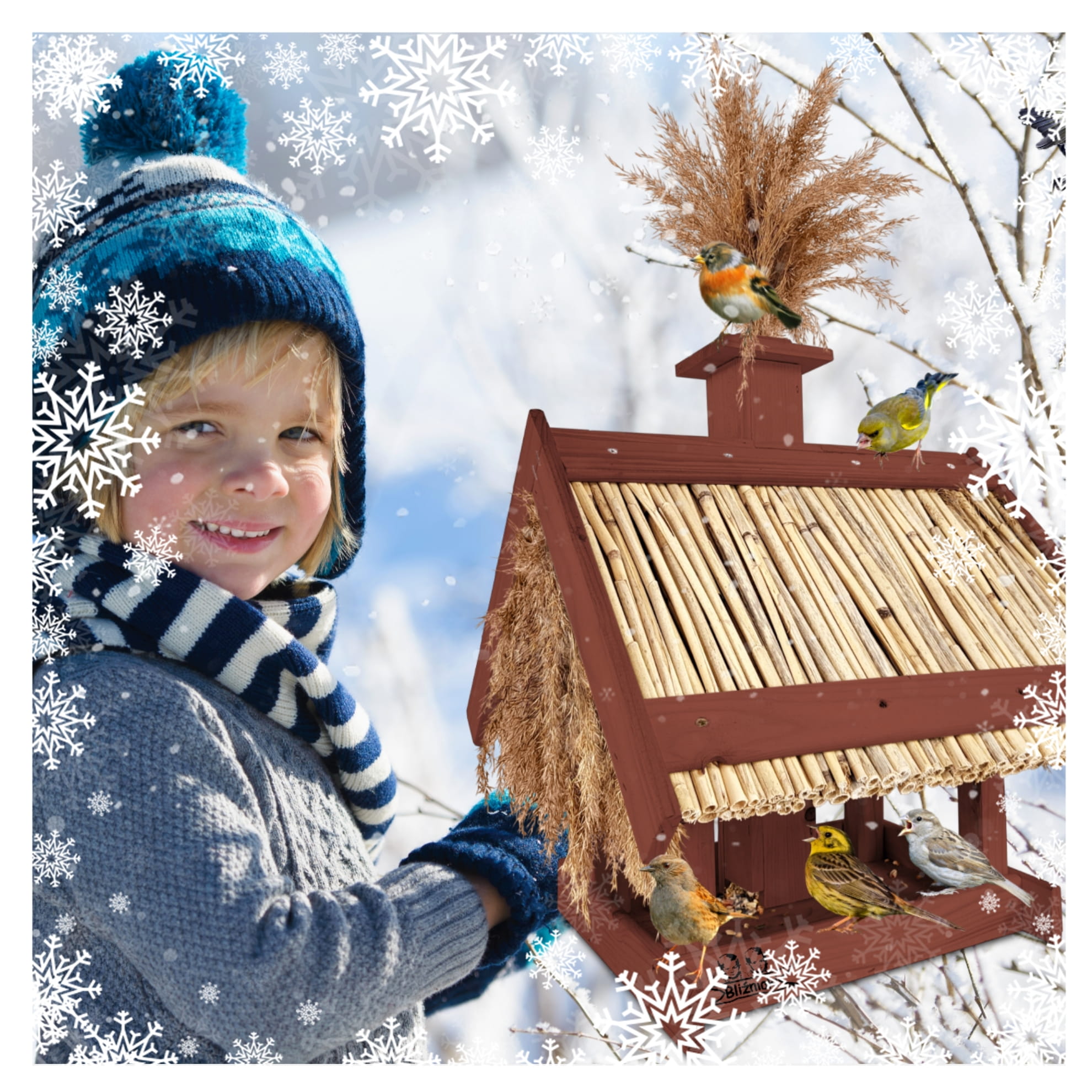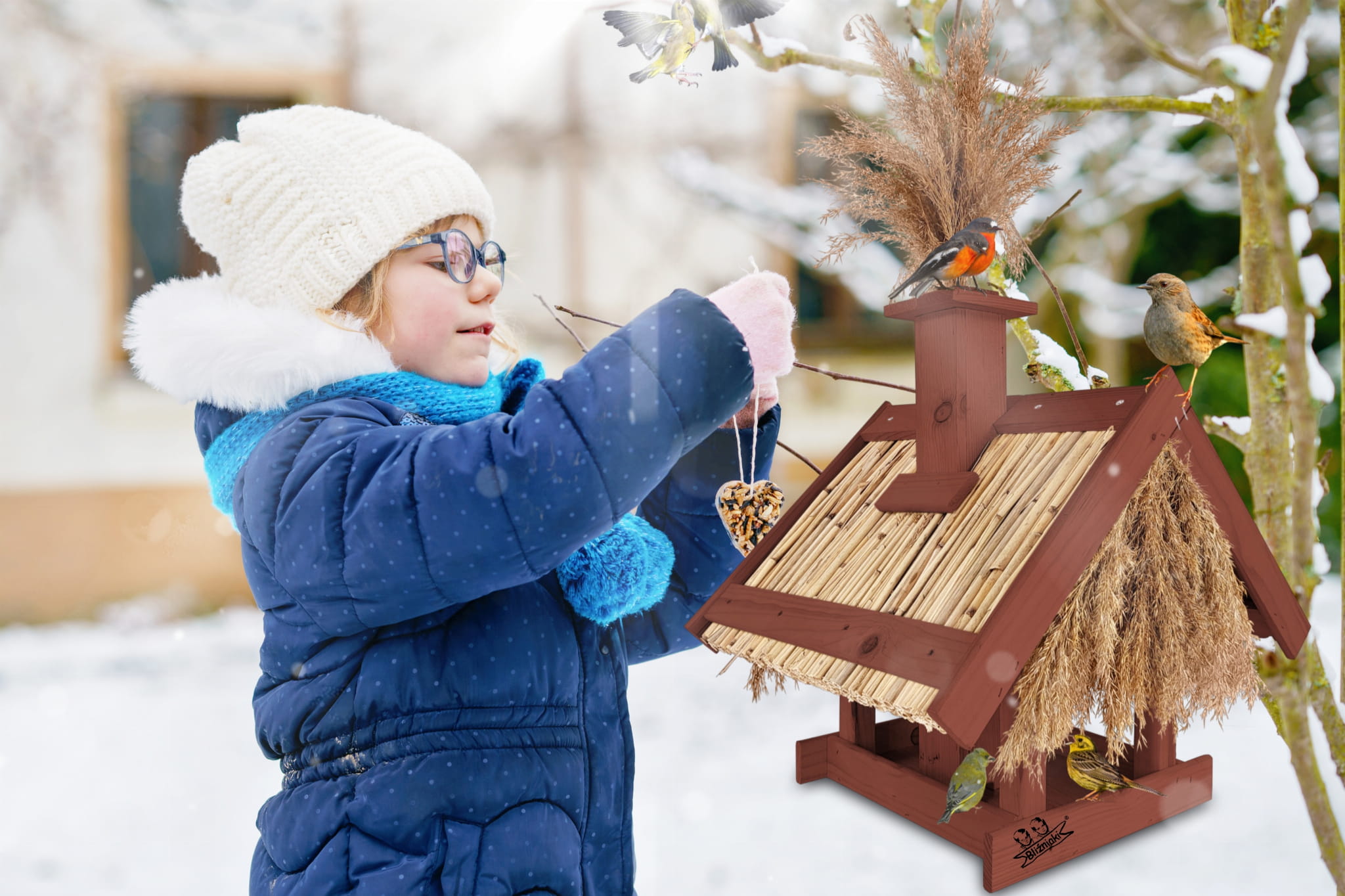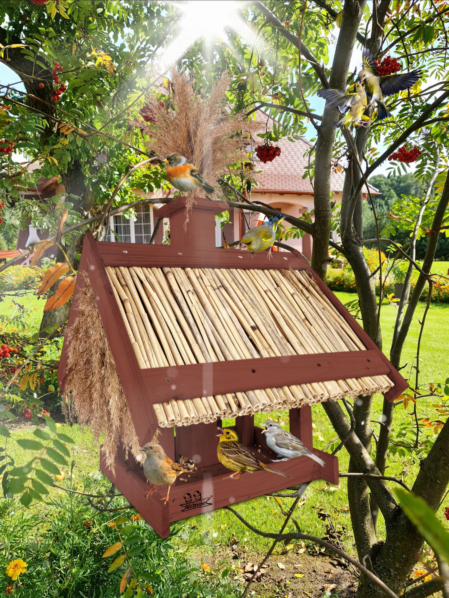 Jego dodatkowy atut to naturalny wygląd oraz gruba solidna warstwa izolująca i ocieplająca karmnik ze strzechy . Karmnik dla ptaków dzięki naturalnego poszyciu dachowemu cechuje się naturalnym wyglądem, może jednocześnie stanowić bazę do aranżacji. Na dachu z trzciny można wykładać owoce jarzębiny jako dekorację i pożywienie dla ptaków.