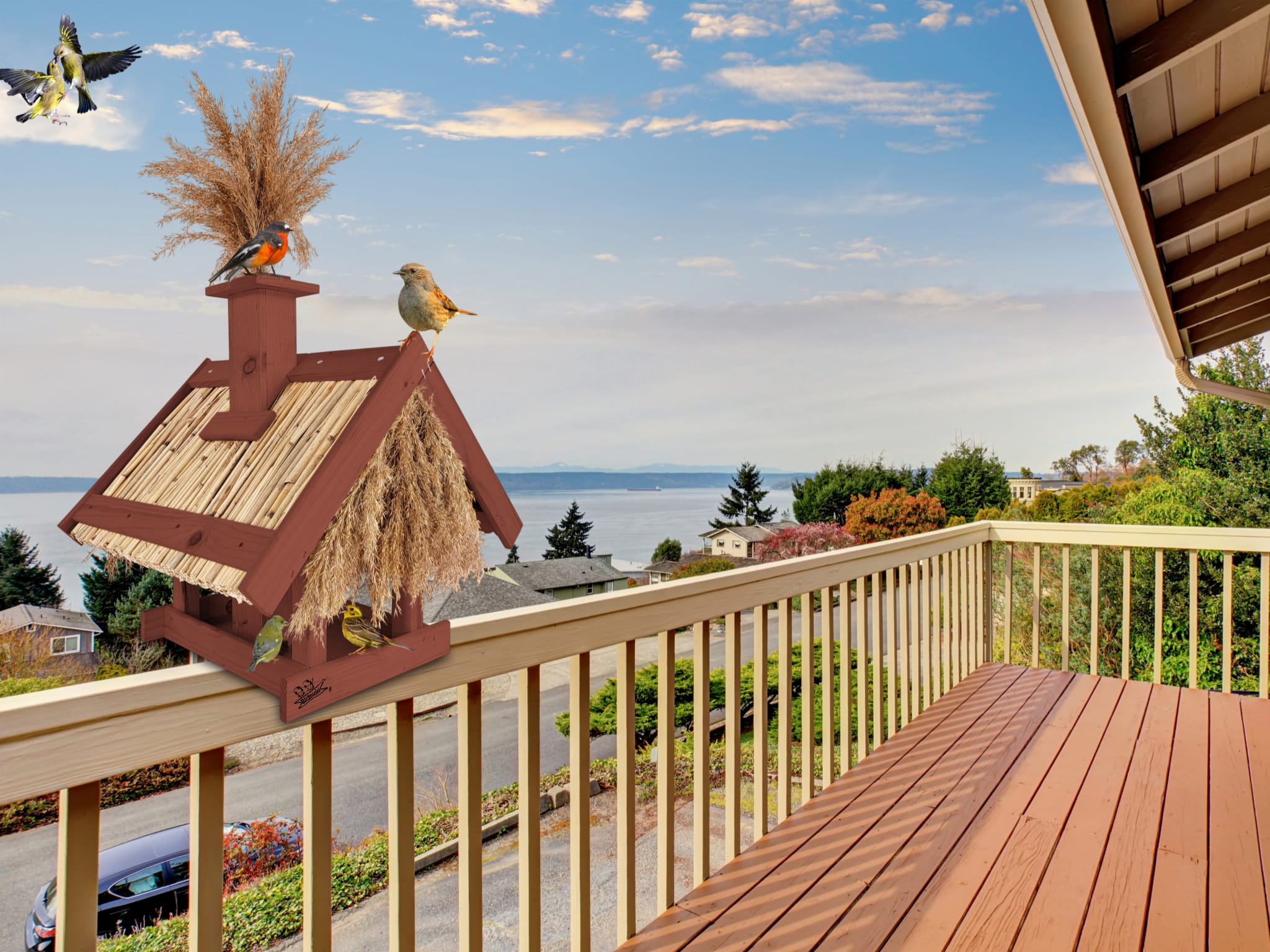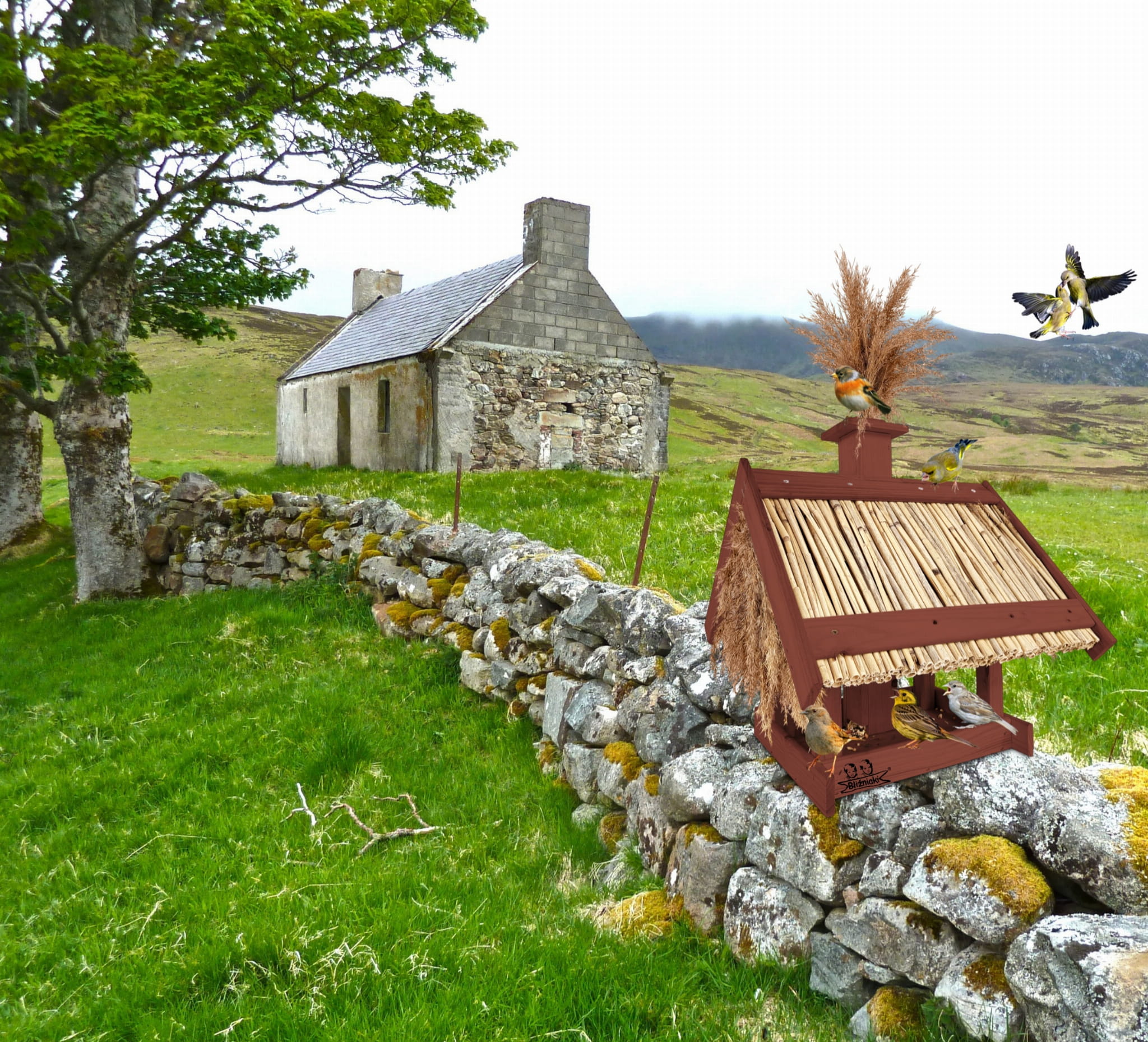- Na szczytach dachu jest kurtyna z trzciny, która dodatkowo zdobi karmnik a także chroni pokarm przed zamakaniem i wywiewaniem