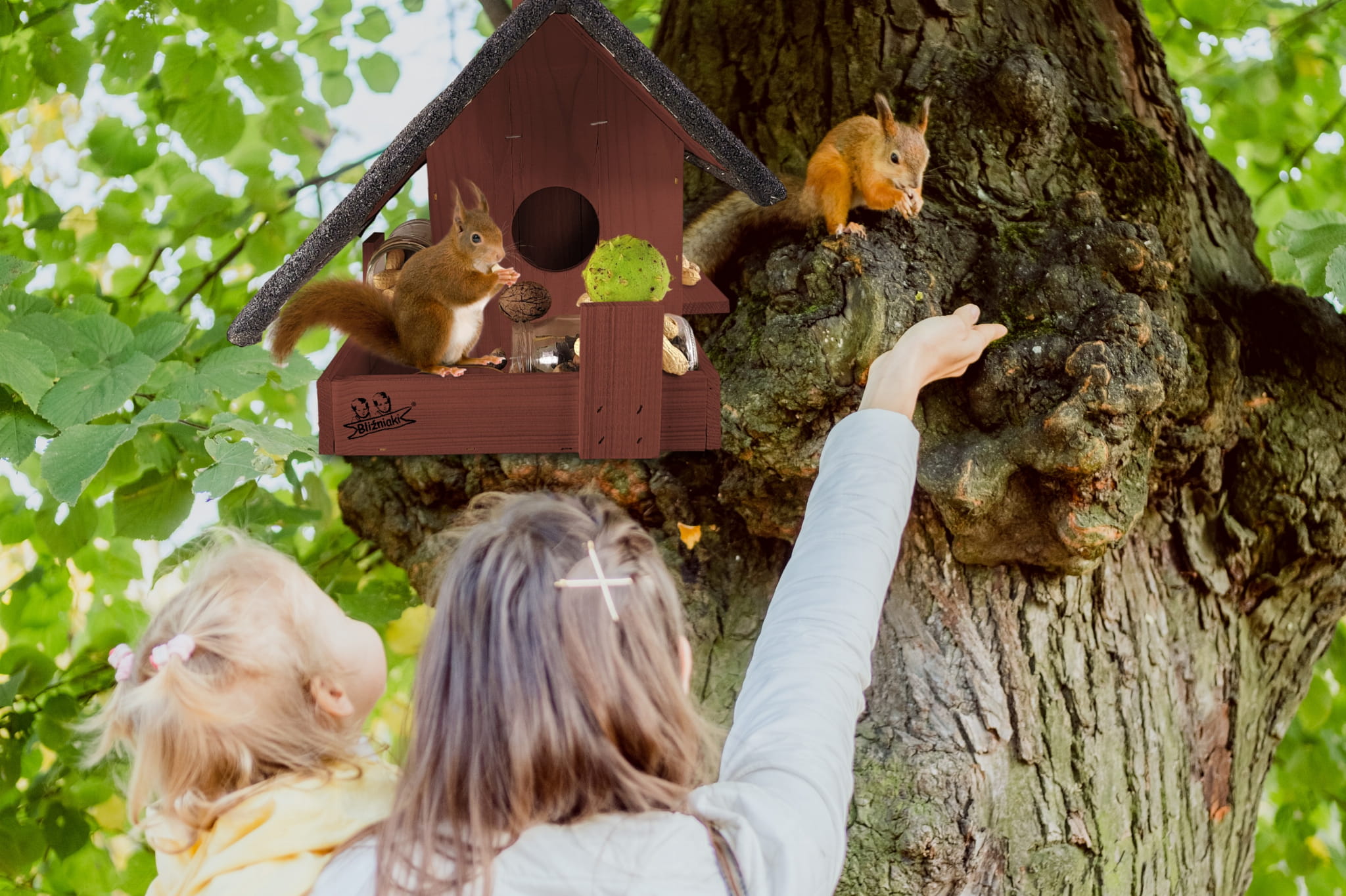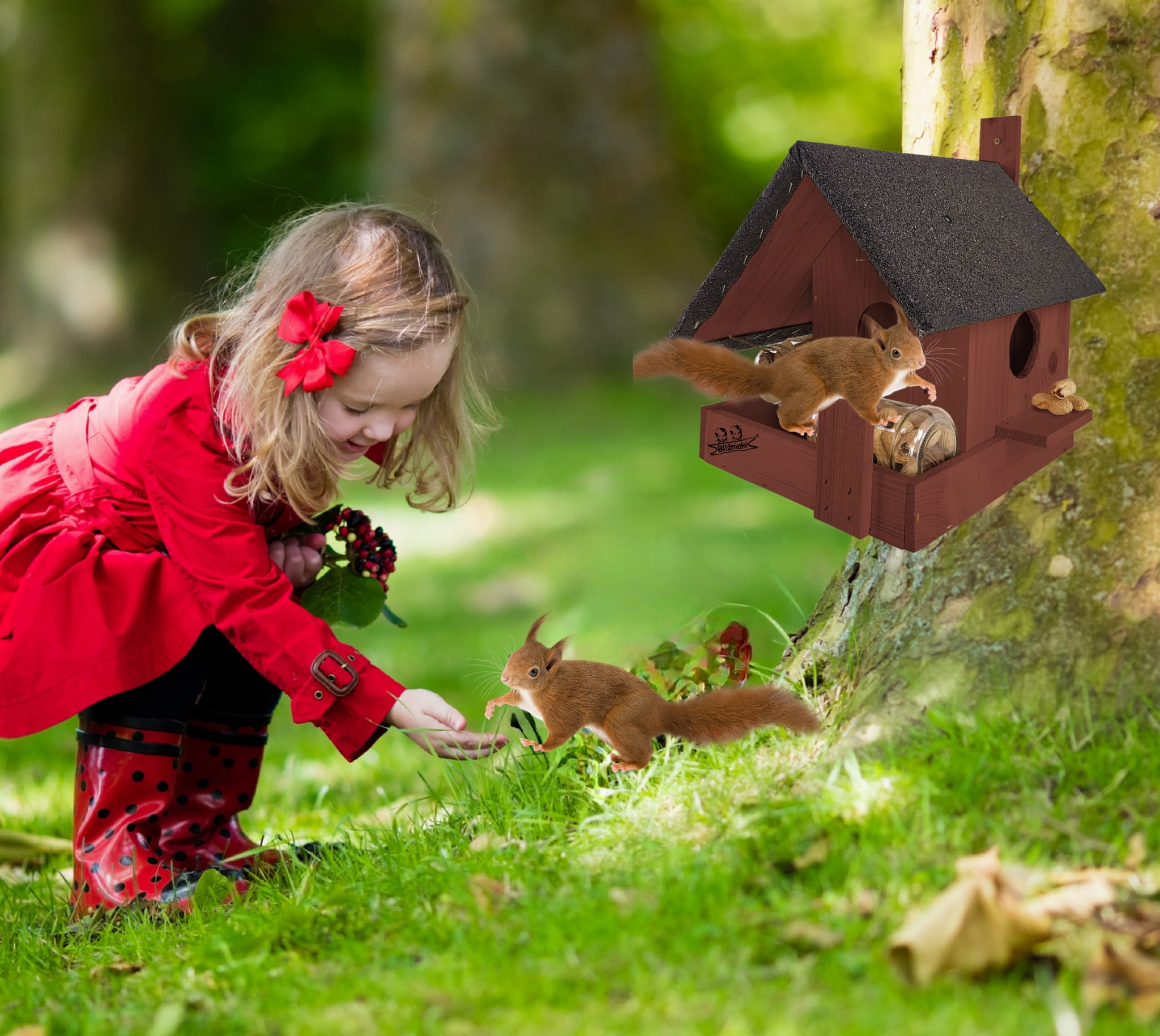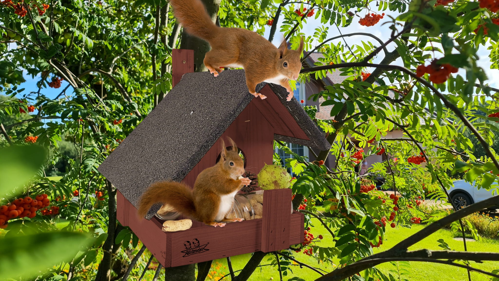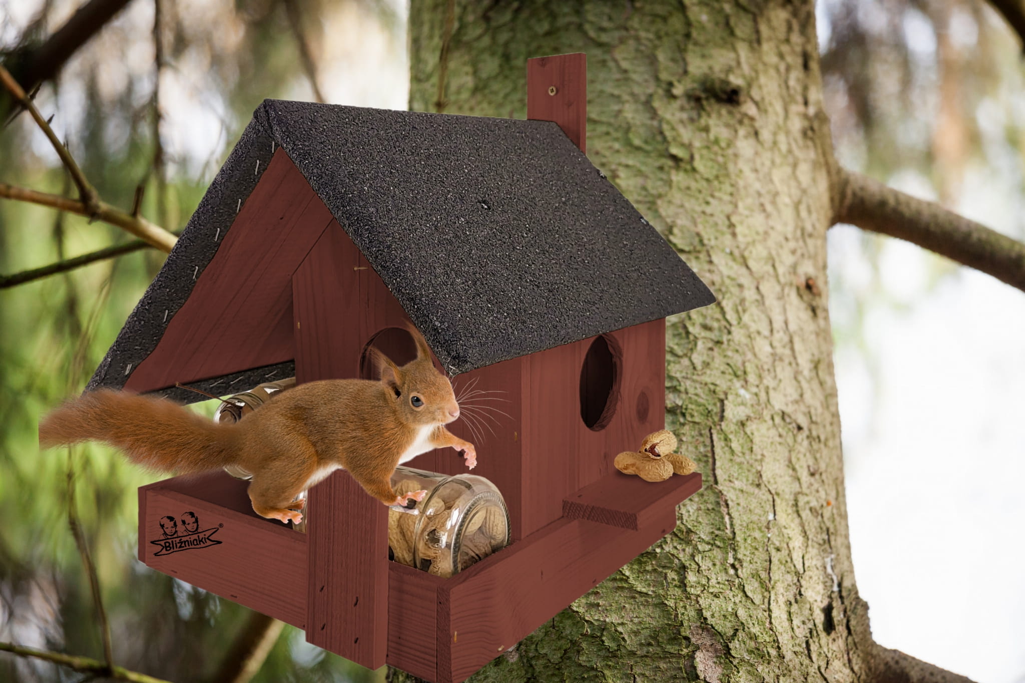 - Domek z pokarmem znakomicie przywabi wiewiórki, jest dla nich bezpieczny