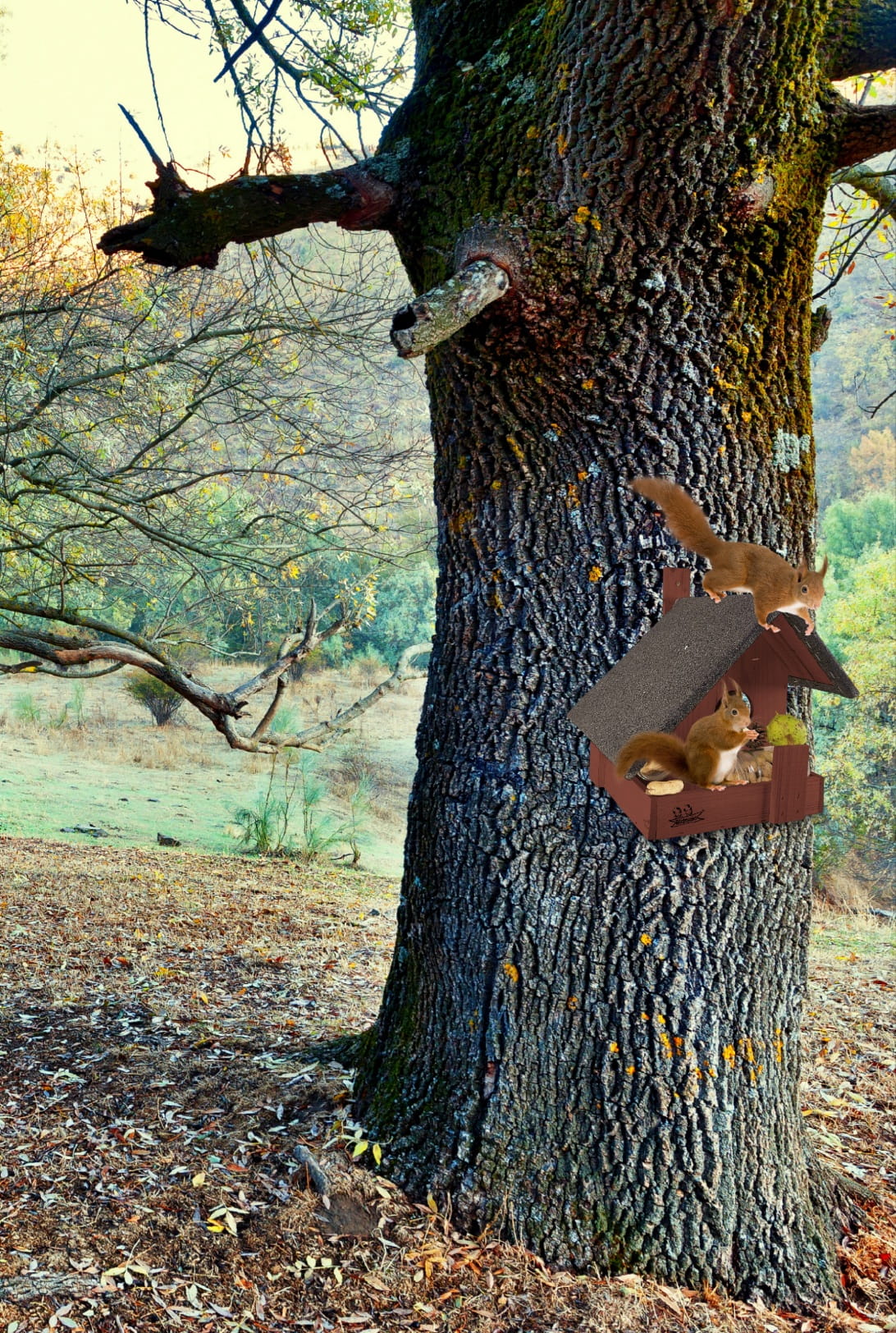 Domek z powodzeniem możesz umieścić na okolicznym drzewie lub postawić go w miejscu, do którego wiewiórki będą miały swobodny dostęp.