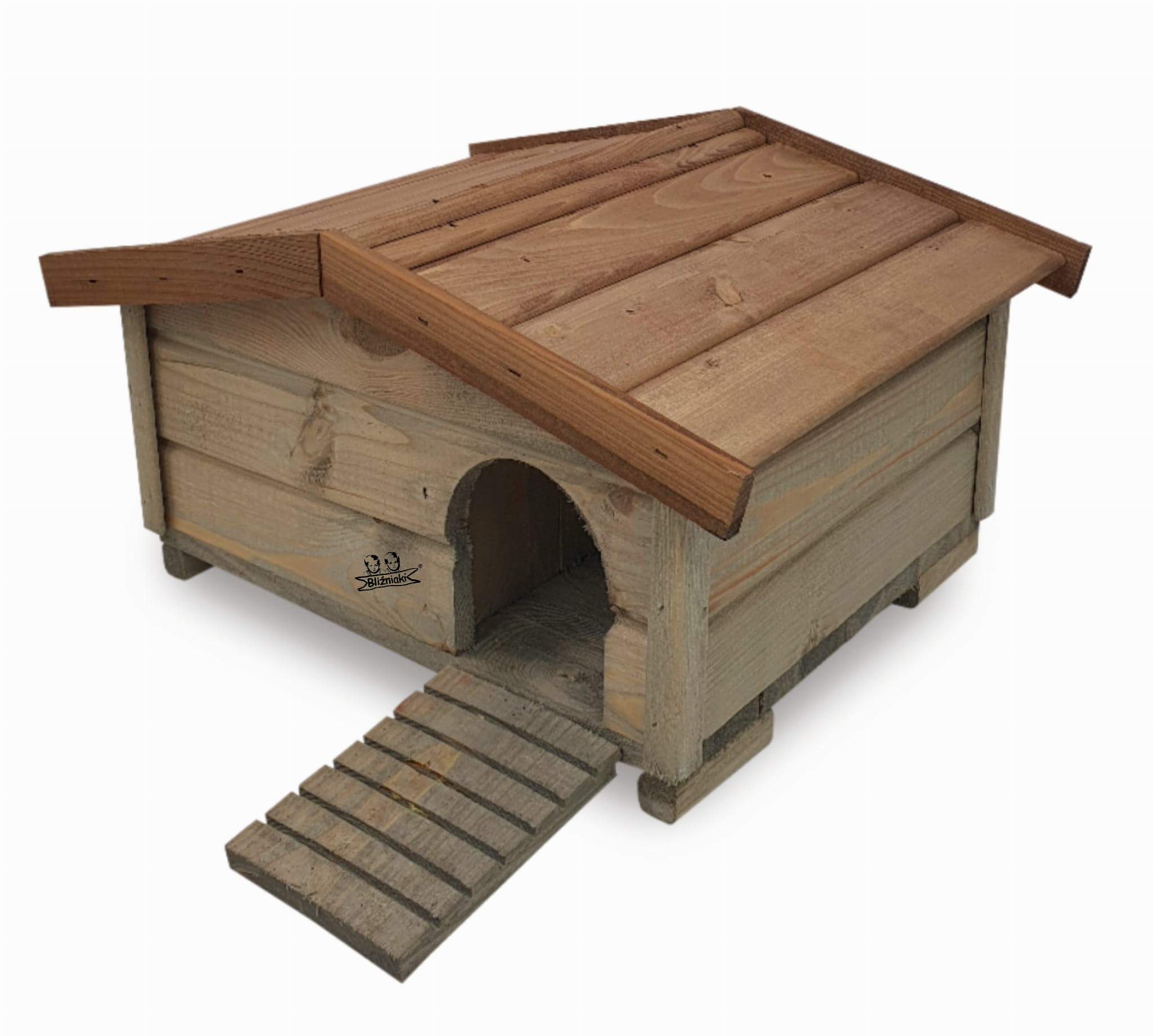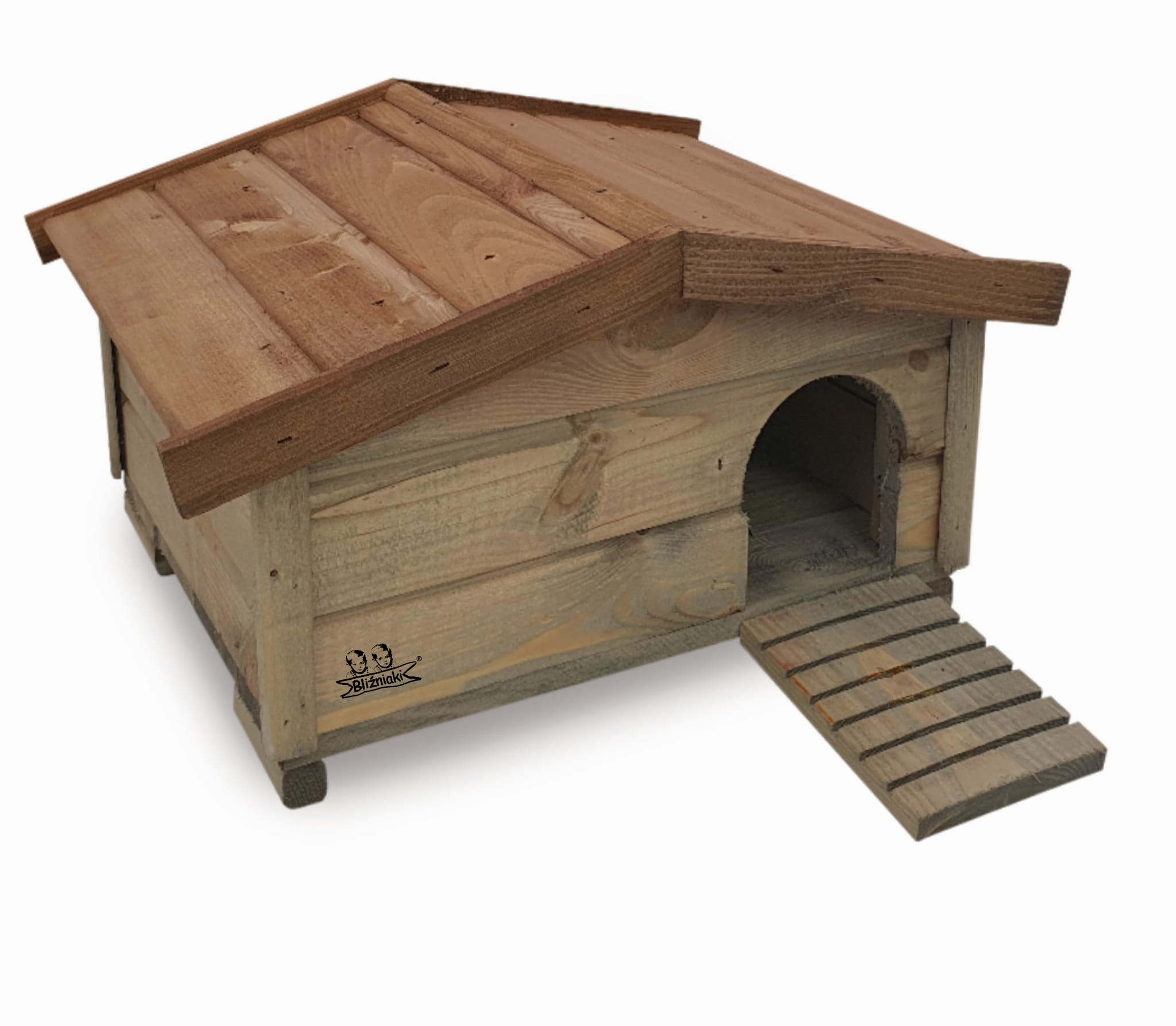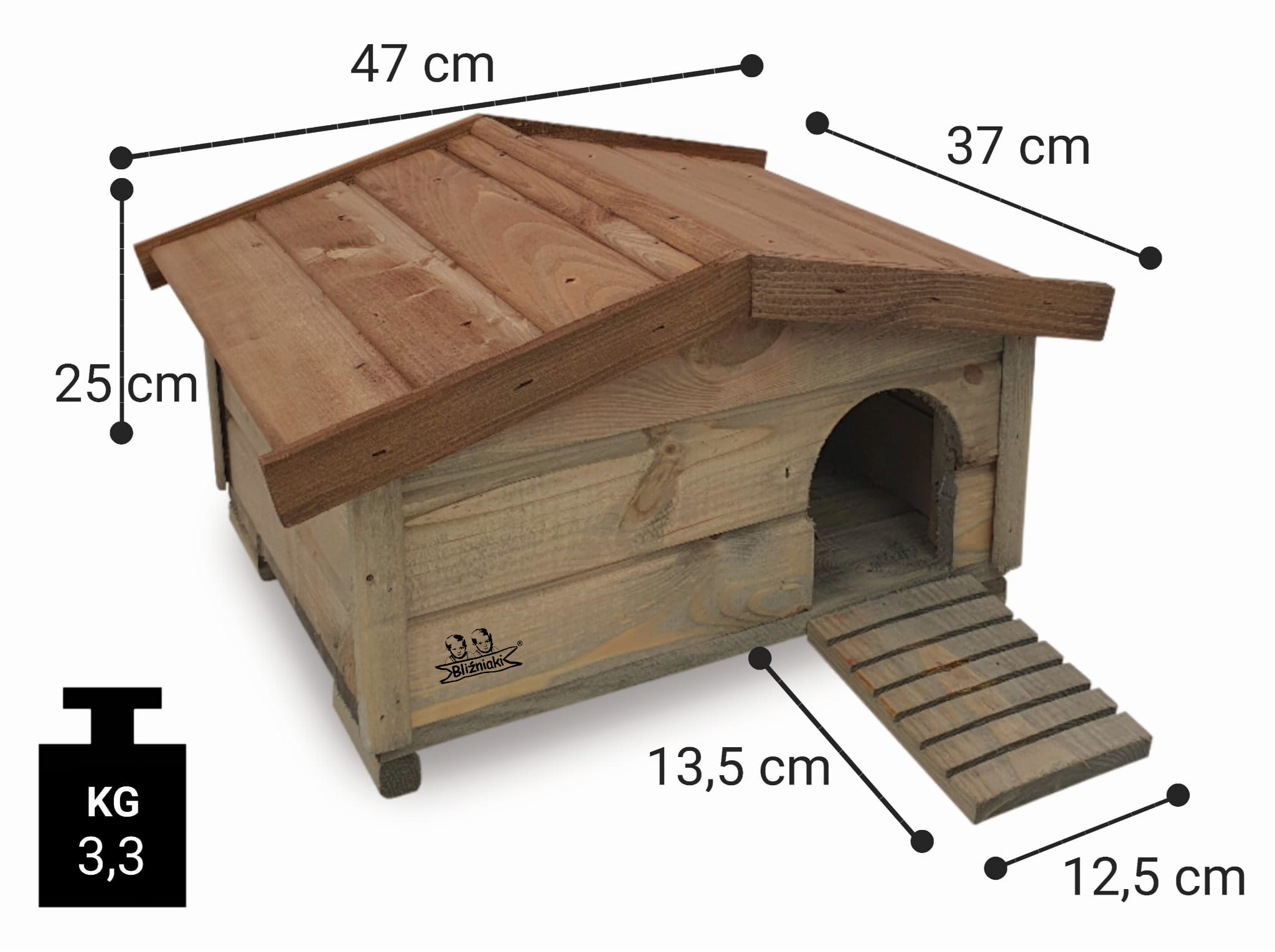Konstrukcja domku jest stabilna, zdejmowany dwuspadowy dach ułatwi czyszczenie wnętrza budki a do środka prowadzi podest ryflowane schodki, ponadto kryta podłoga odizolowuje jeże od mokrego i zimnego podłoża co czyni ten domek komfortowym siedziskiem do lęgu małych jeżyków.