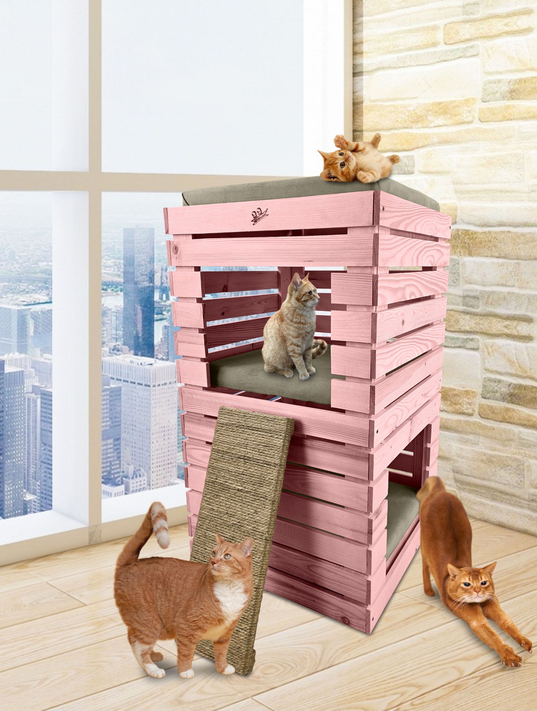 Trzy niezależne legowiska to rozwiązanie, które gwarantuje każdemu kotu prywatność i wygodę. Konstrukcja domku pozwala na przebywanie w nim kilku kotów na trzech poziomach.