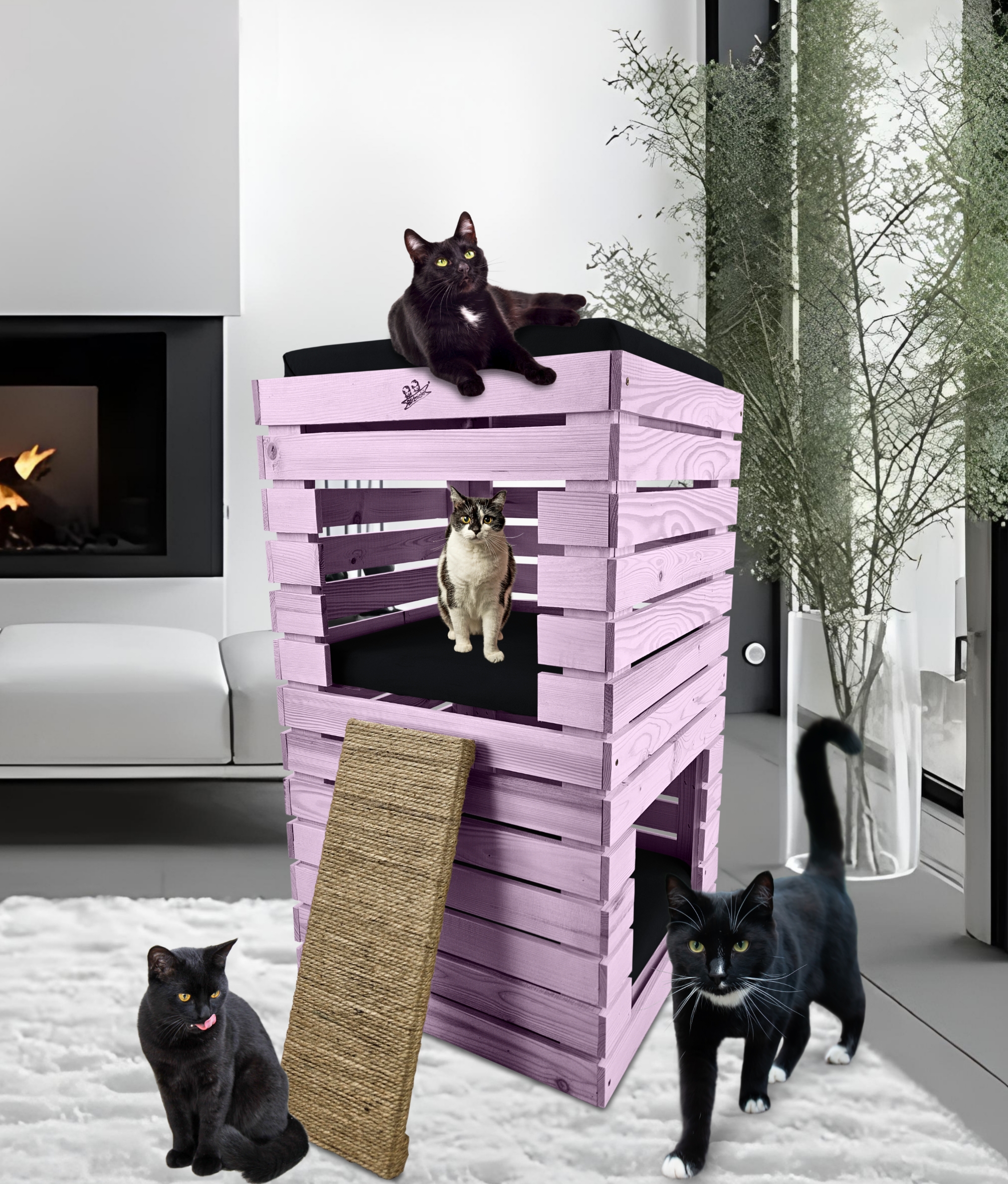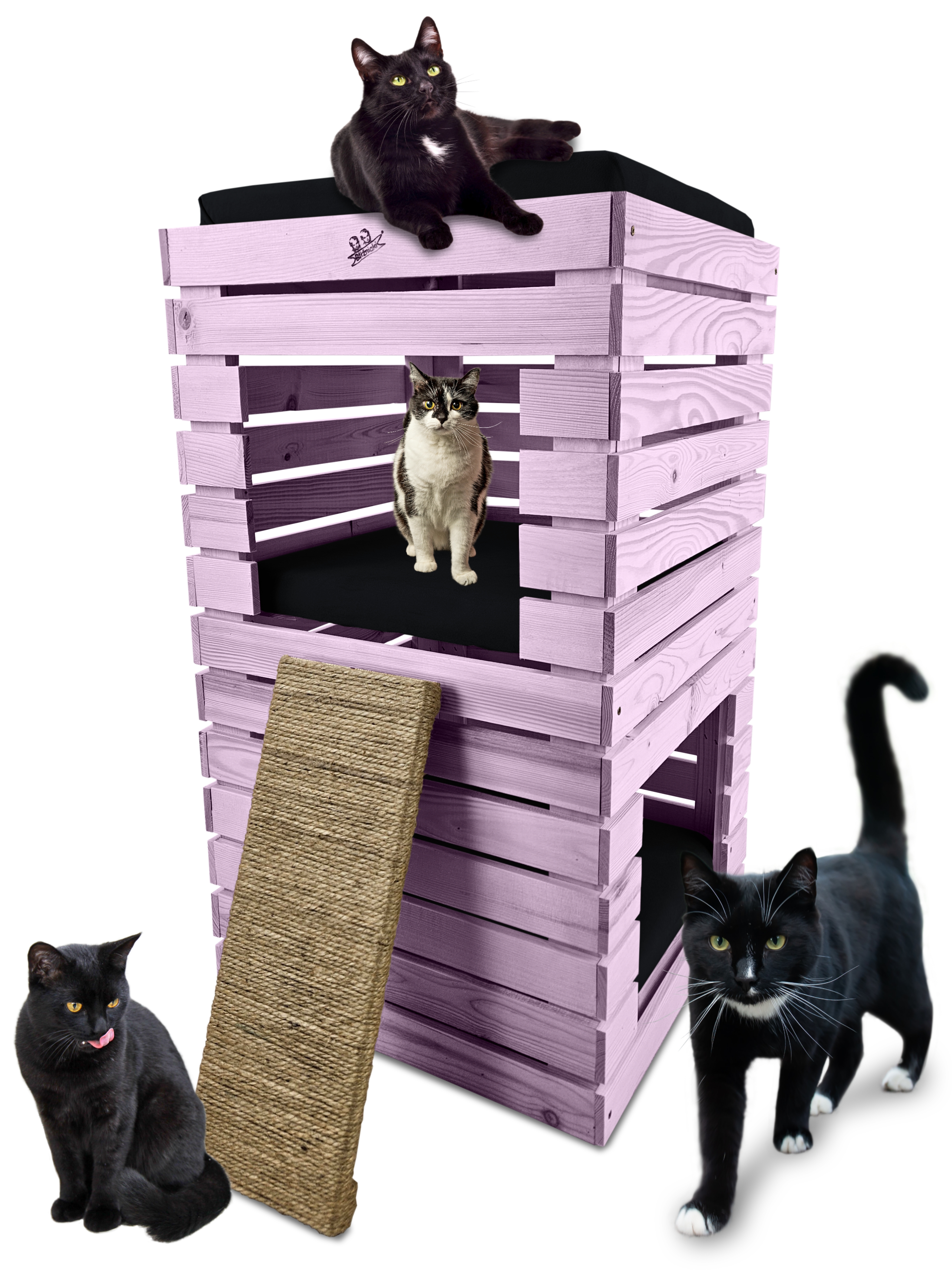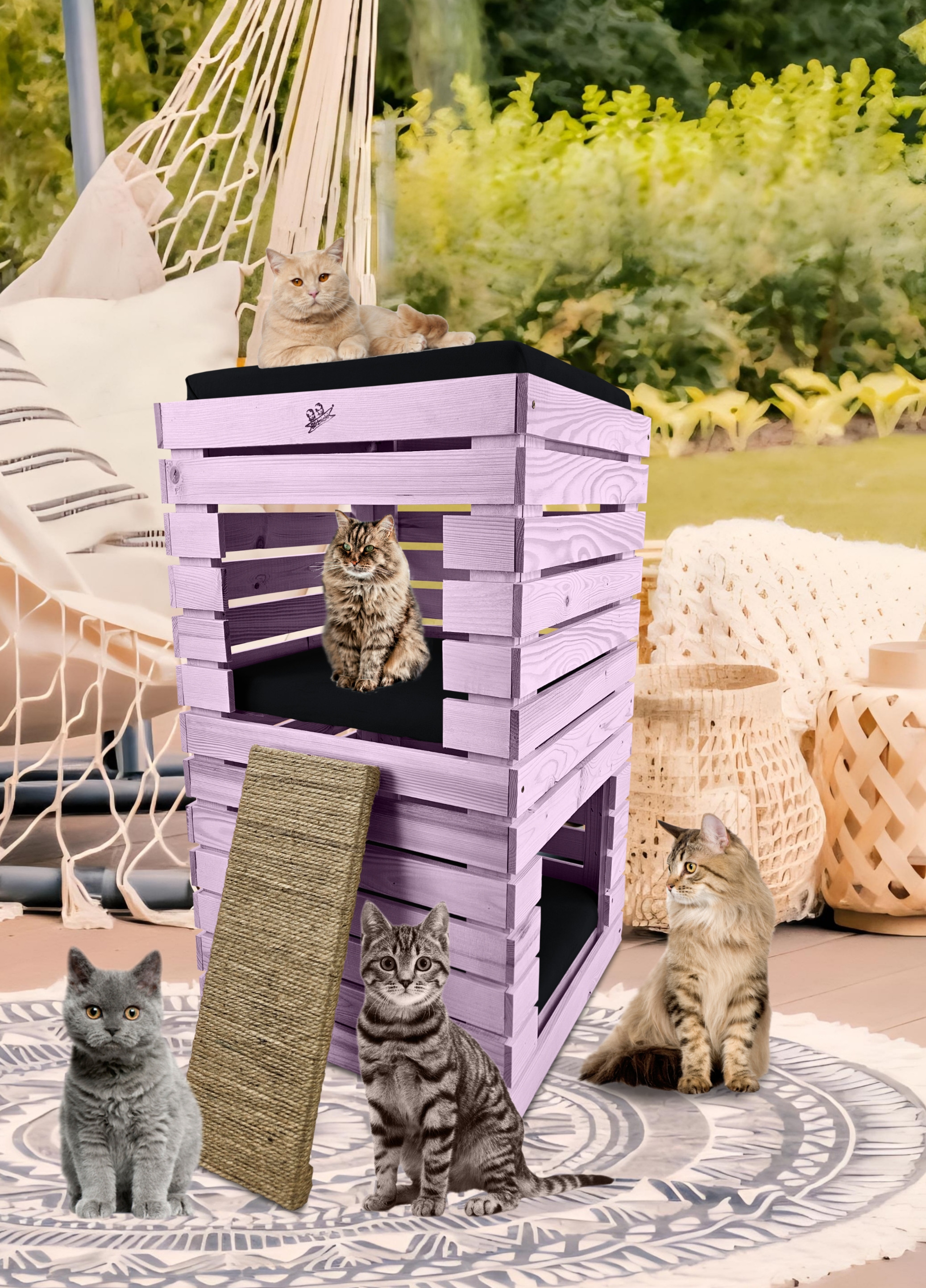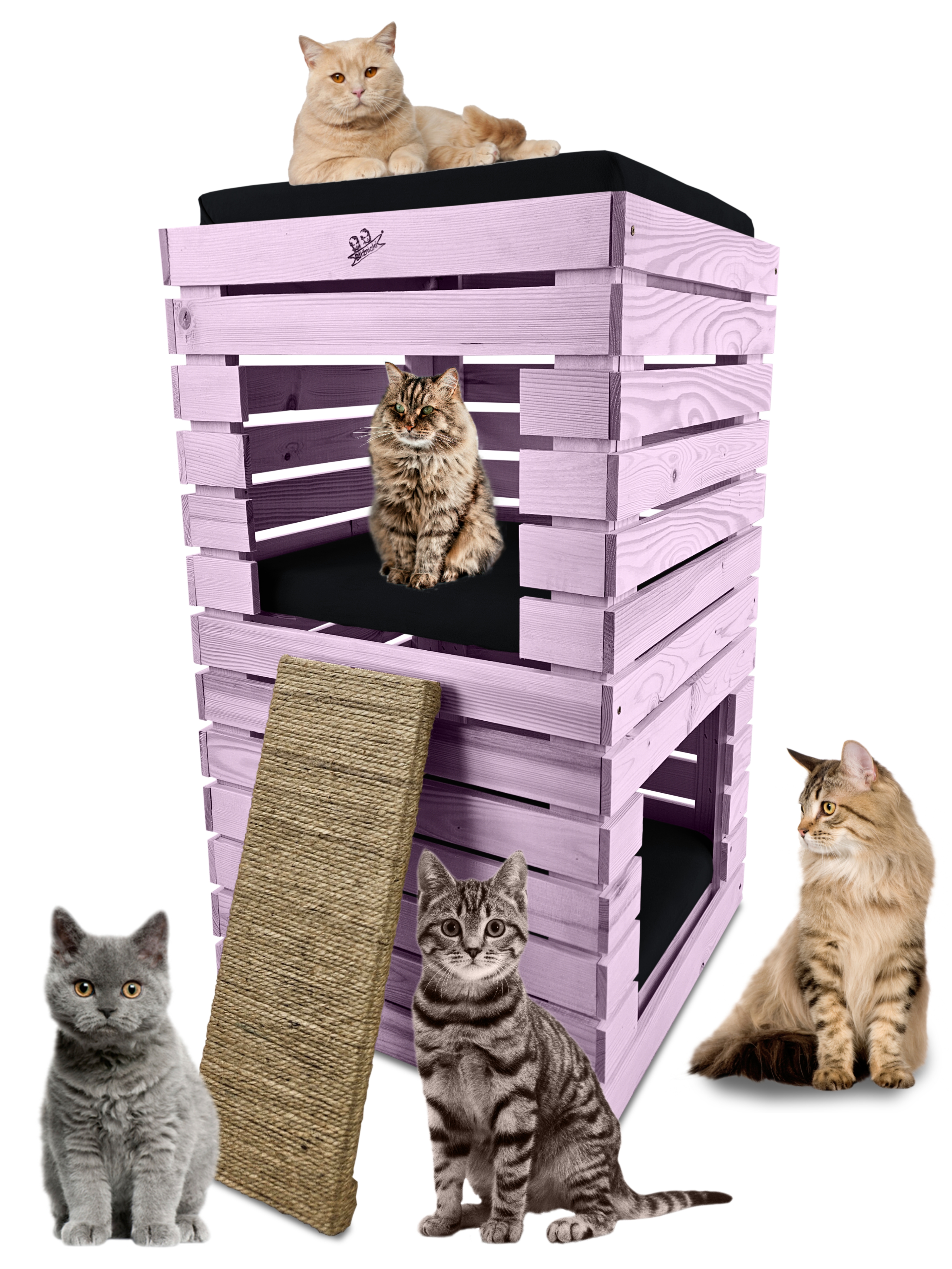 Trzy niezależne legowiska to rozwiązanie, które gwarantuje każdemu kotu prywatność i wygodę. Konstrukcja domku pozwala na przebywanie w nim kilku kotów na trzech poziomach.