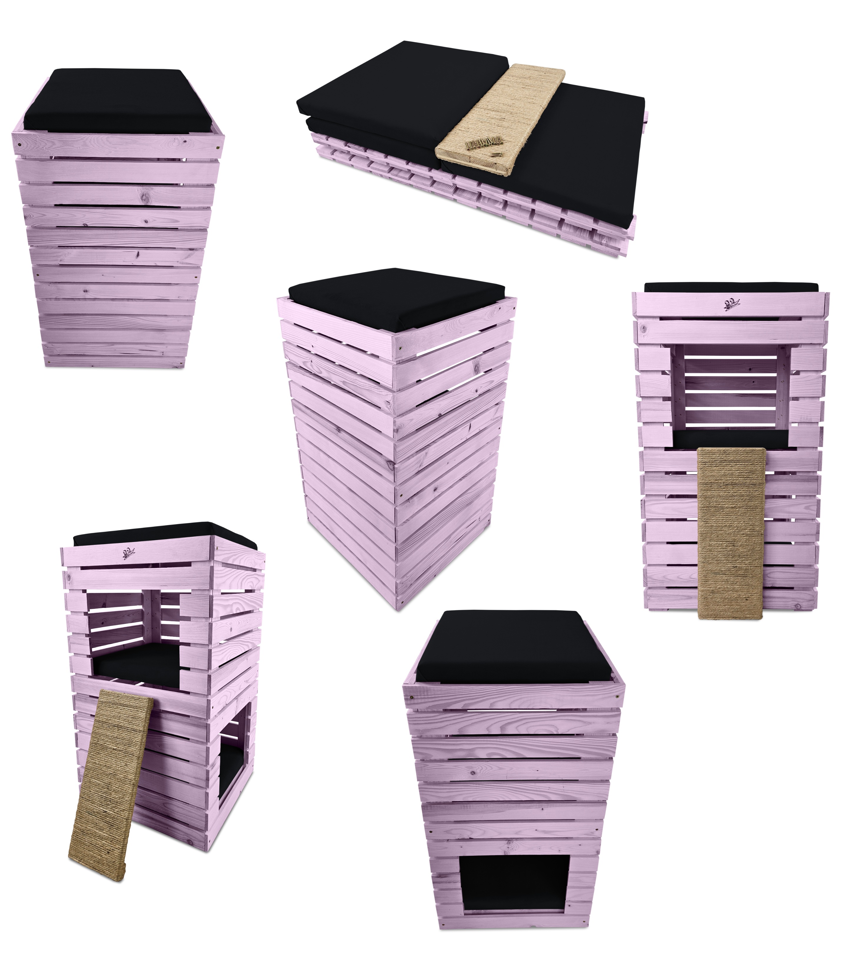 Budka, wykonana w całości z drewna, zachwyca swoją estetyką i naturalnością. Kolor JASNOFIOLETOWY harmonijnie współgra z posłaniem w kolorze CZARNYM tworząc kompozycję, która pasuje zarówno do wnętrza mieszkania, jak i ogrodu.