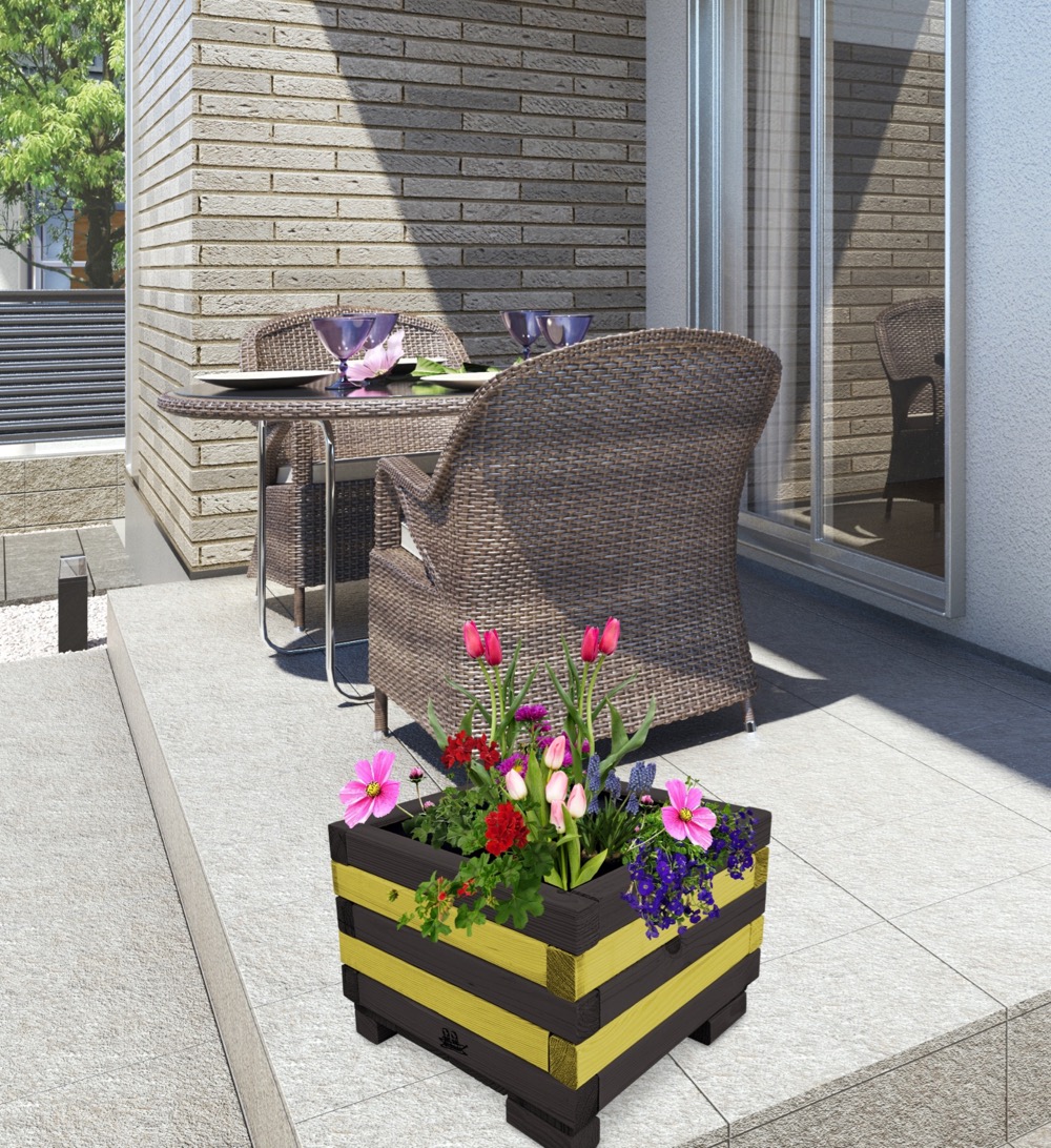 Donica wykonana została w całości z impregnowanego ekologicznie drewna. Dzięki temu uzyskała trwałość i odporność na szkodliwe działanie wody oraz wilgoci, promieni UV, grzybów i pleśni. Wewnątrz wyłożona jest specjalną folią, która nie tylko ochrania drewno, ale również zapewnia utrzymanie wilgotnego podłoża jednocześnie umożliwiając swobodny rozwój roślin.