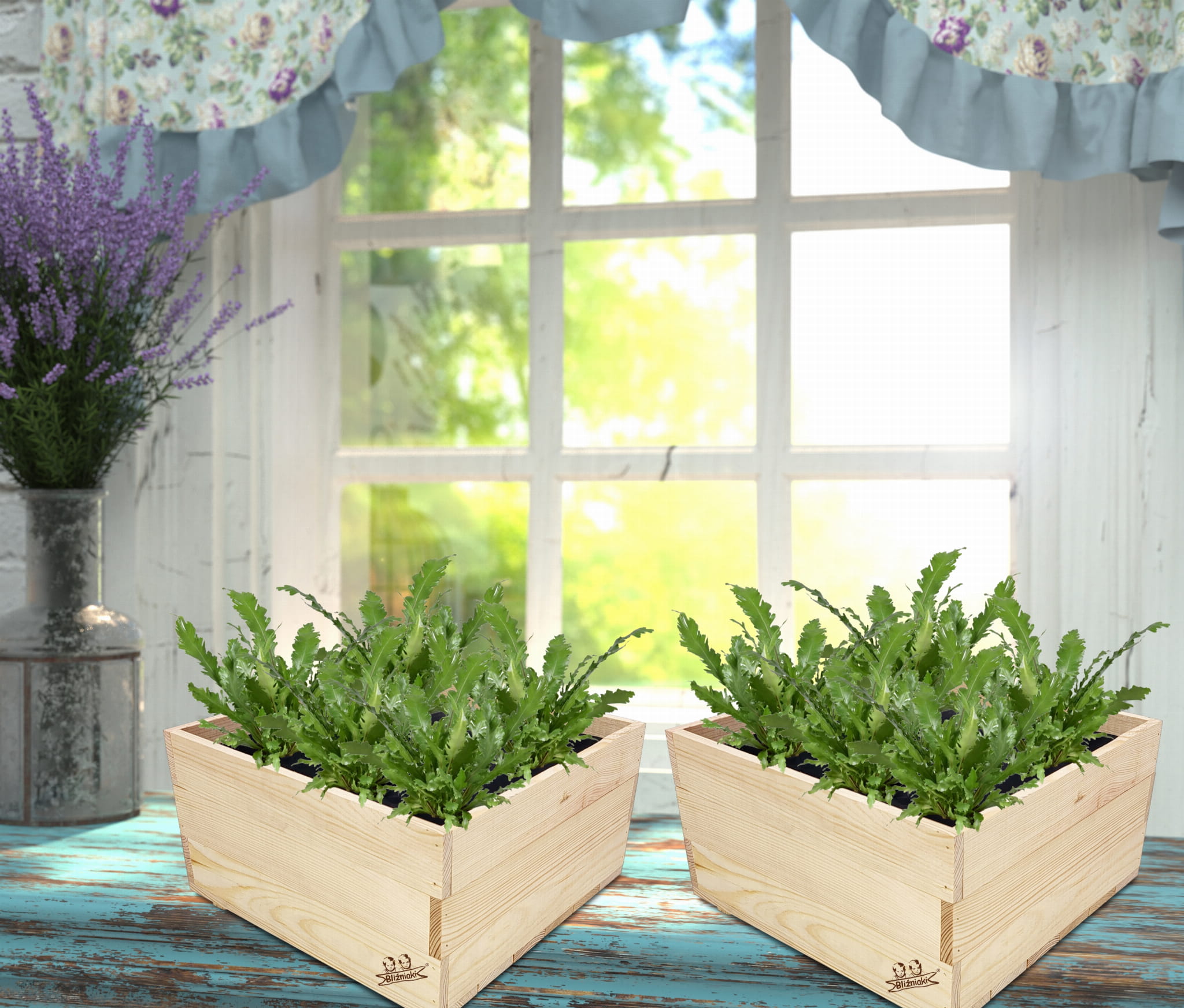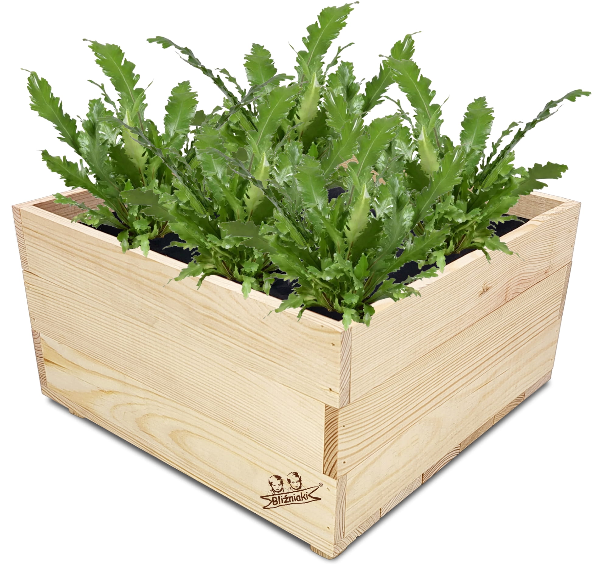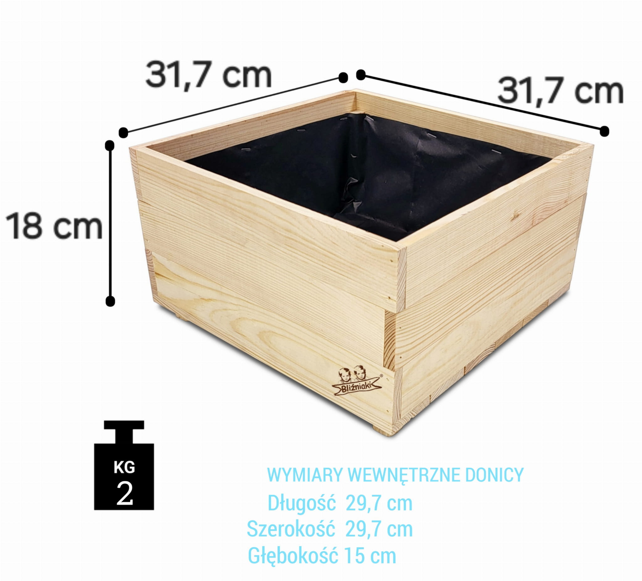 Nasza kwadratowa donica wykonana z najwyższej jakości suszonego drewna sosnowego, zabezpieczona została folią doniczkową, która utrzymuje wilgotność podłoża i umożliwia swobodny rozwój roślin. Dodatkowo donica posiada nóżki, które izolują ją od podłoża, chroniąc drewno przed wilgocią i innymi czynnikami zewnętrznymi.