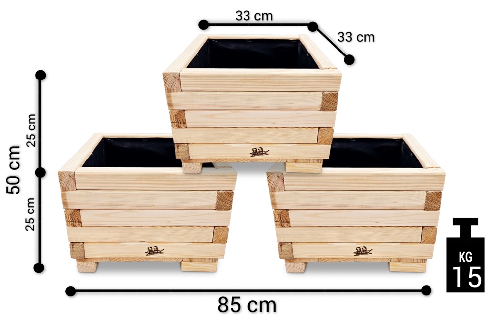 Kwietniki piętrowe kaskady wykonane są z trzech kwadratowych doniczek drewnianych. Każda z nich wewnątrz jest wyłożona specjalną folią, która nie tylko ochrania drewno, ale również zapewnia utrzymanie wilgotnego podłoża jednocześnie umożliwiając swobodny rozwój roślin.