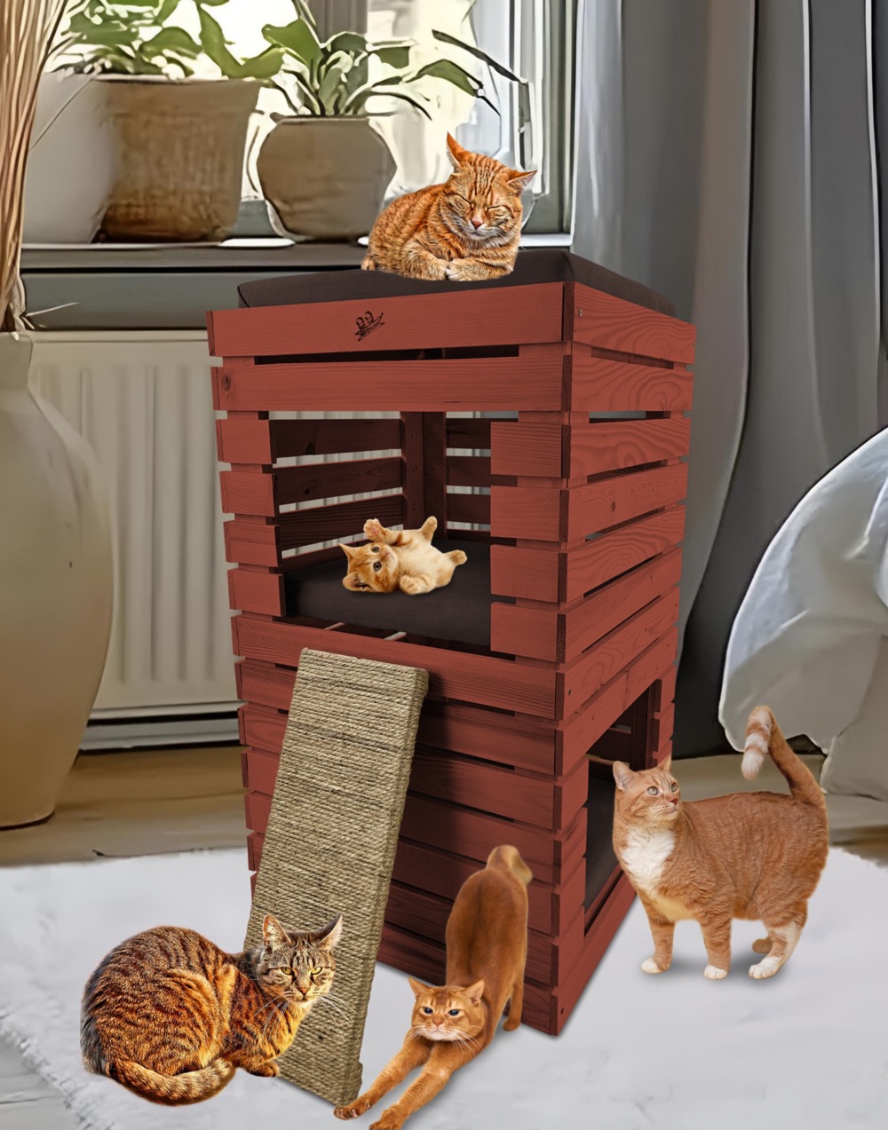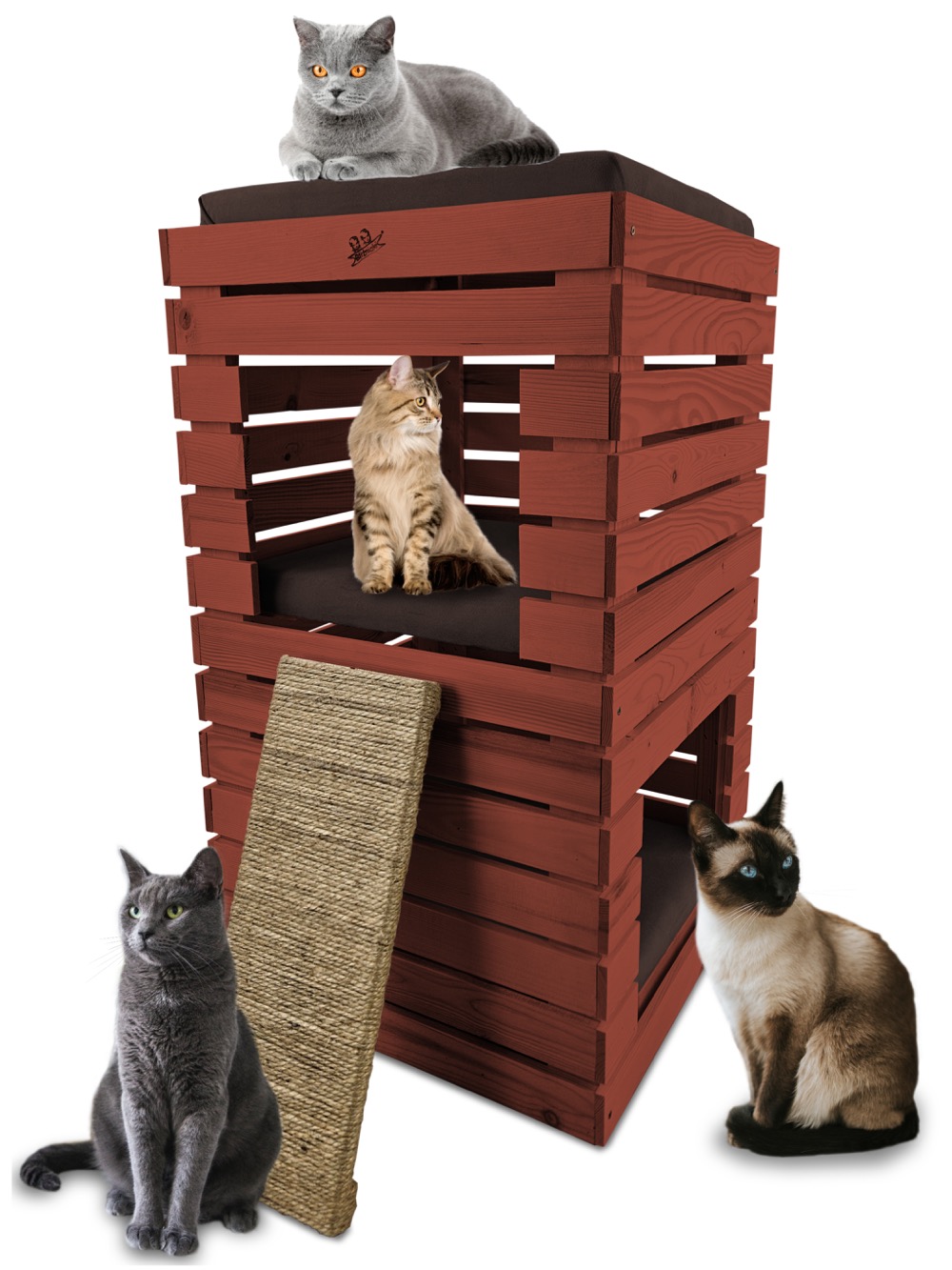 DREWNIANY DOMEK DLA KOTA Z TRZEMA LEGOWISKAMI