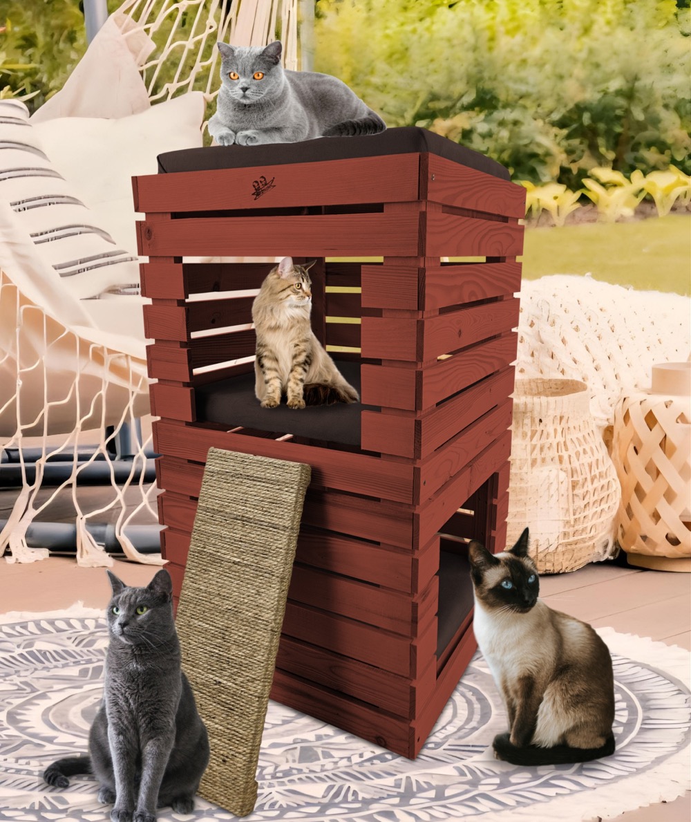 Trzy niezależne legowiska to rozwiązanie, które gwarantuje każdemu kotu prywatność i wygodę. Konstrukcja domku pozwala na przebywanie w nim kilku kotów na trzech poziomach.