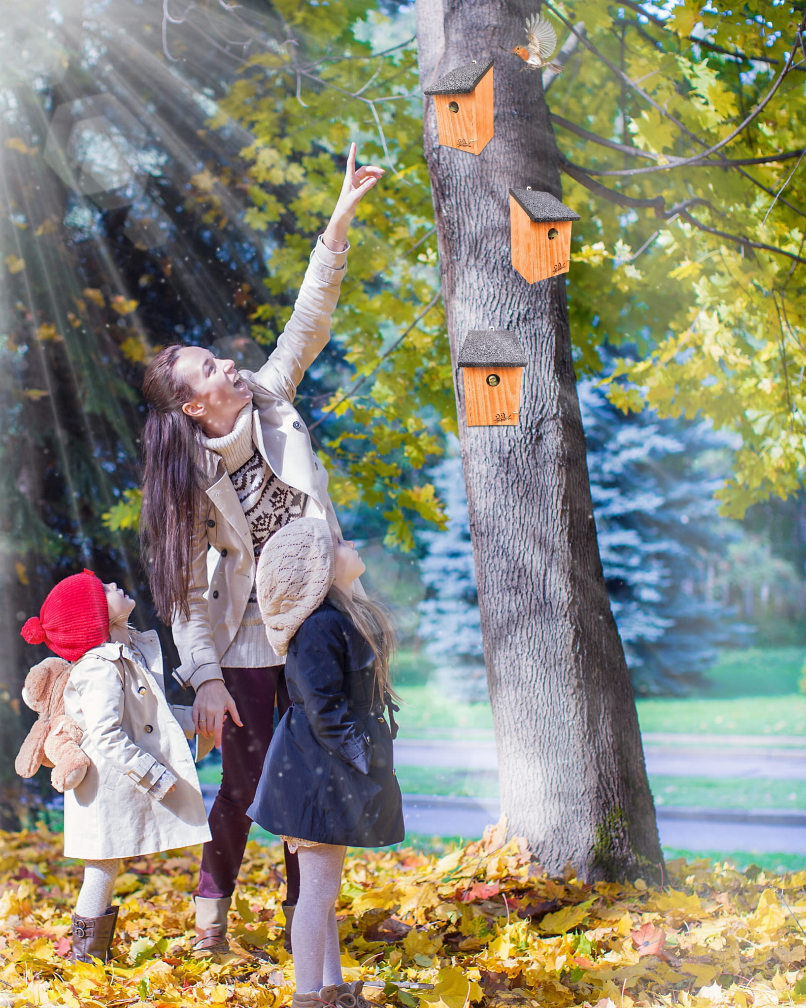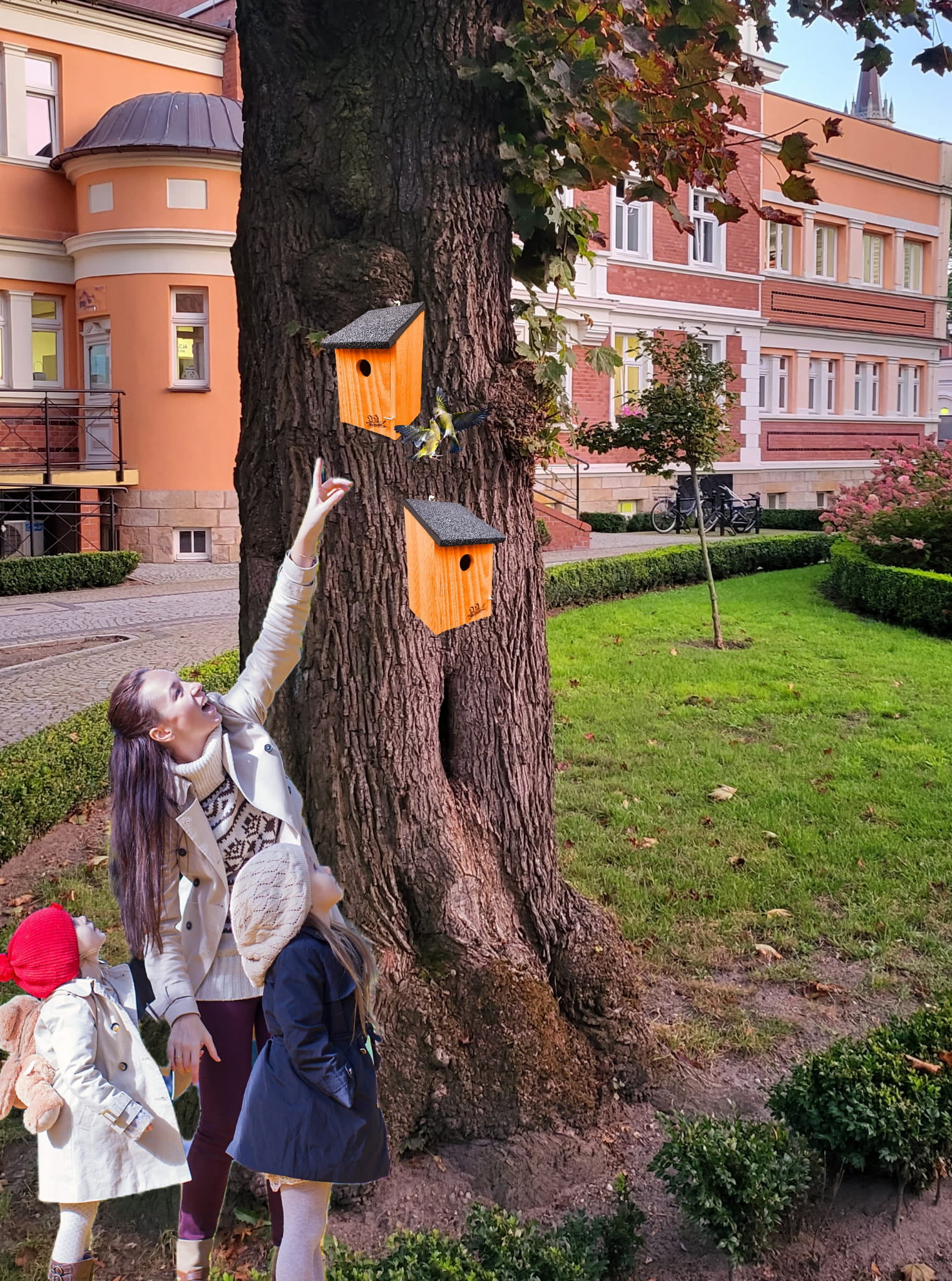 Budki lęgowe, które imitują dziuplę w drzewie warto umieścić w miejscu zacienionym, spokojnym, w odległości ok. 2 m od siebie.