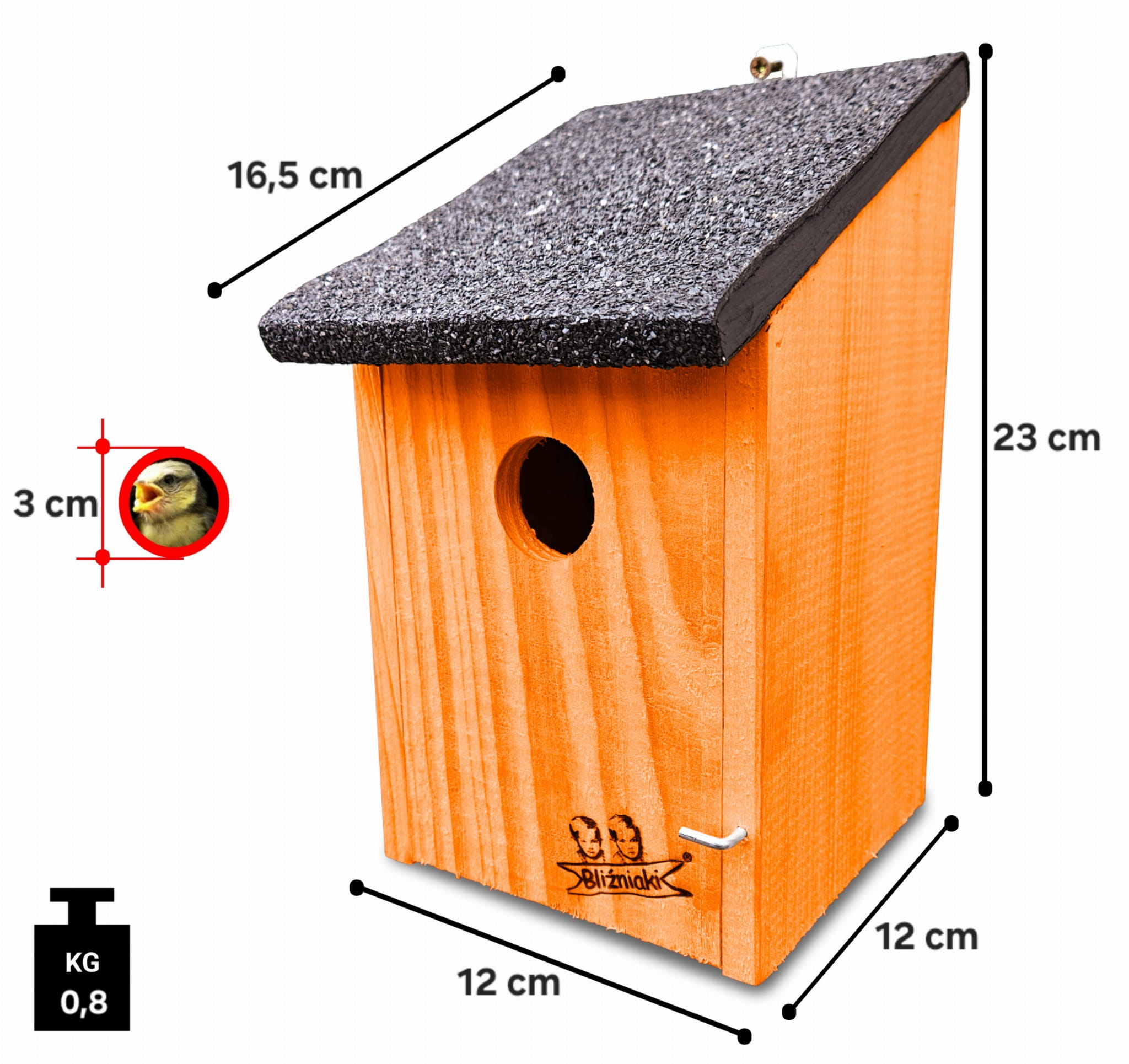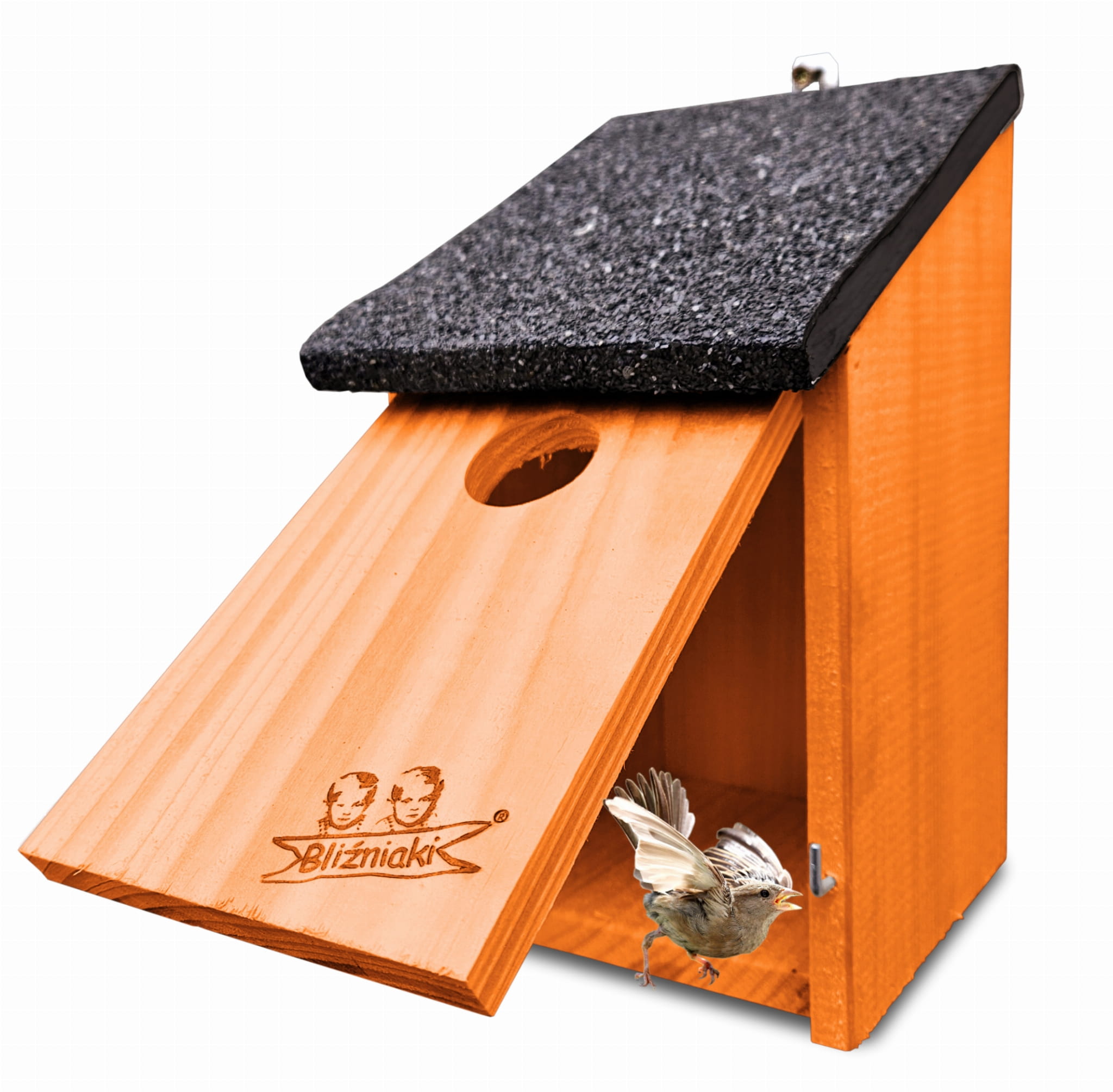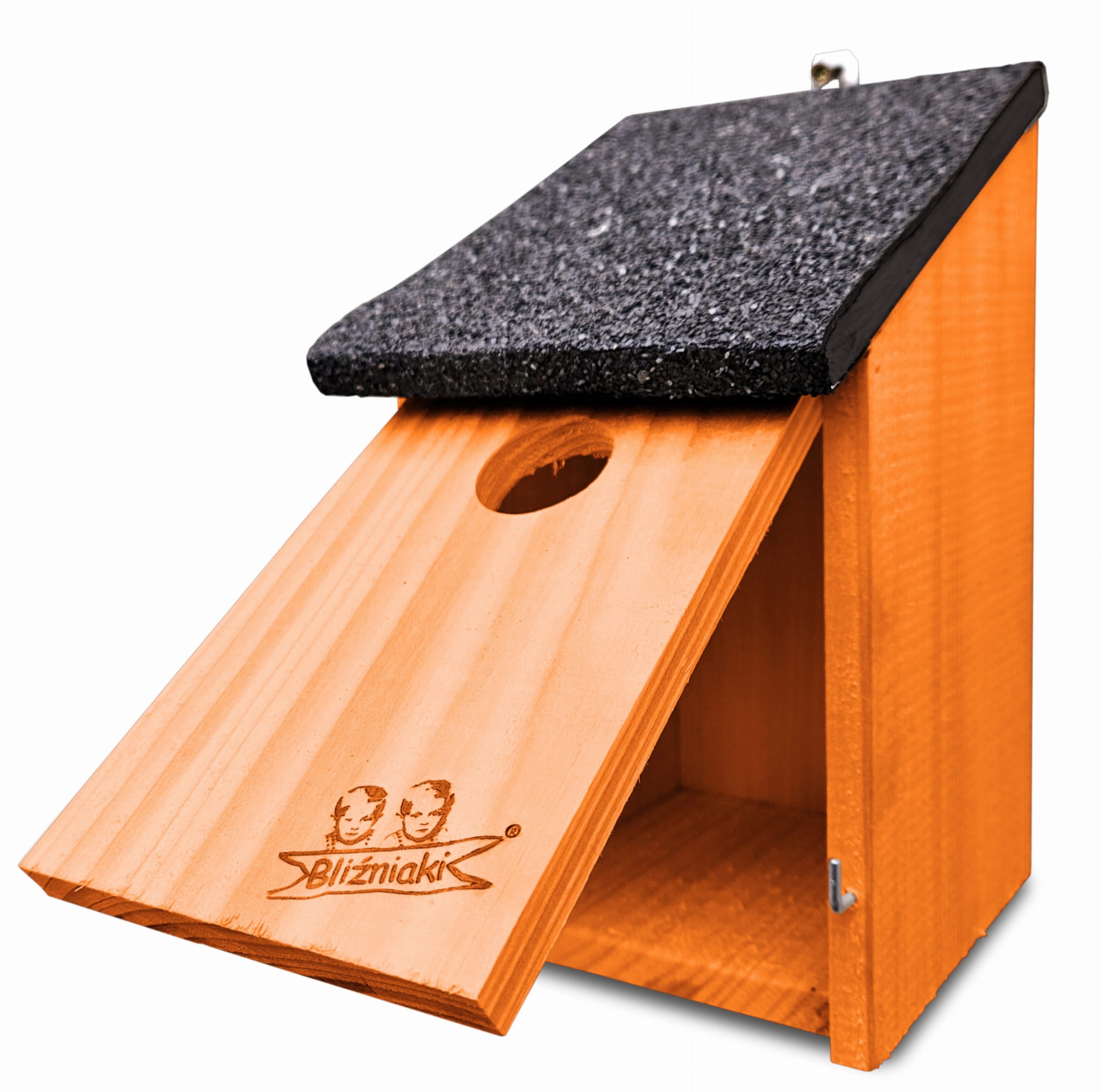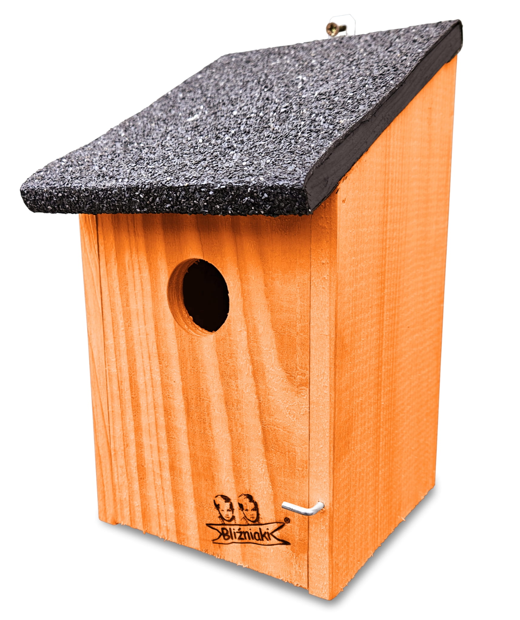 Solidna konstrukcja: wykonane z najwyższej jakości materiałów, nasze budki są odporne na warunki atmosferyczne. Skrzynki posiadają wlot o średnicy 30 mm, otwieraną przednią ścianę oraz dach kryty papą bitumiczną.